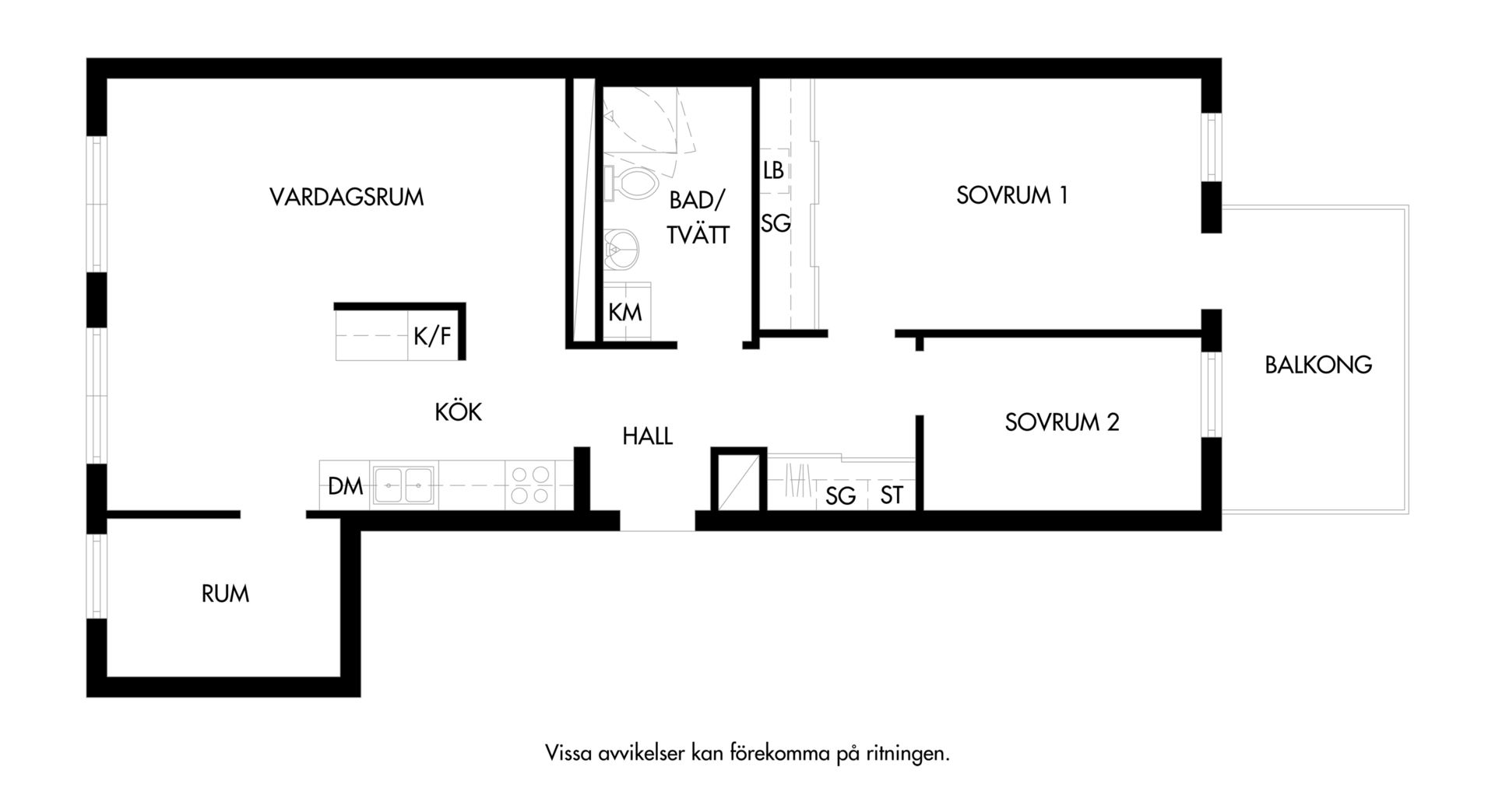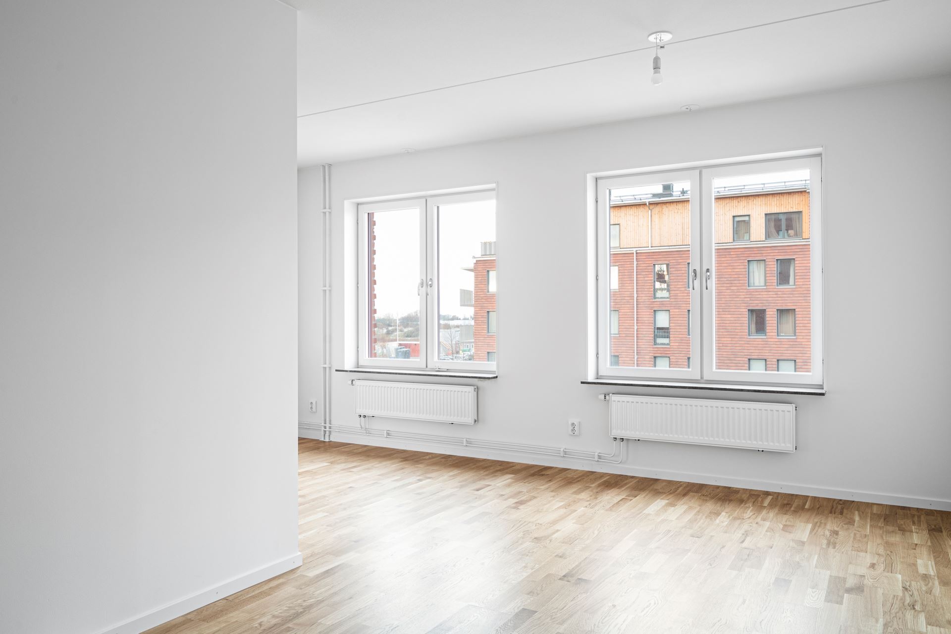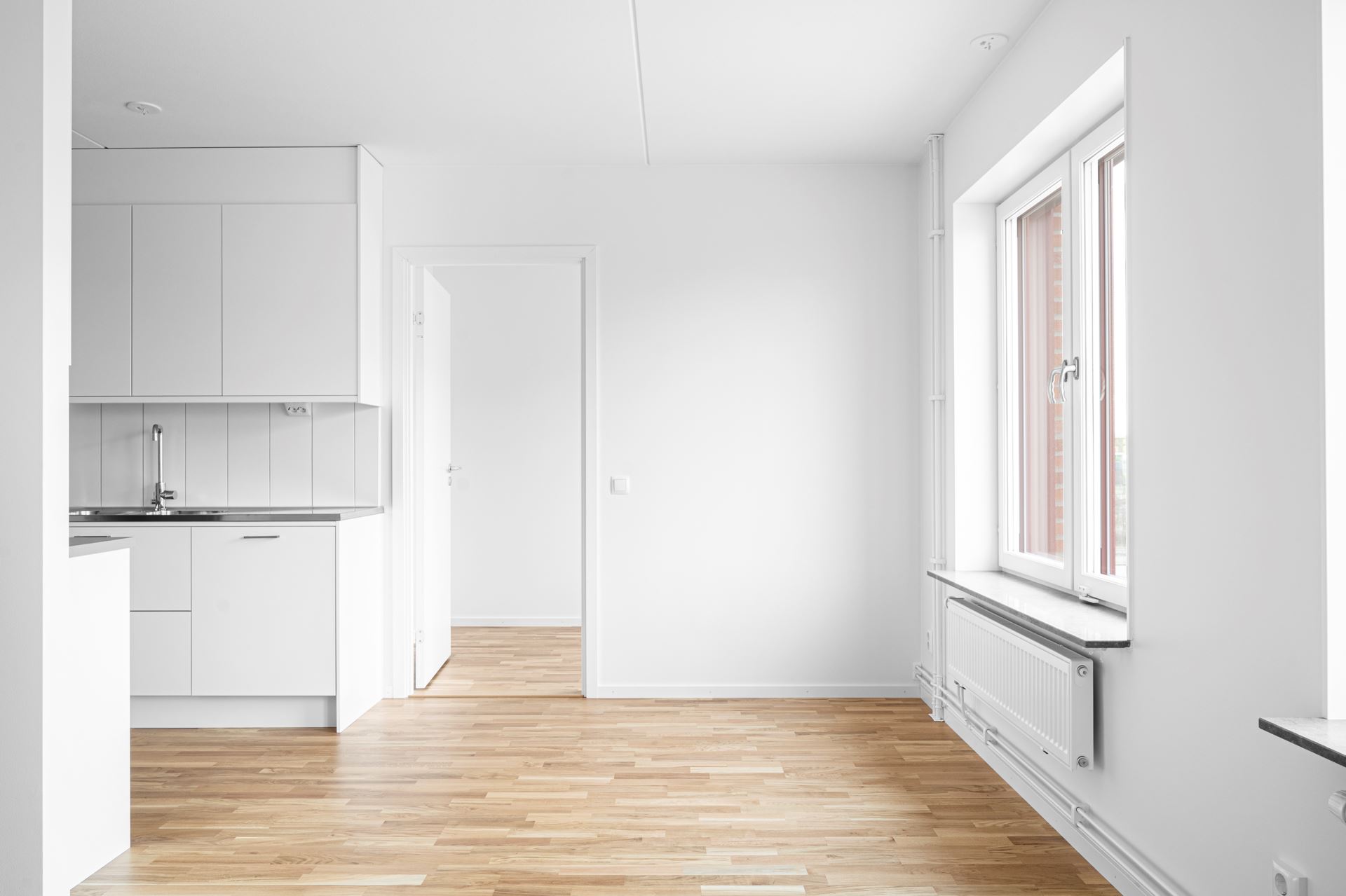 Vidare öppnar lägenheten upp med öppen planlösning mellan kök och vardagsrum. Härligt ljusinsläpp i rummet i kombination med optimalt planerade kvadratmeter. Vardagsrummet kan enkelt möbleras med soffgrupp och matbord mot köksdelen. Praktisk vägg bakom kyl/frys skärmar av kök och vardagsrum men ändå bibehålls den luftiga känslan och öppna planlösningen.