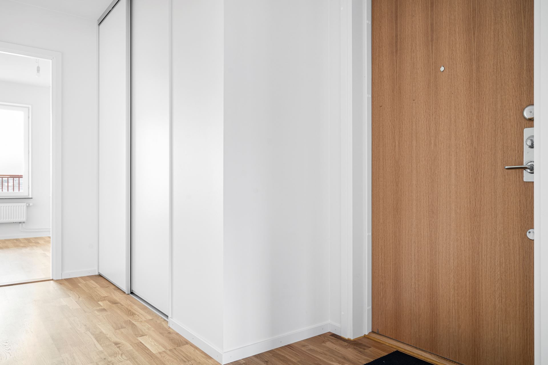 Hallen välkomnar med mattlackad ekparkett (trestavs) på golv tillsammans med släta vita väggar, vilket är genomgående i hela lägenheten. Vidare in på höger sida i hallen finns praktisk förvaring bakom skjutörrsgarderob.