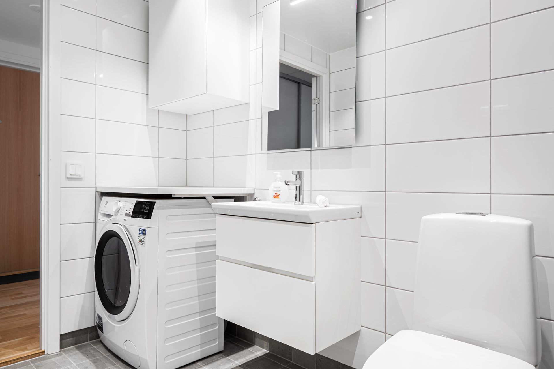 Master bedroom ligger på lugnt läge mot gårdssidan och rymmer plats för både dubbelsäng, sängbord och mer därtill. Längst med ena sidan av rummet finns gott om plats till förvaring i skjudörrsgarderoben. Härifrån finns även utgången till den sköna balkongen, belägen i öster och mot gårdssidan.