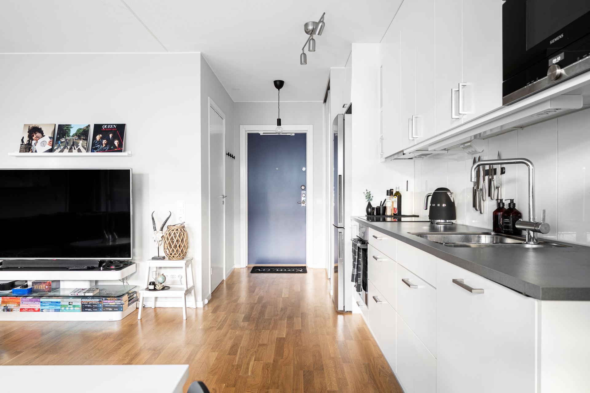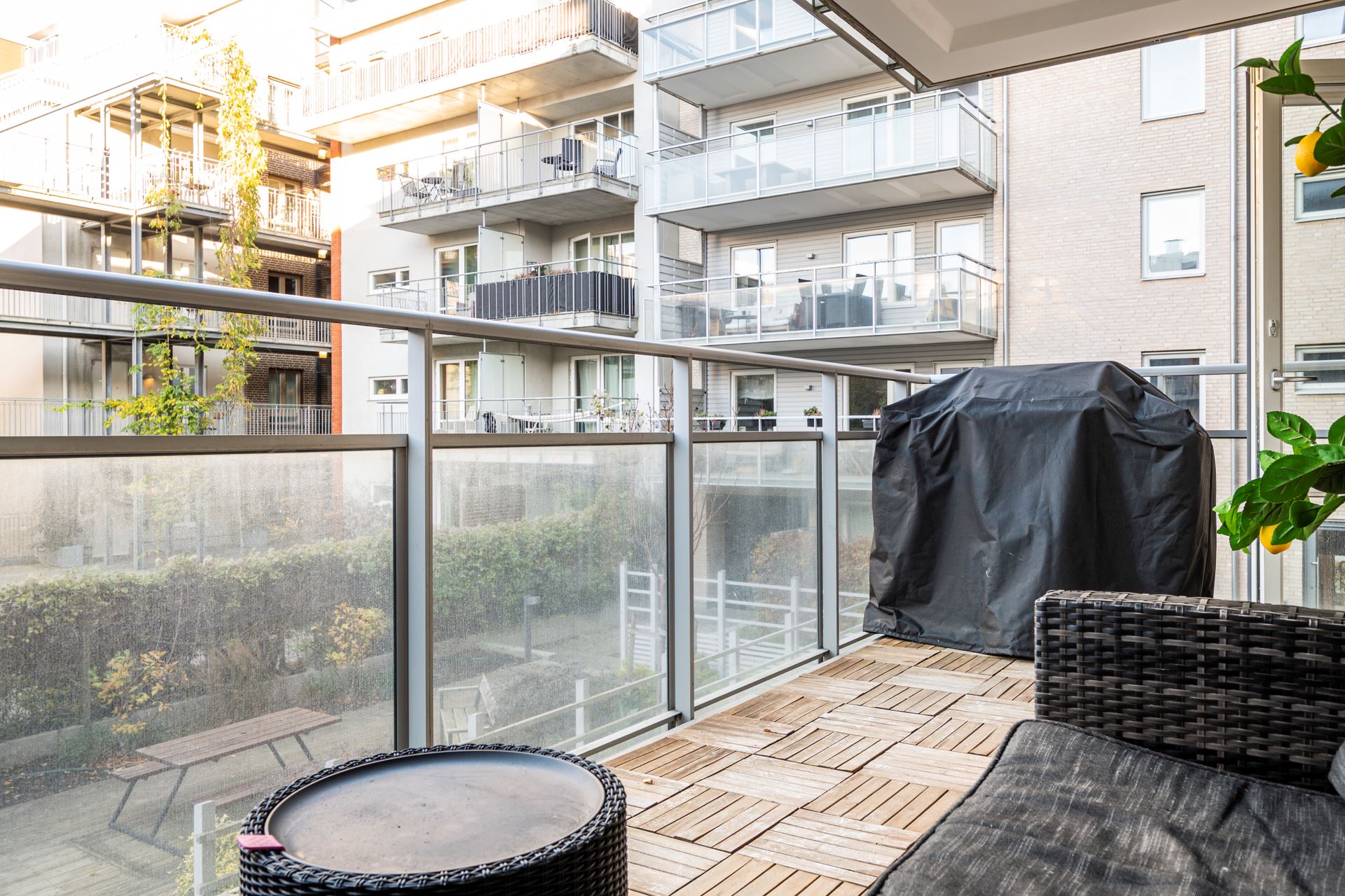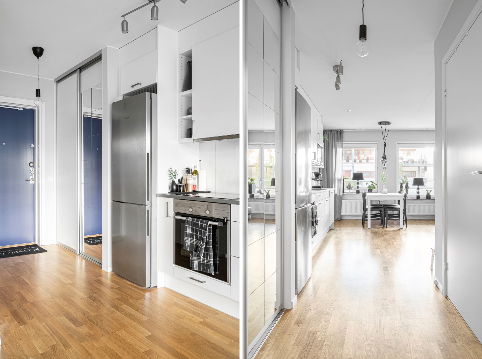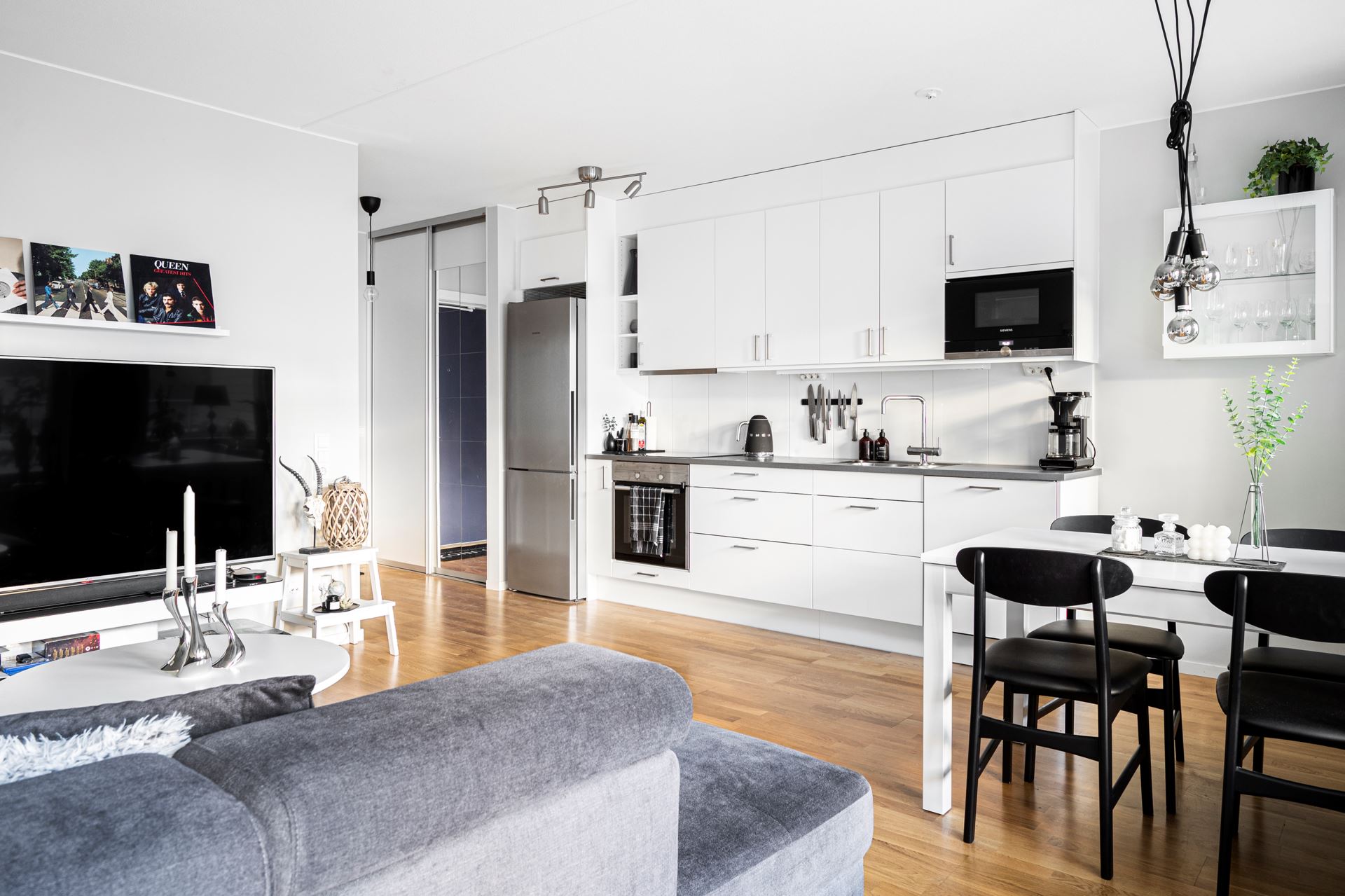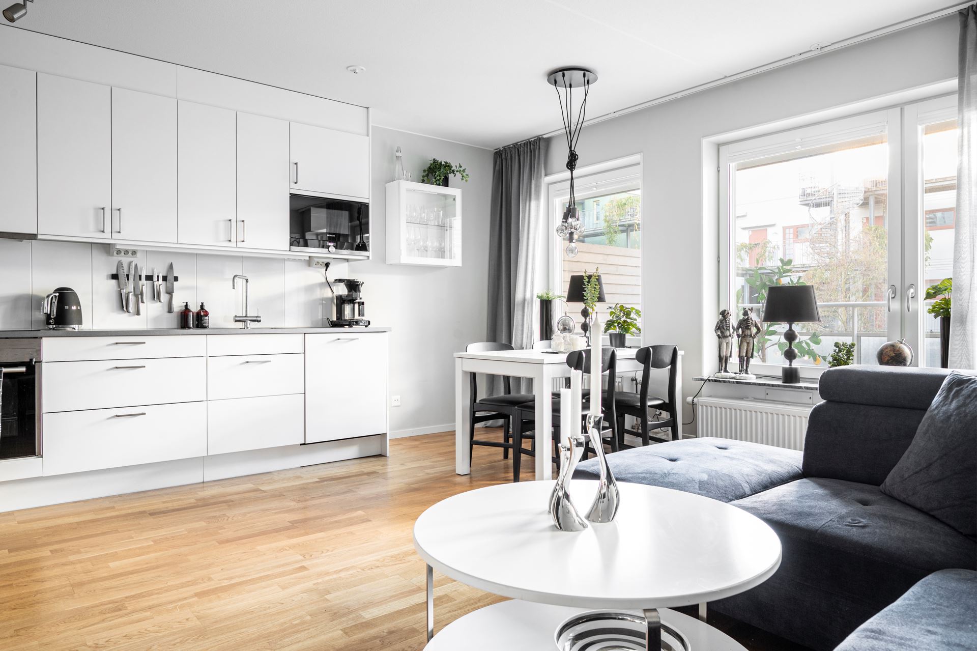 Vidare öppnar lägenheten upp med öppen planlösning mellan kök och vardagsrum. Här erbjuds generösa sällskapsytor med plats för stor soffgrupp, och matbord mot köksdelen. På golvet vilar trestavs ekparkett tillsammans med ljust målade väggar i grå-beige ton. Från vardagsrummet nås dessutom den sköna balkongen belägen på lugnt läge mot gårdssidan. Stor balkong där plats för både matplats och loungegrupp finns.