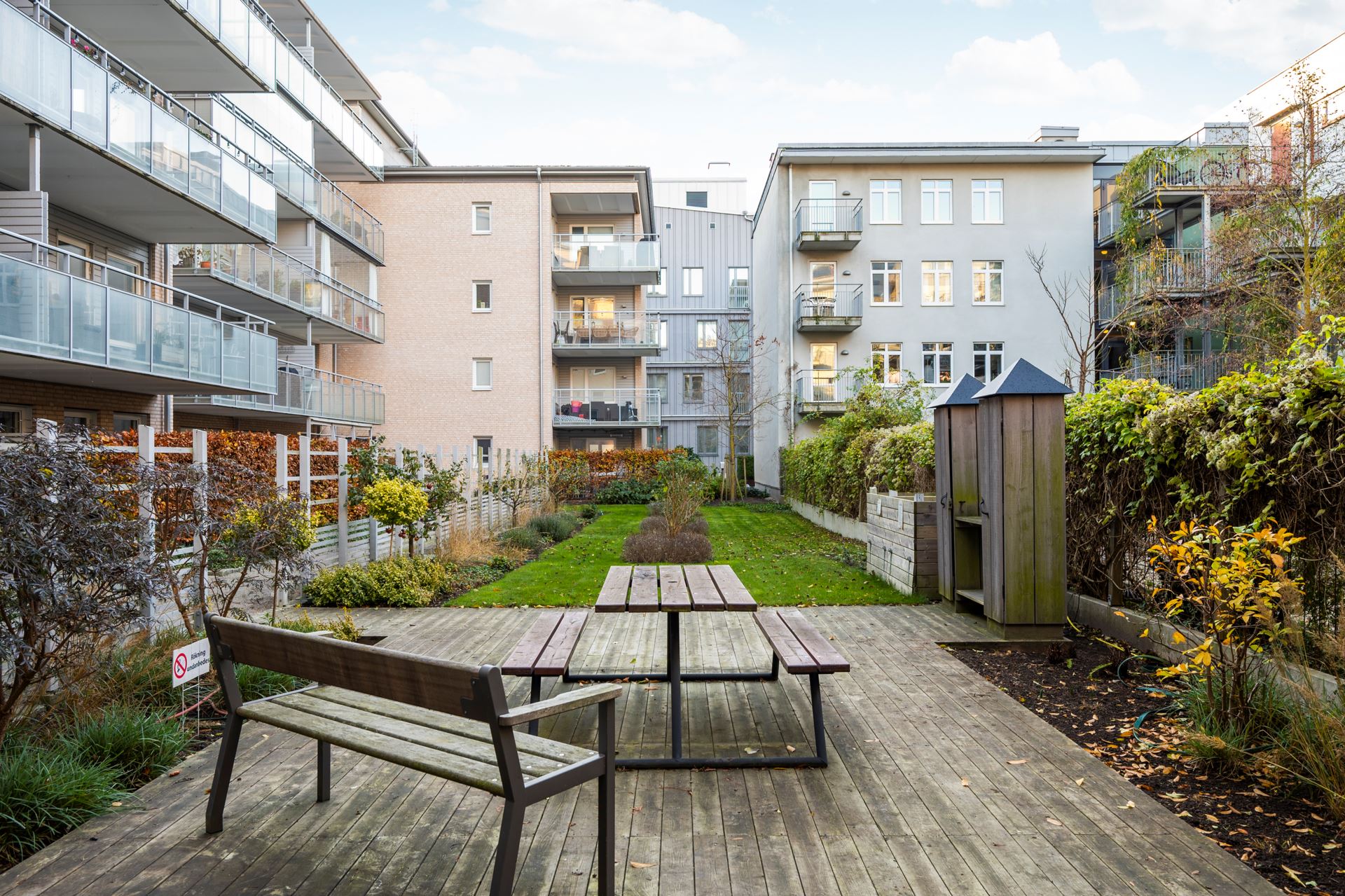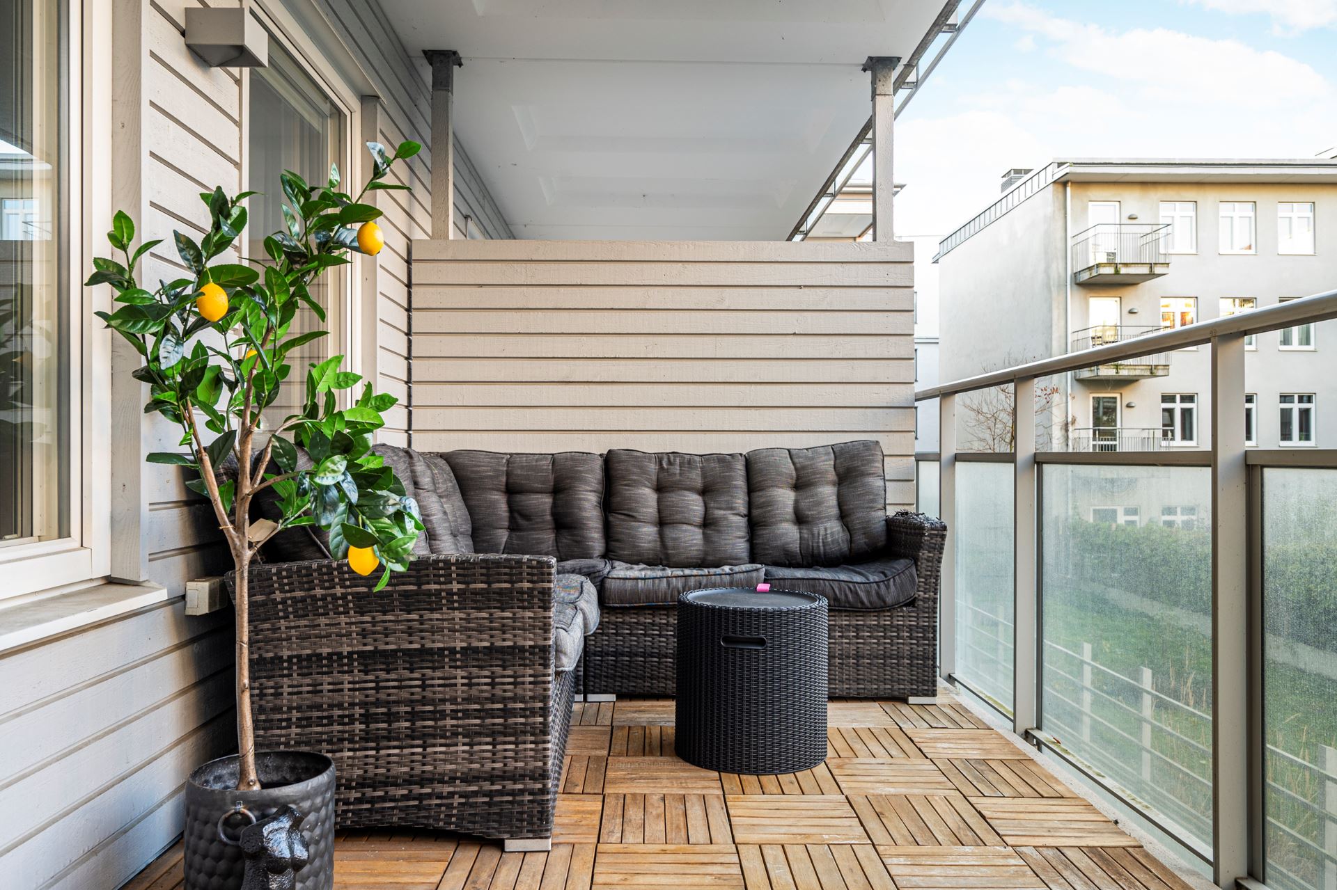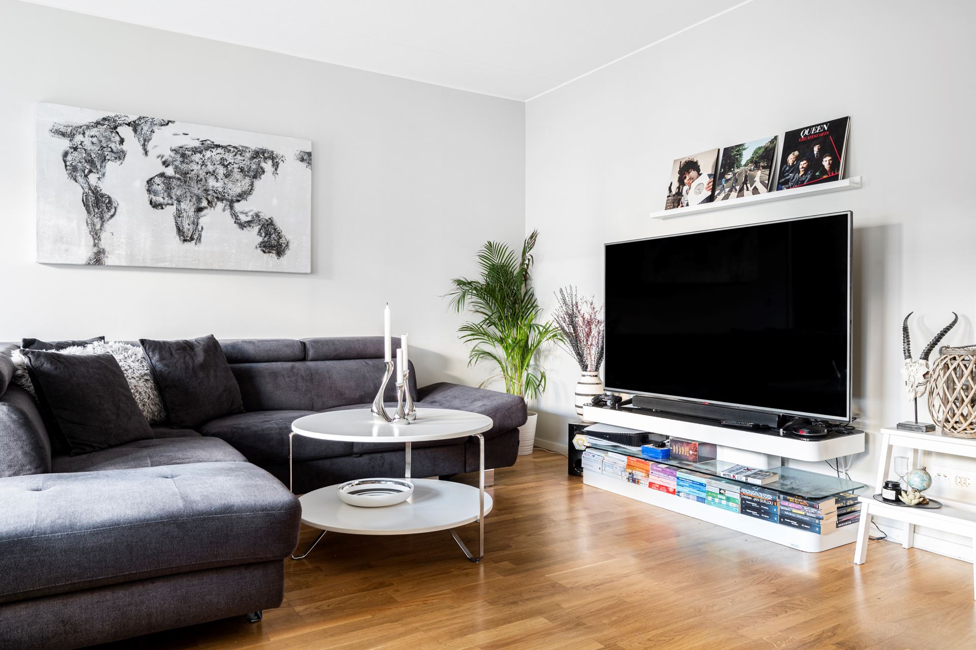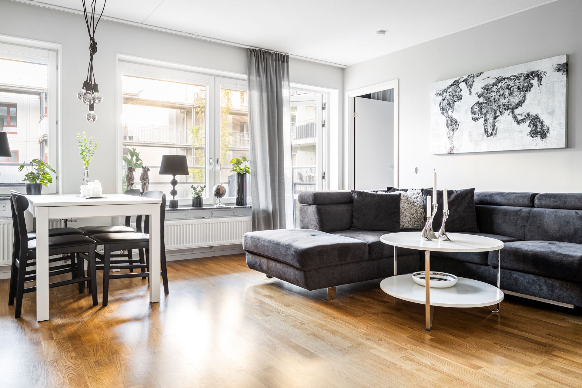 Vidare öppnar lägenheten upp med öppen planlösning mellan kök och vardagsrum. Här erbjuds generösa sällskapsytor med plats för stor soffgrupp, och matbord mot köksdelen. På golvet vilar trestavs ekparkett tillsammans med ljust målade väggar i grå-beige ton. Från vardagsrummet nås dessutom den sköna balkongen belägen på lugnt läge mot gårdssidan. Stor balkong där plats för både matplats och loungegrupp finns.