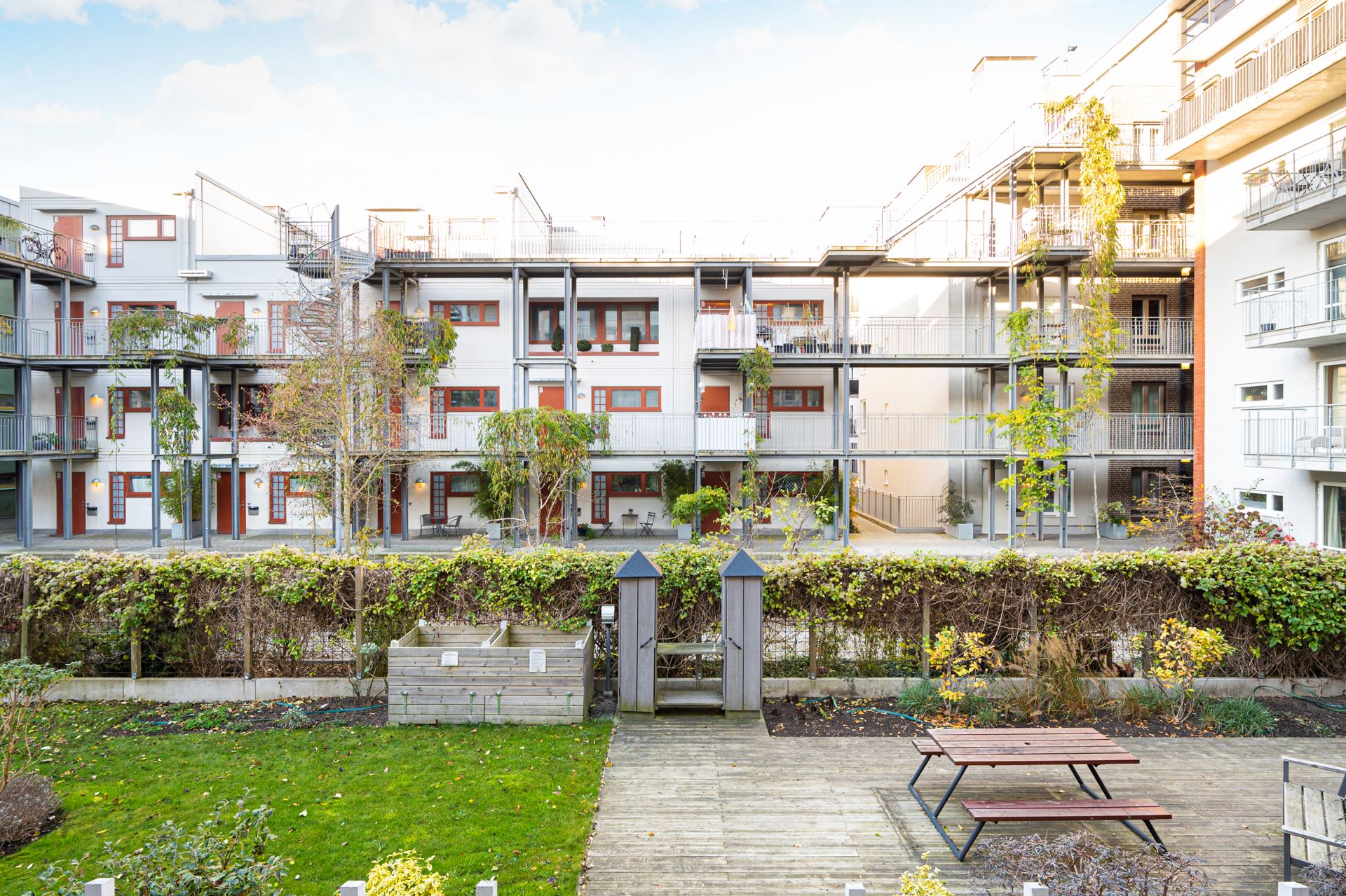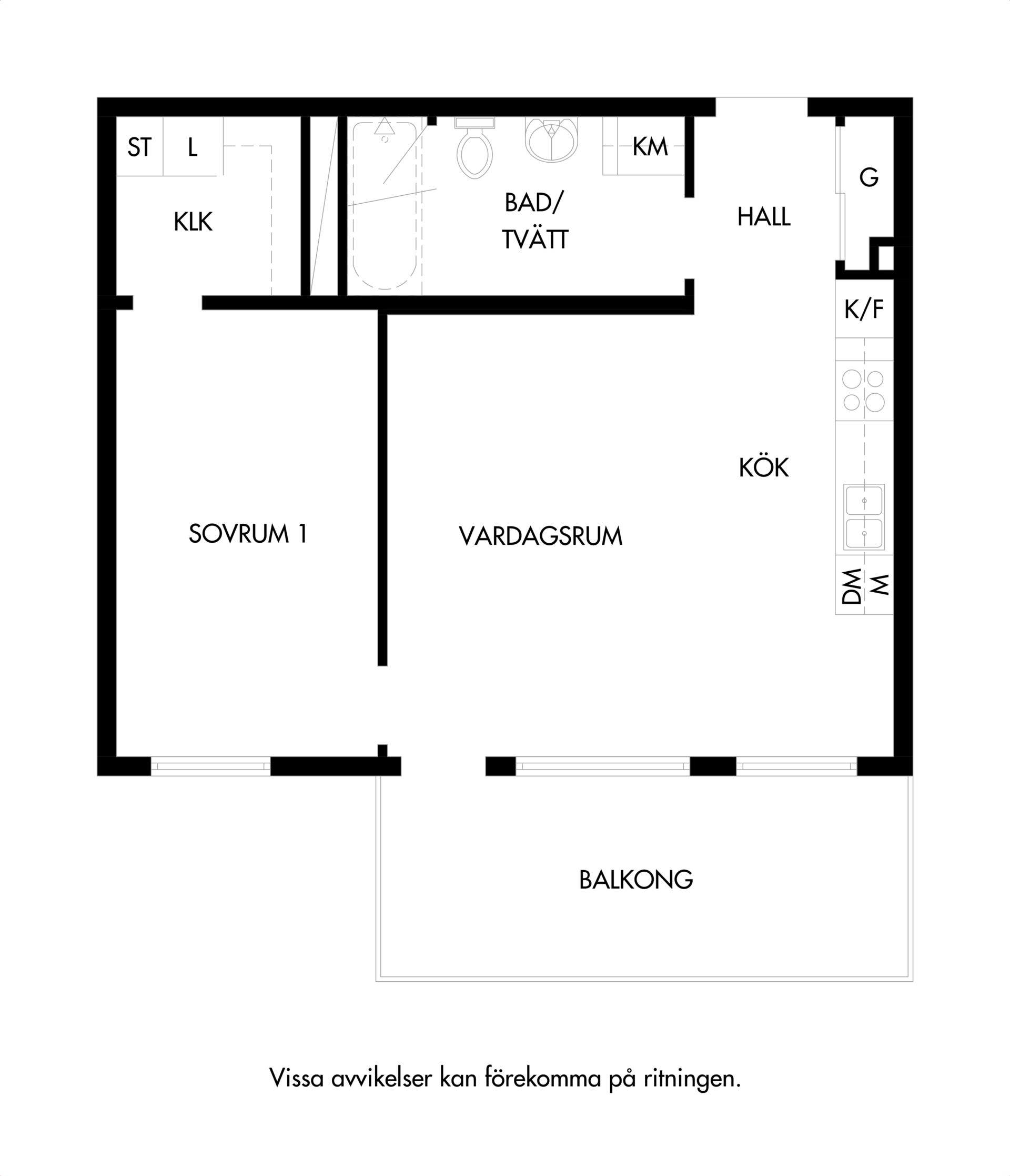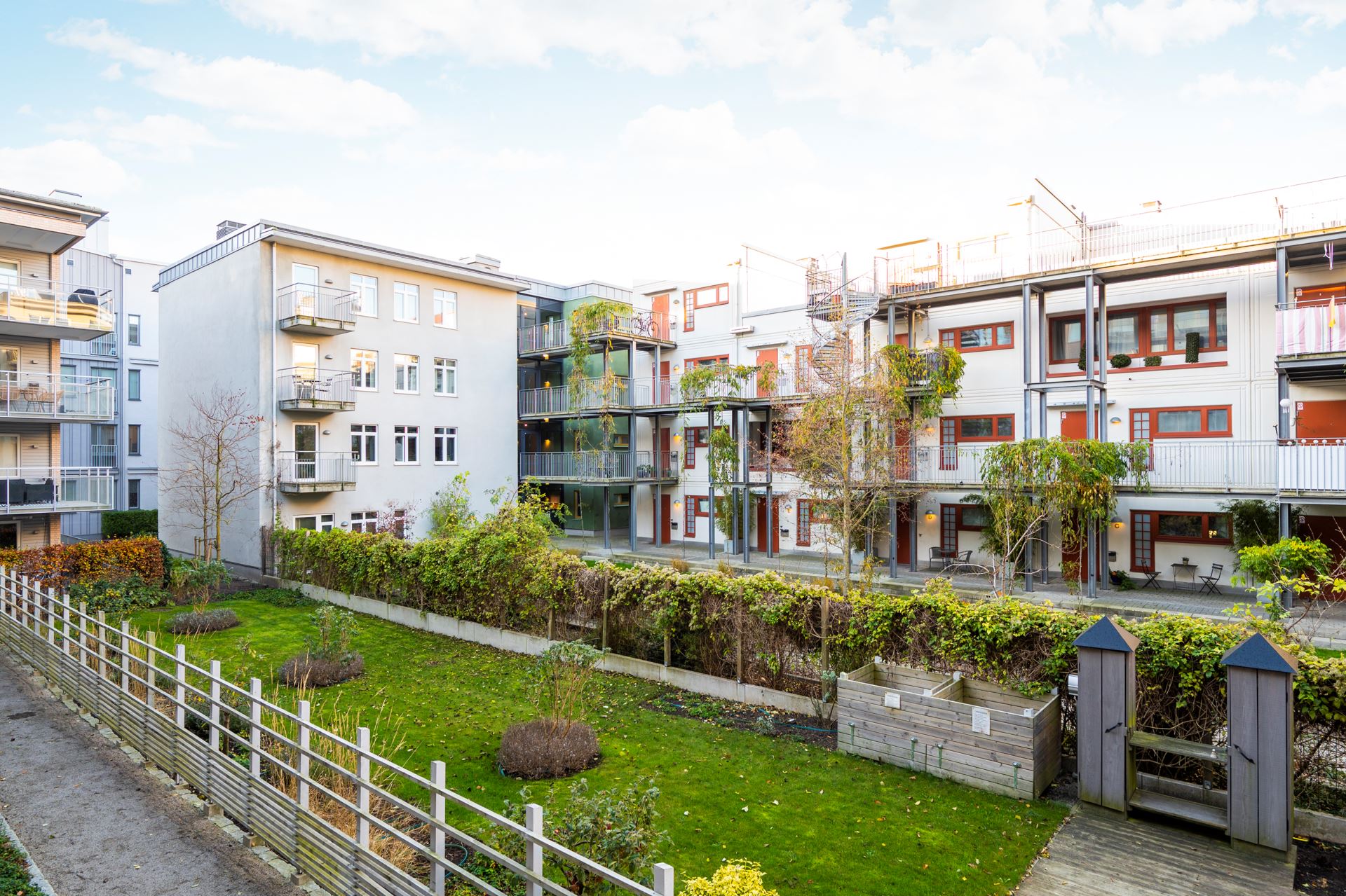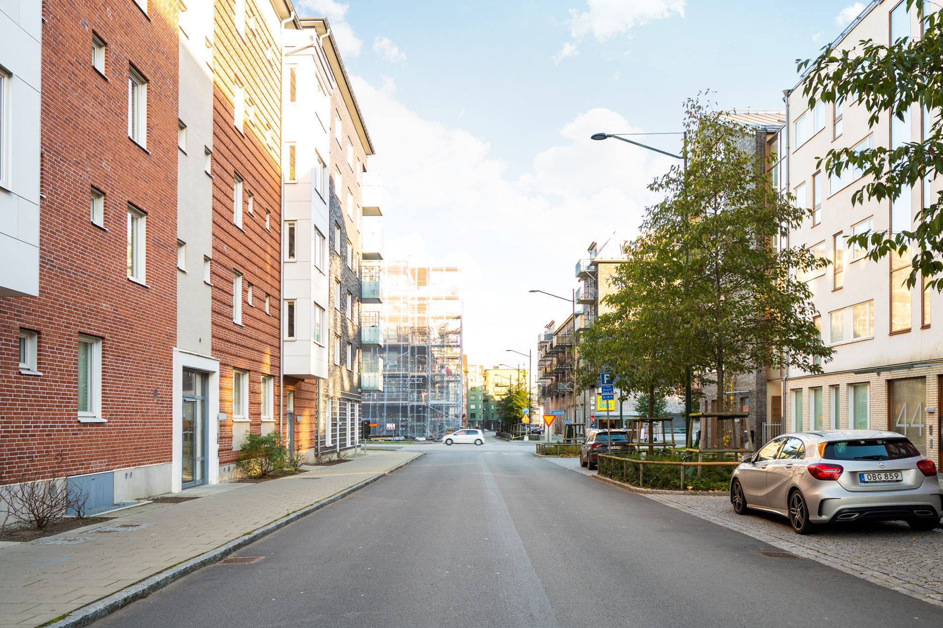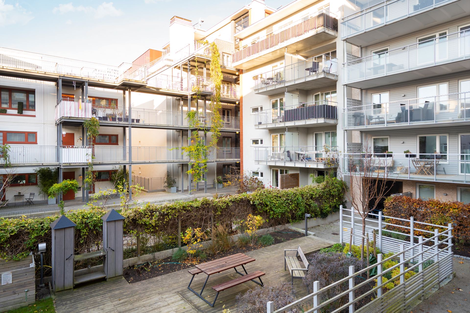 Vidare öppnar lägenheten upp med öppen planlösning mellan kök och vardagsrum. Här erbjuds generösa sällskapsytor med plats för stor soffgrupp, och matbord mot köksdelen. På golvet vilar trestavs ekparkett tillsammans med ljust målade väggar i grå-beige ton. Från vardagsrummet nås dessutom den sköna balkongen belägen på lugnt läge mot gårdssidan. Stor balkong där plats för både matplats och loungegrupp finns.