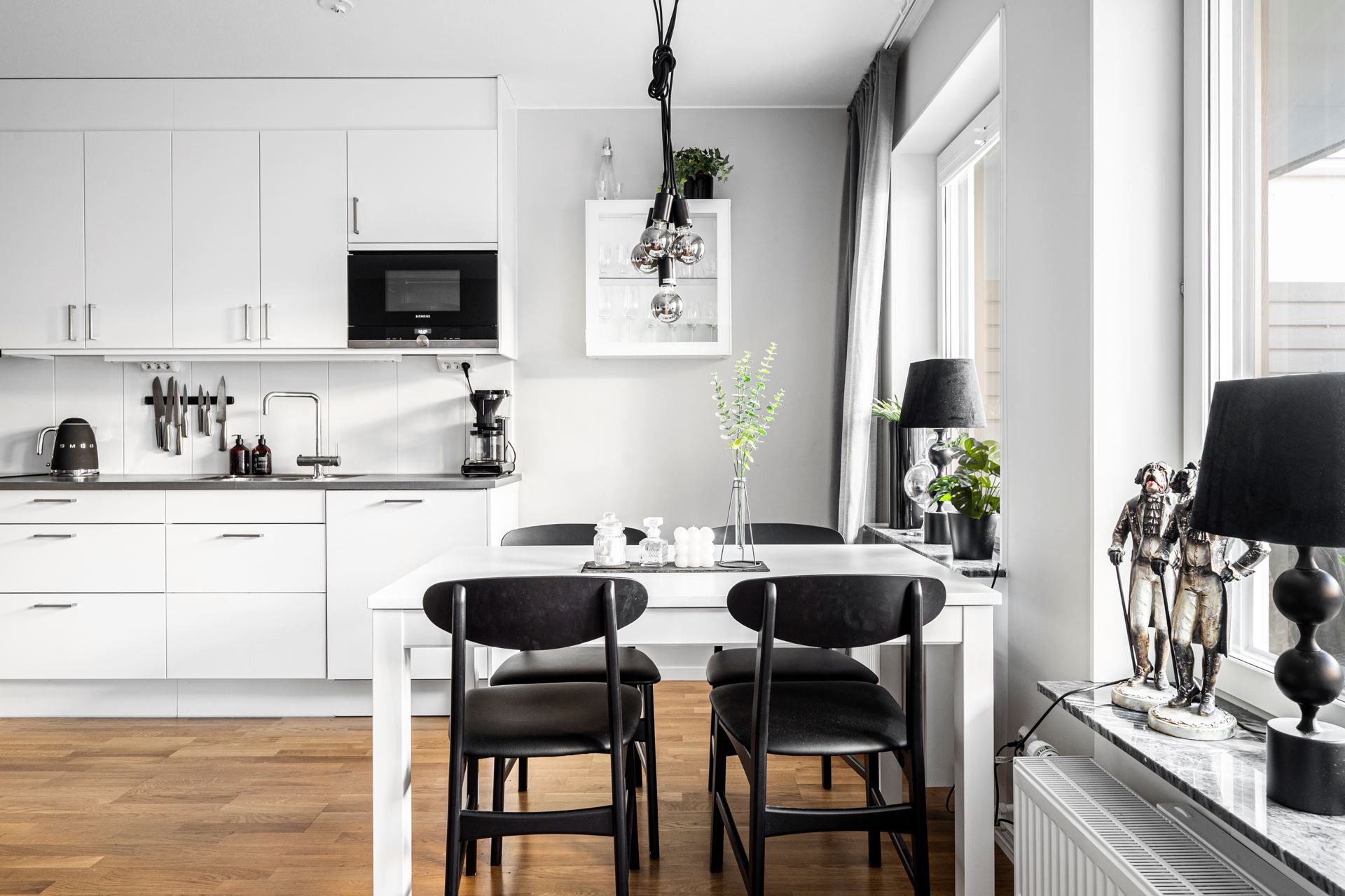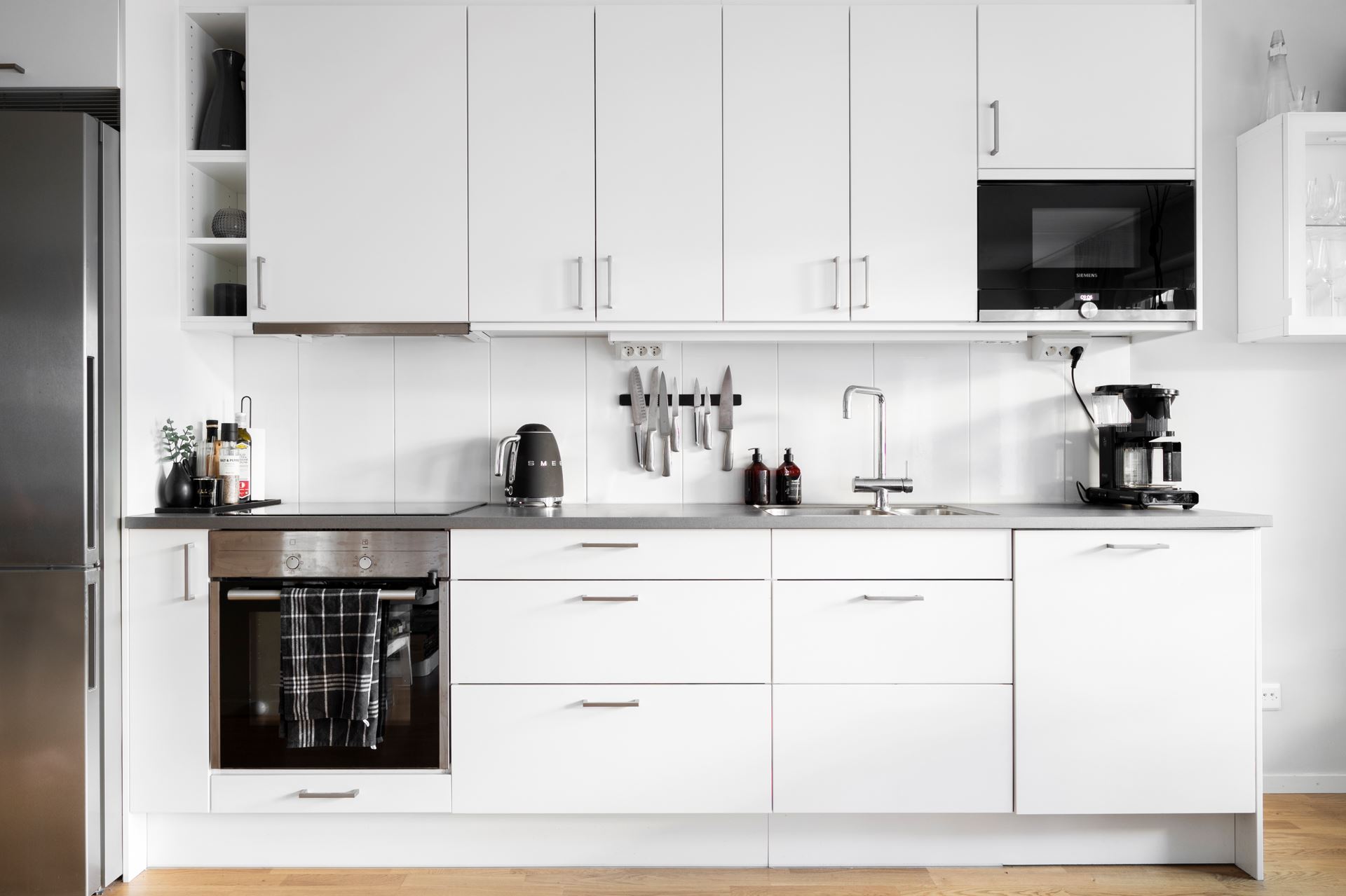 Stilrent vita köksluckor (Marbodal) tillsammans med vitt kakel och bänkskiva i laminat. Här erbjuds gott om plats till förvaring bakom både skåp och lådor samt goda arbetsytor. Köket är utrustat med kyl och frys, integrerad diskmaskin, spishäll, ugn, inbyggd mikro. Samtlig utrustning från Siemens. Fläkt (Franke).