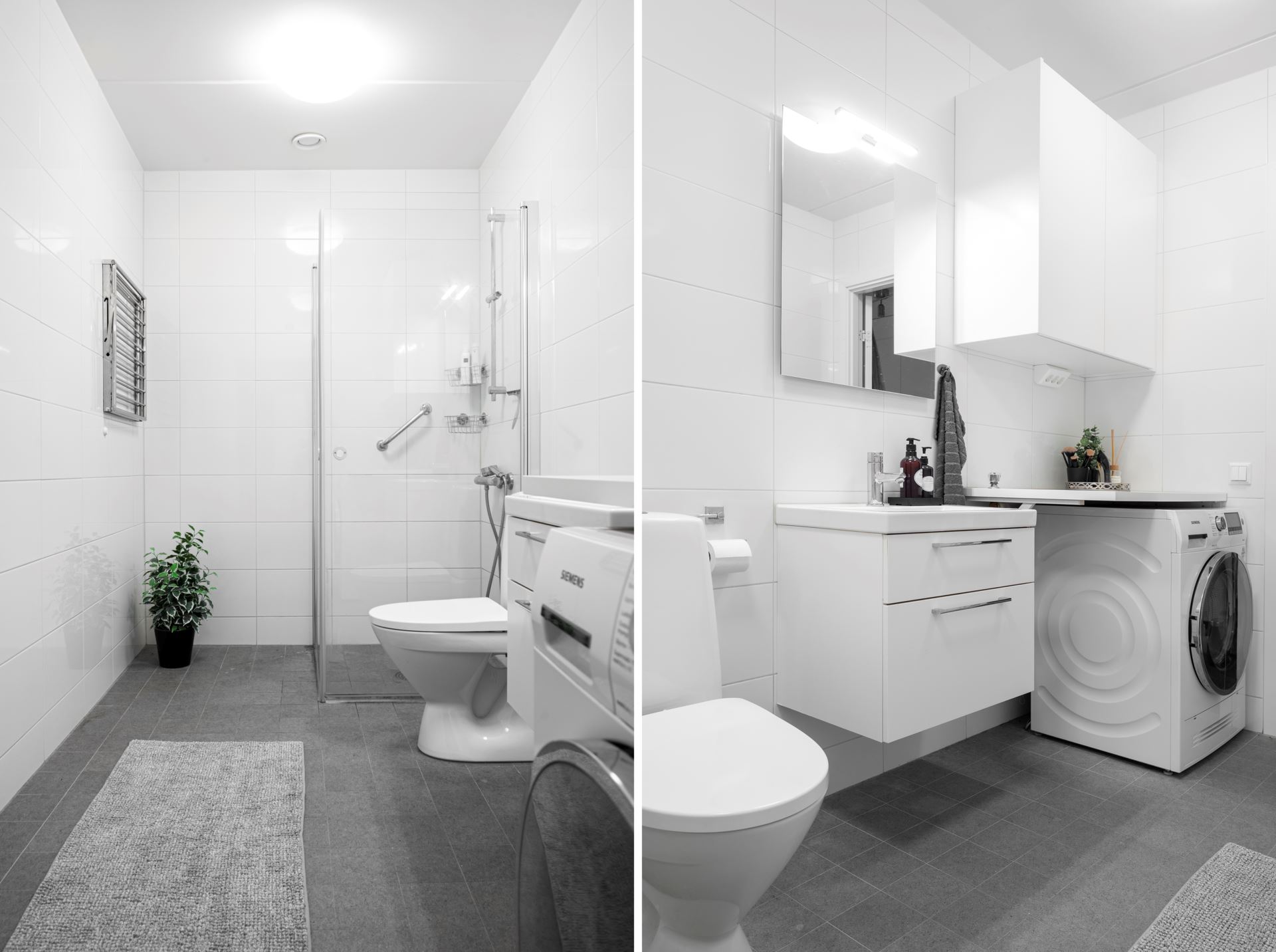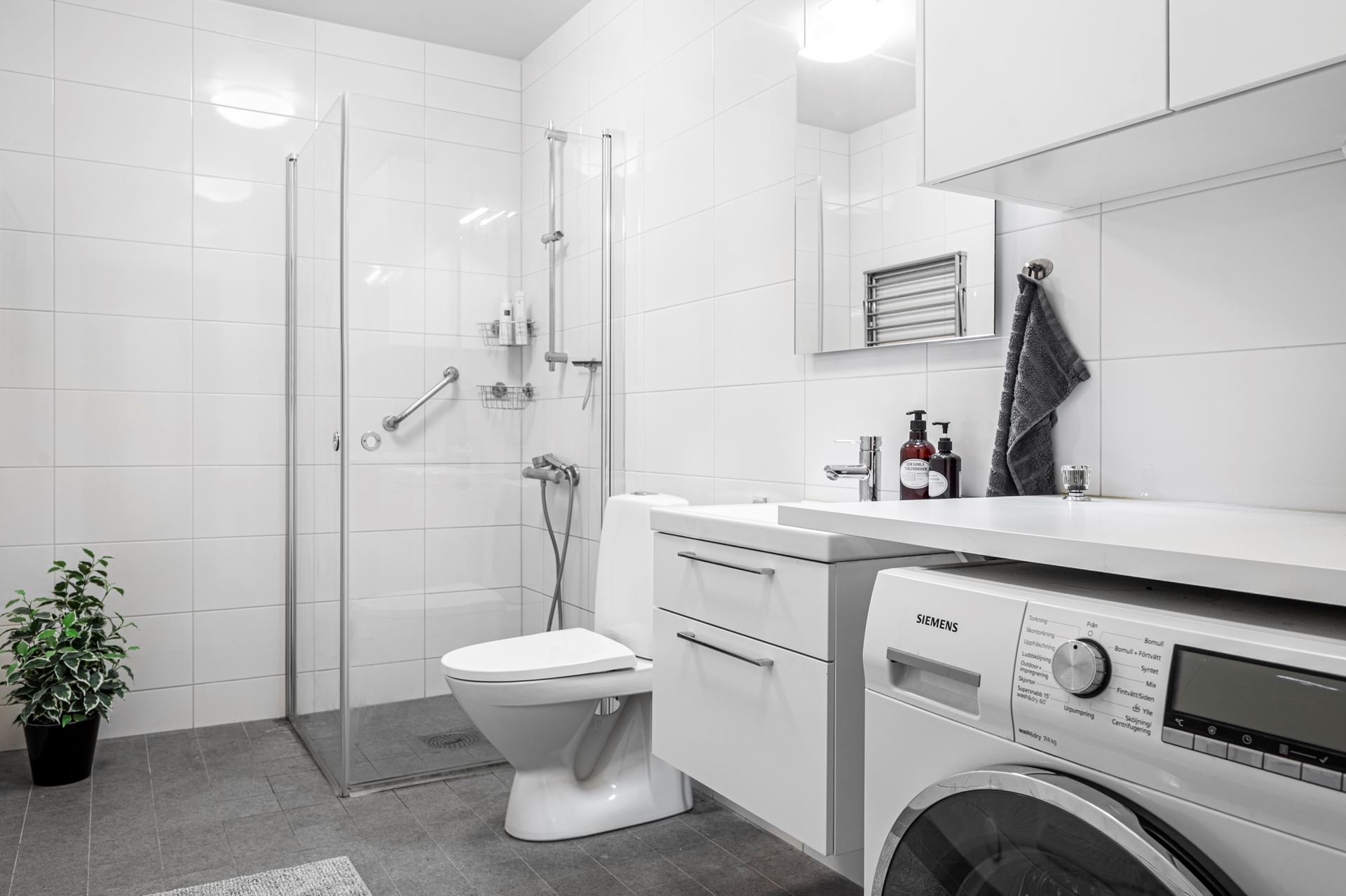Helkaklat badrum med ljusa klinkers på golv tillsammans med vitt kakel på väggarna. Badrummet är utrustat med dusch bakom glasvägg, handfat med kommod, wc, spegel, utfällbar handdukstork samt kombimaskin (Siemens). Ytterligare skåpsförvaring och arbetsyta finns ovanför.
