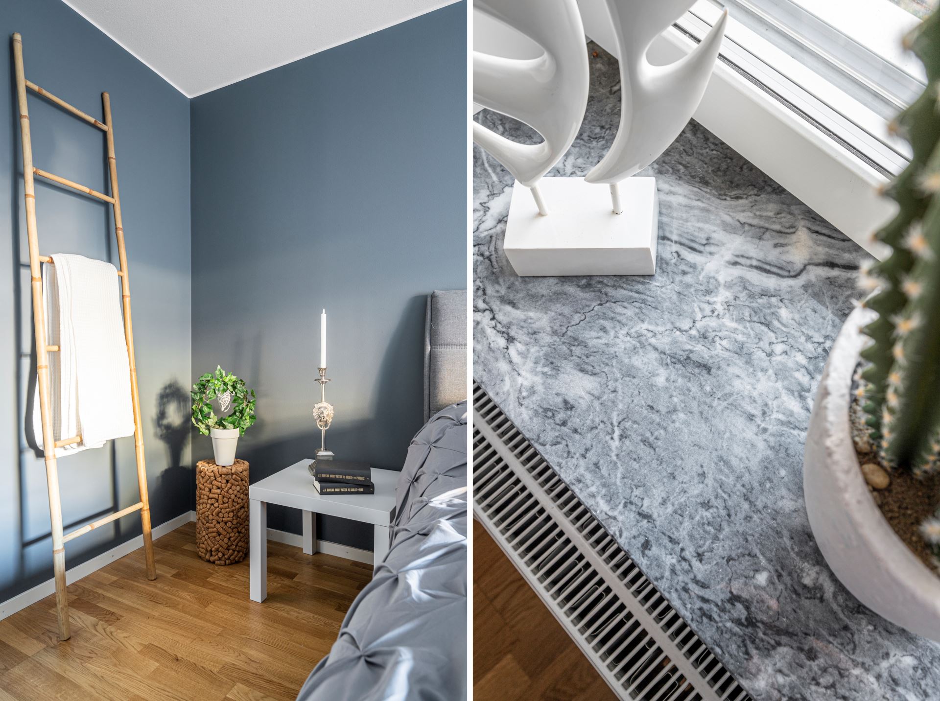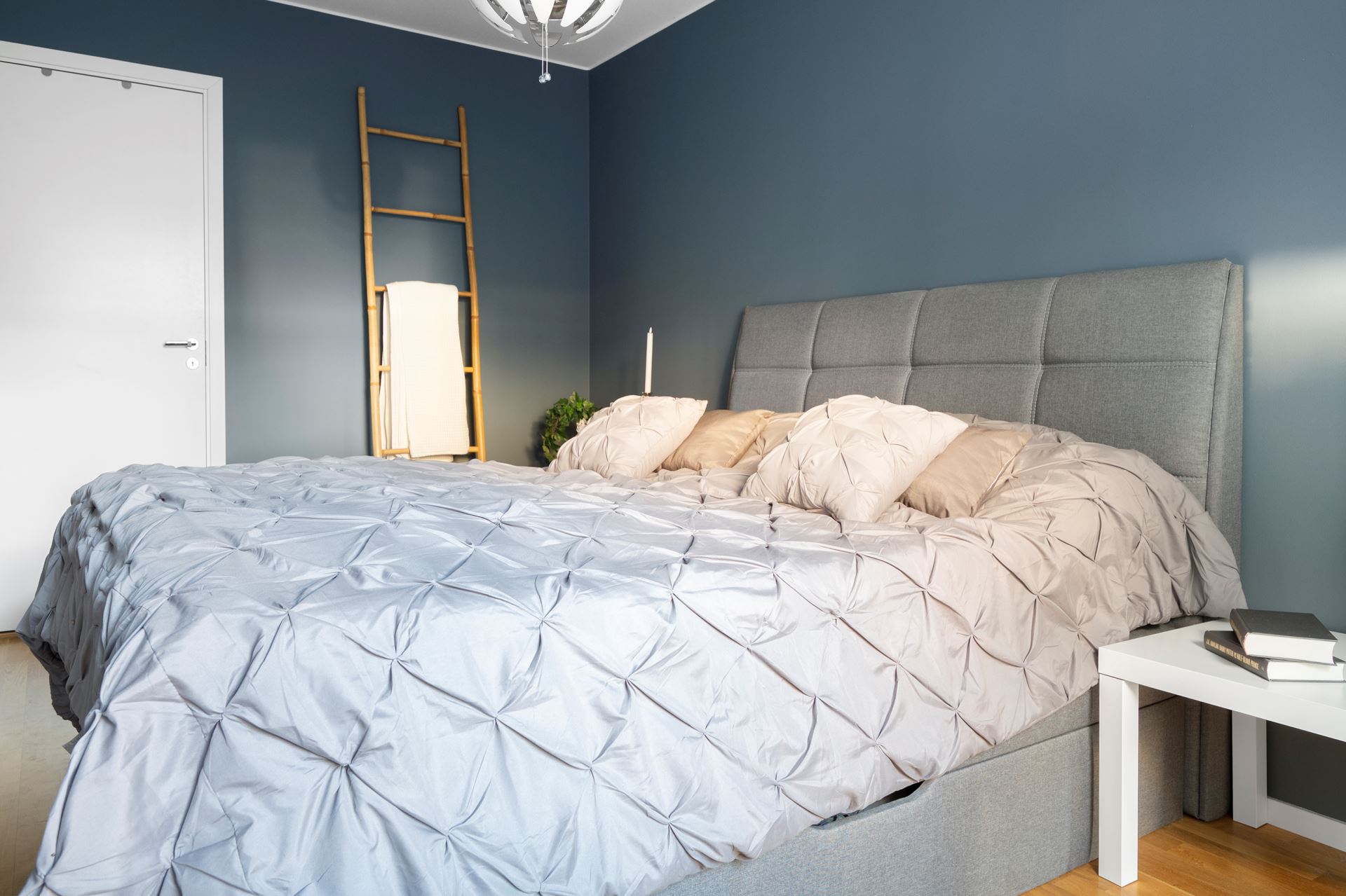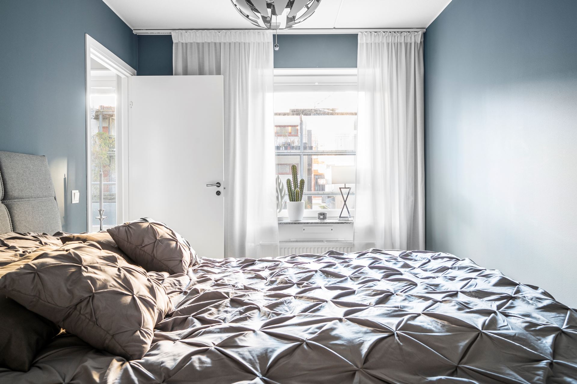Rymligt sovrum med plats för både dubbelsäng, sängbord och mer därtill. Väggarna är målade i smakfullt mörka toner tillsammans med ekparkett på golv. Från sovrummet finns dessutom en rymlig walk in closet.