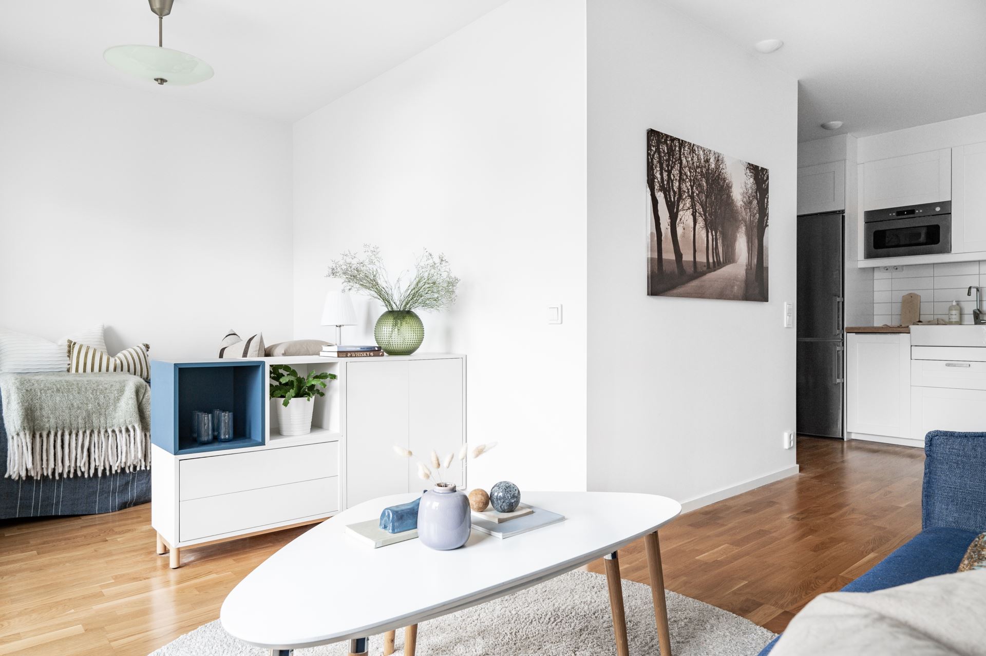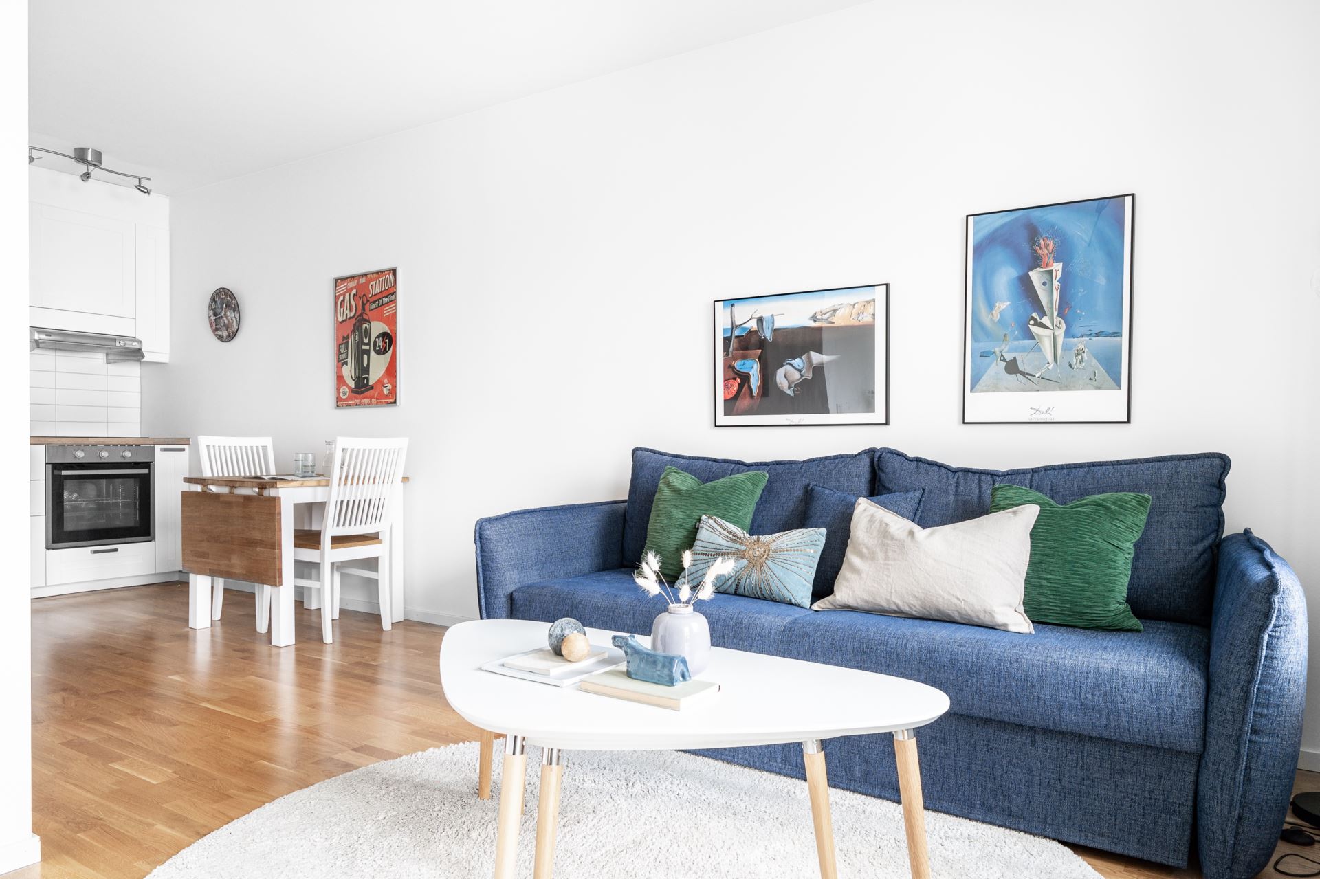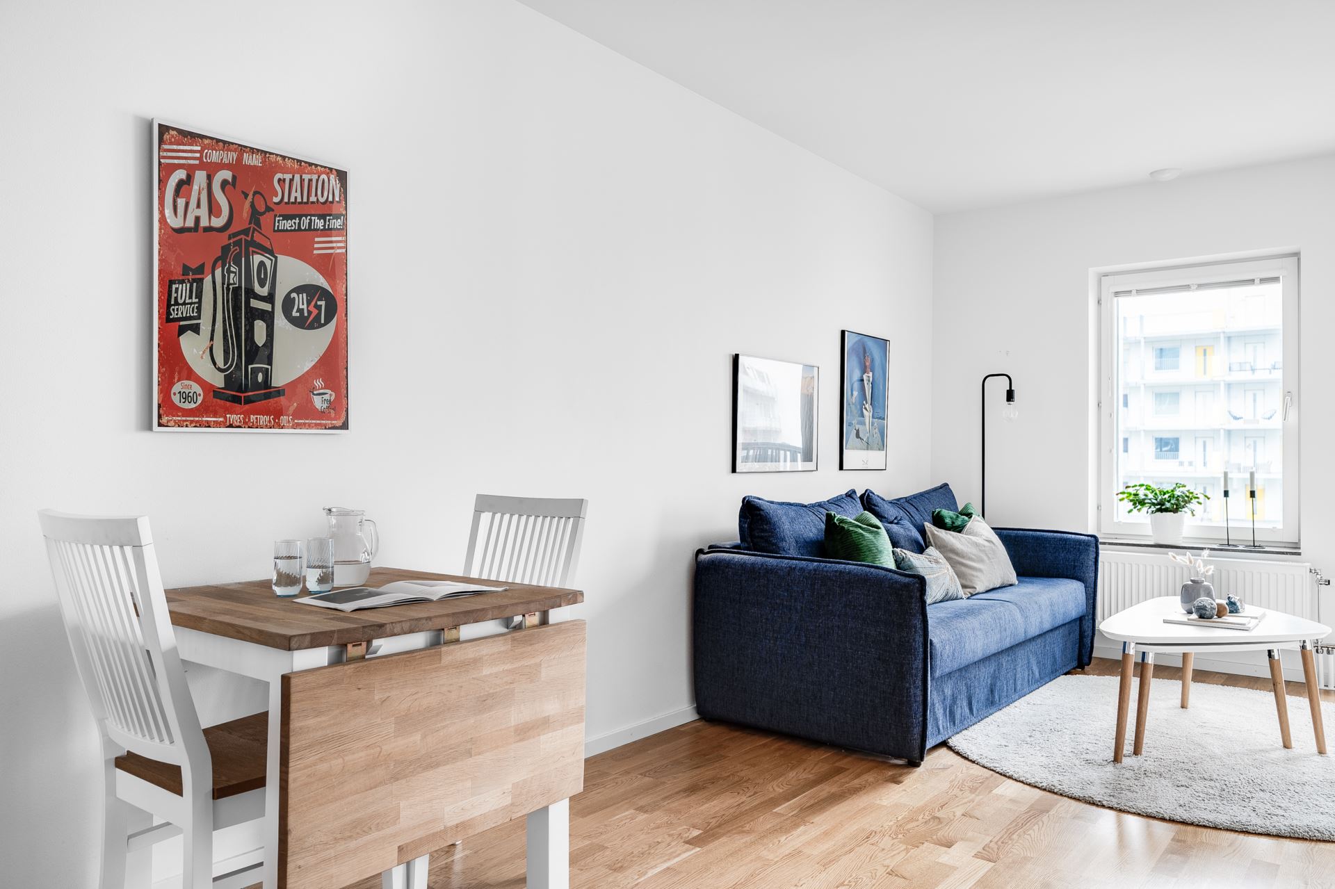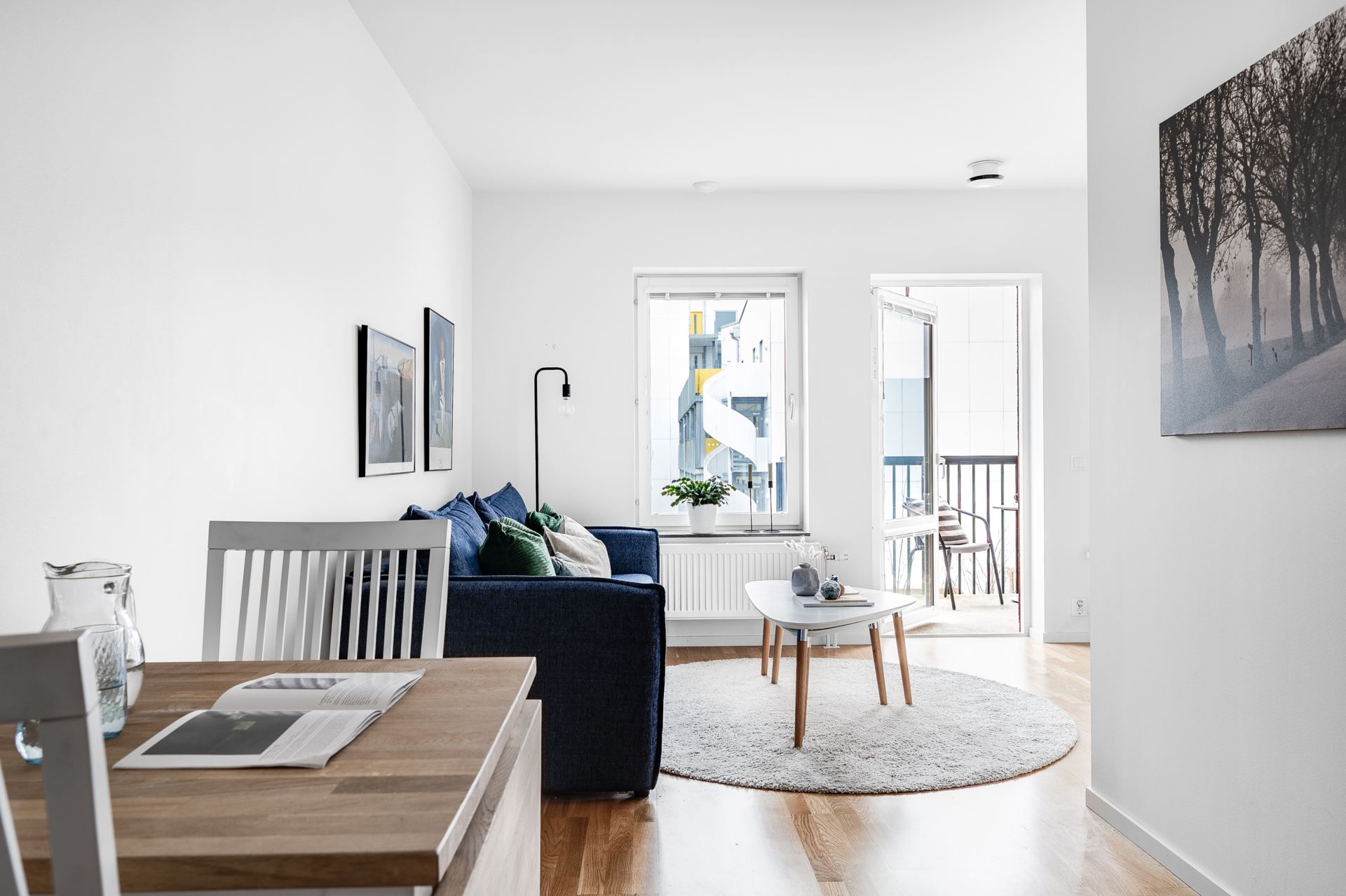 Vidare in öppnar lägenheten upp med vardagsrummet. Här finns möjlighet att möblera med mindre soffgrupp och matbord mot köksdelen. Släta väggar ljusa toner kombineras med trestavs ekparkett på golv. Från vardagsrummet nås den sköna balkongen belägen på lugnt läge mot innergården. Praktisk sovalkov med fönster rymmer plats för större säng.