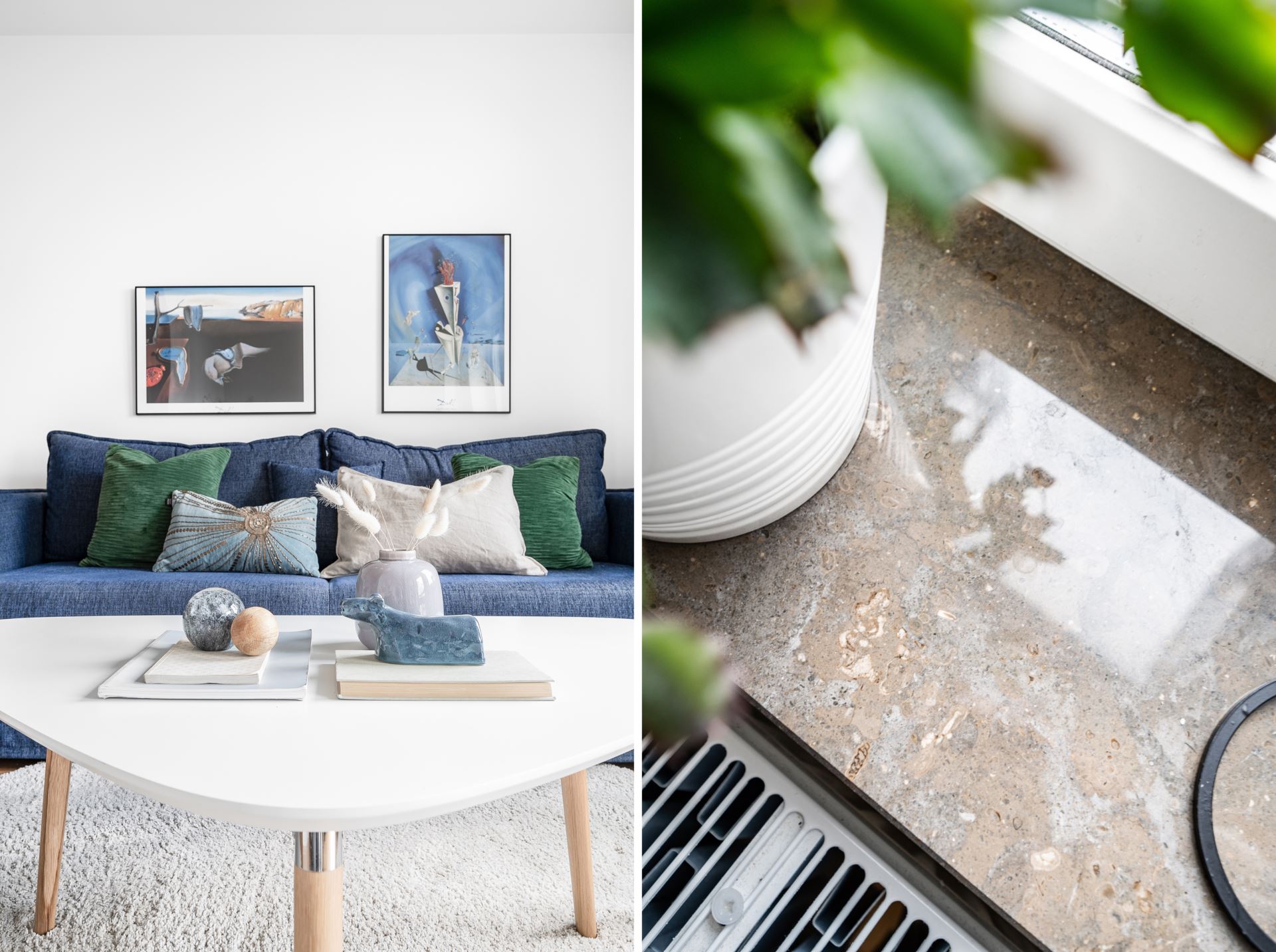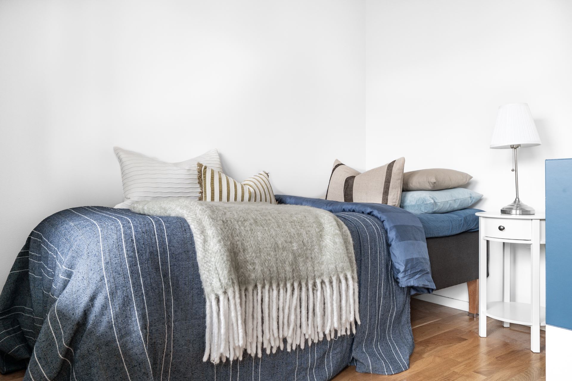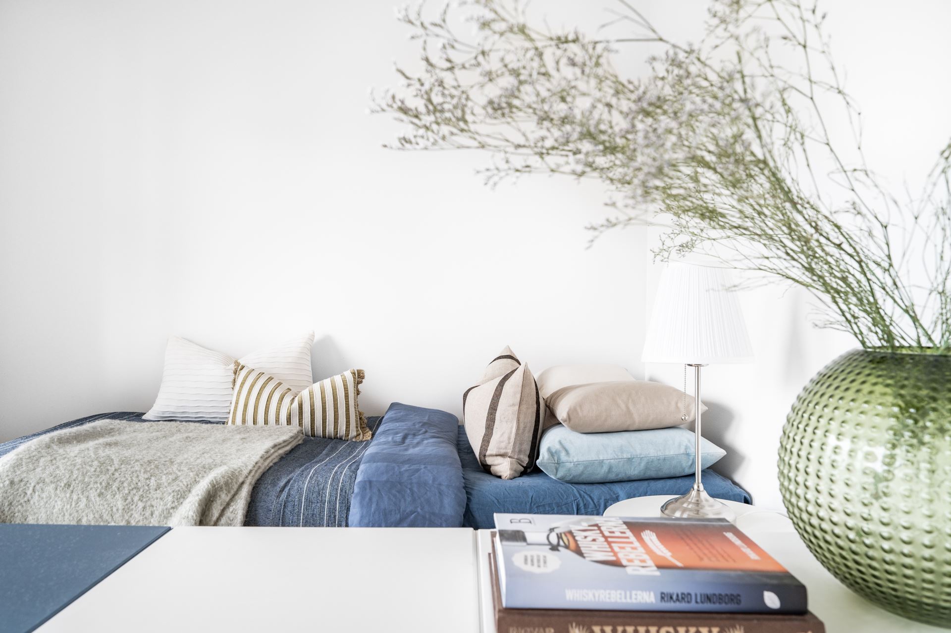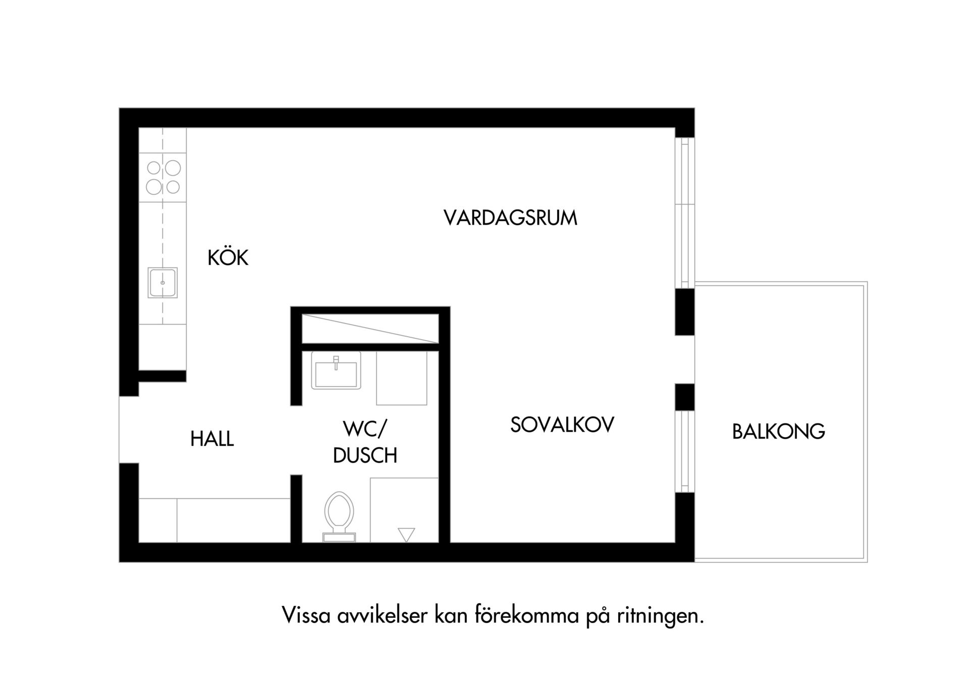 Vidare in öppnar lägenheten upp med vardagsrummet. Här finns möjlighet att möblera med mindre soffgrupp och matbord mot köksdelen. Släta väggar ljusa toner kombineras med trestavs ekparkett på golv. Från vardagsrummet nås den sköna balkongen belägen på lugnt läge mot innergården. Praktisk sovalkov med fönster rymmer plats för större säng.