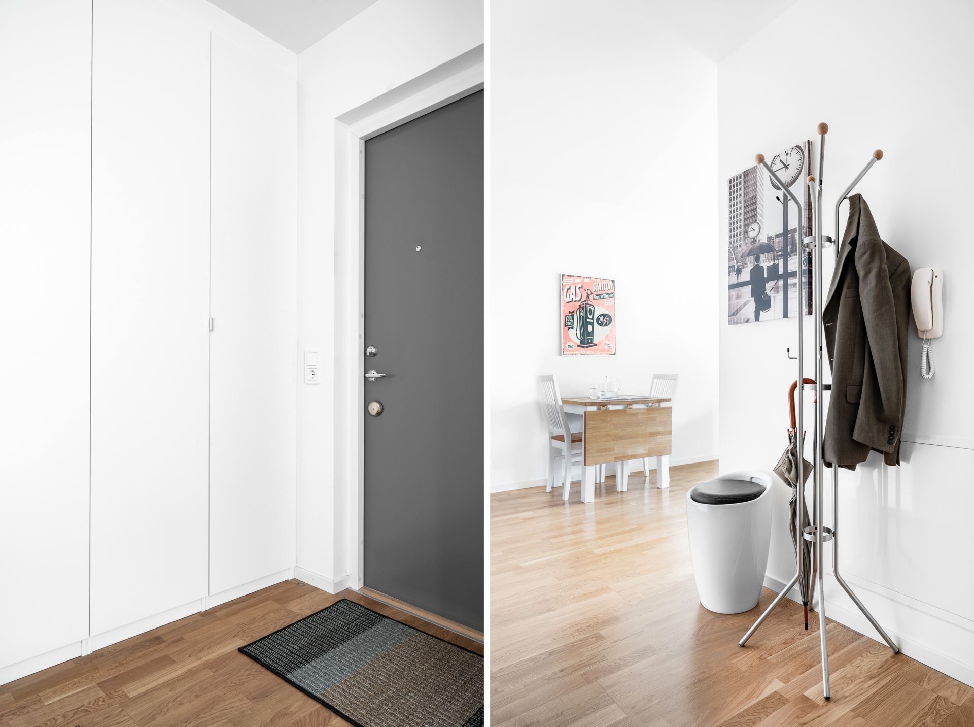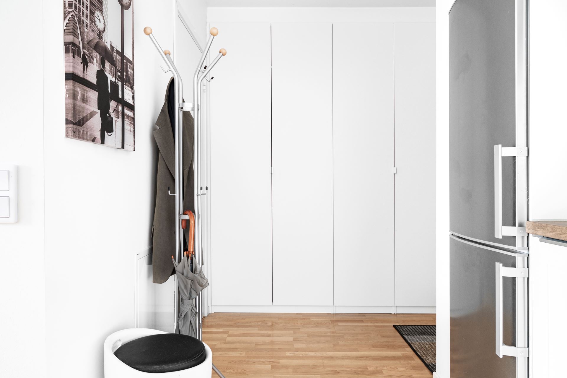 Vi tar hissen till tredje våningen där vi välkomnas in i trivsam hallmiljö. Här finns gott om plats ytterligare plats till förvaring bakom garderober på höger sida. Ljusa väggar kombineras med trestavs ekparkett på golv.