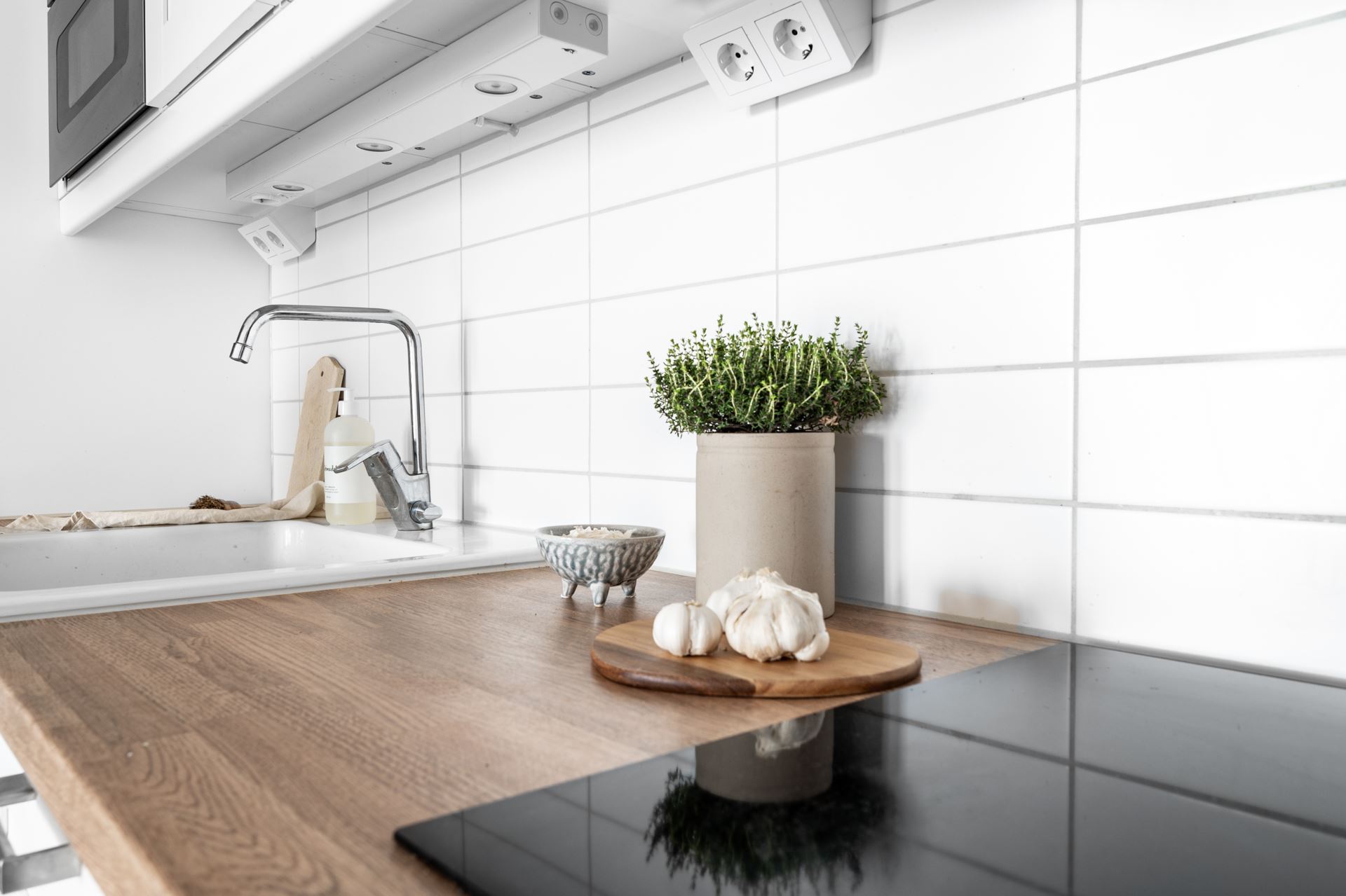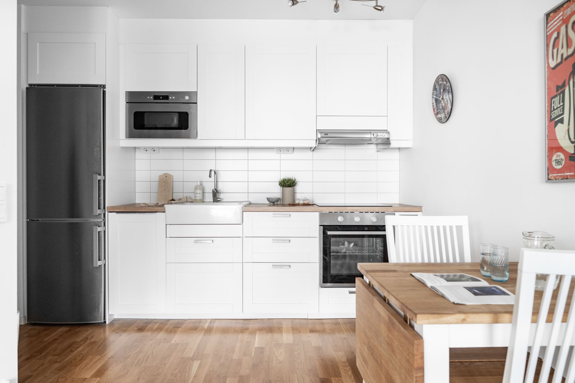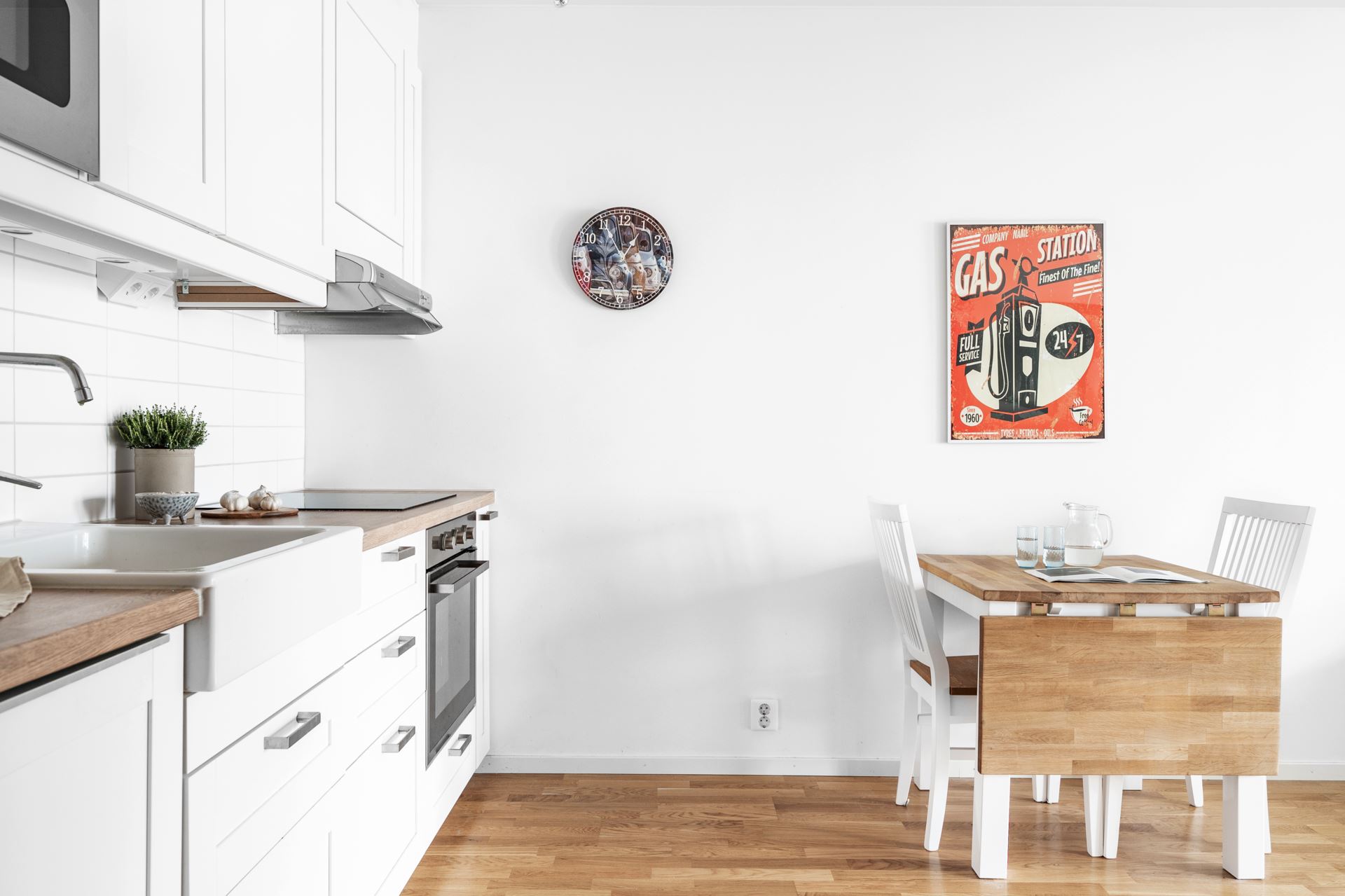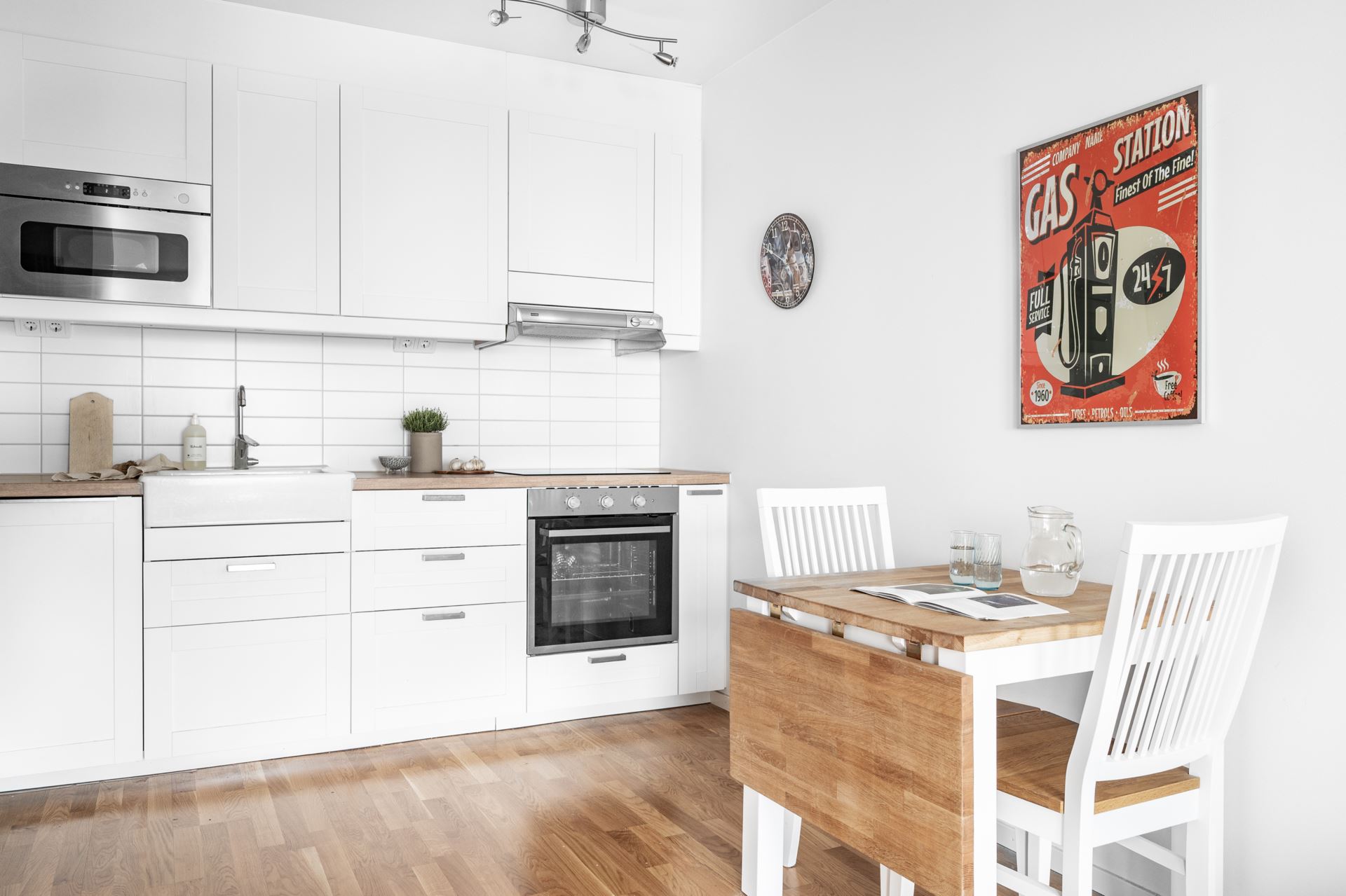 Stilrent kök med vita profilierade köksluckor som kombineras med vitt kakel med bänkskiva i trä. Köket är utrustat med diskmaskin, kyl/frys, spishäll, mikrovågsugn, ugn och fläkt. Plats för matbord för fyra personer intill köket.