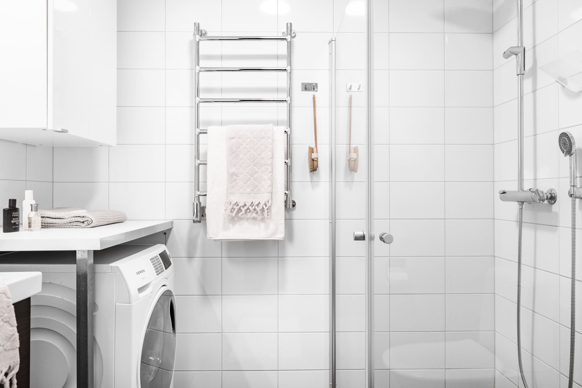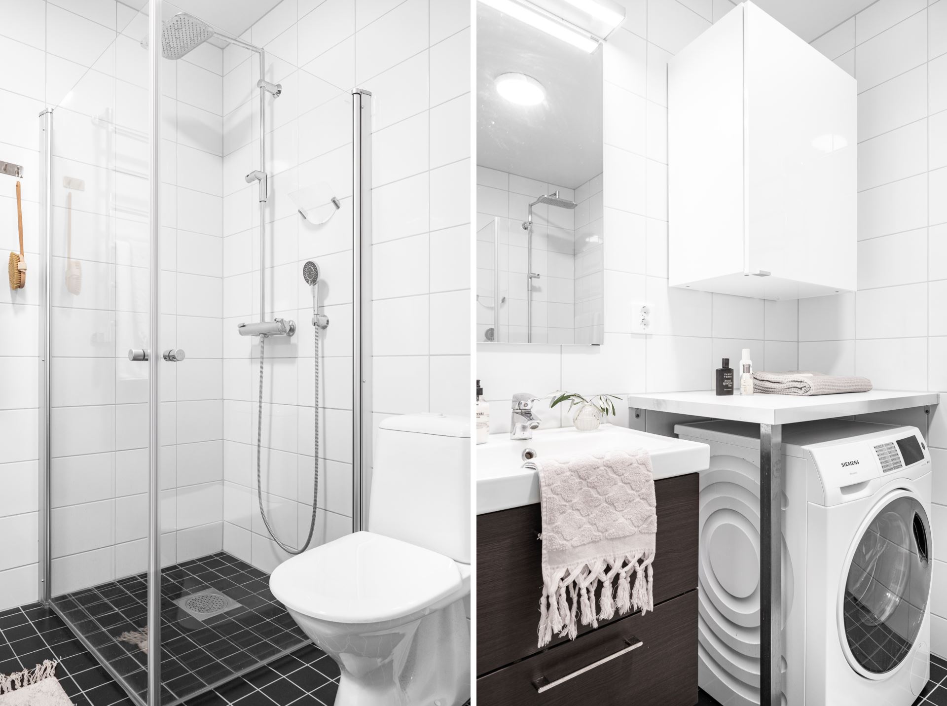 Helkaklat badrum med vitt kakel på väggarna och mörkare klinkers på golv. Badrummet är utrustat med dusch bakom glasvägg, handfat med kommod, wc, spegel samt kombimaskin för tvätt och tork.