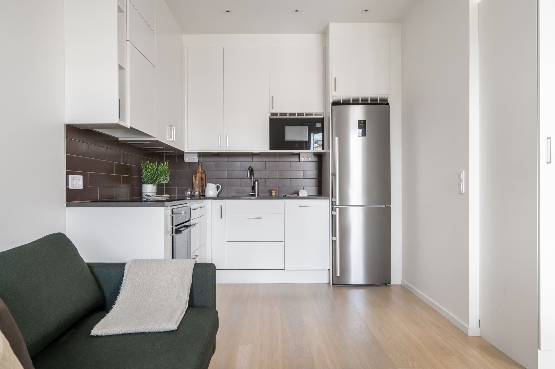 Lägenheten öppnar sedan upp med kök och vardagsrum i öppen planlösning, bra sociala ytor där de båda utrymmen är sammanflätade på ypperligt vis. Här finns plats för såväl soffhörna som matbordsdel. Stort fönsterparti skänker dessutom ett trivsamt ljusinsläpp till hela rummet! Från vardagsrummet får vi access till den sköna balkongen belägen i härligt österläge! Köket smälter in på bästa sätt, stilrena vita luckor tillsammans med bänkskiva i kompositsten (Calypso). Köket är utrustat med kyl, frys, spishäll, mikro, ugn (pyroteknik), fläkt och diskmaskin.