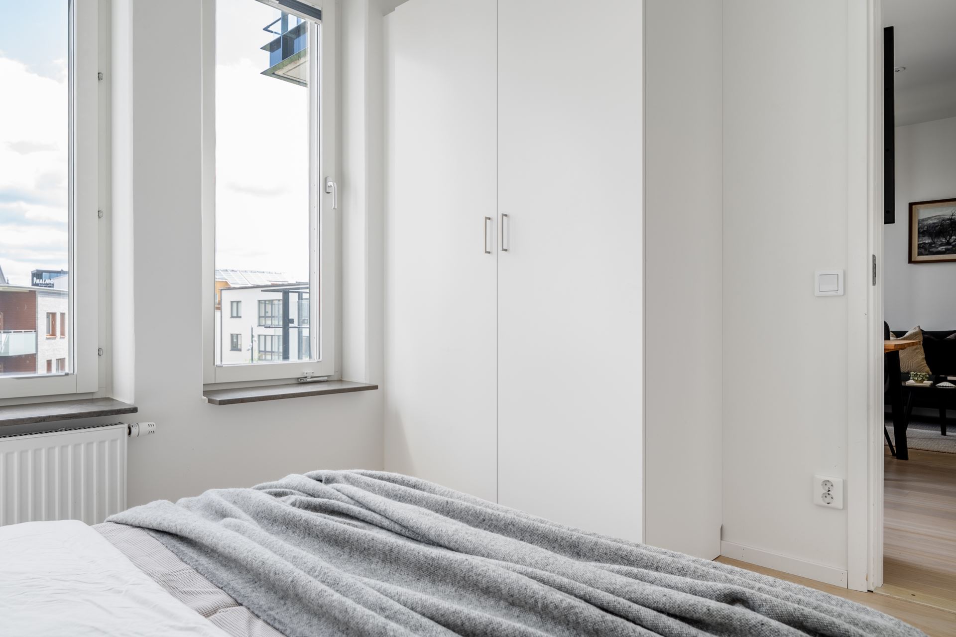 Vägg i vägg med vardagsrummet når vi vidare sovrummet som rymmer plats för en säng , sängbord samt extra förvaringsmöbel om så önskas. Ytterligare förvaring finner vi på höger sida av rummet bakom garderober längst med väggen.