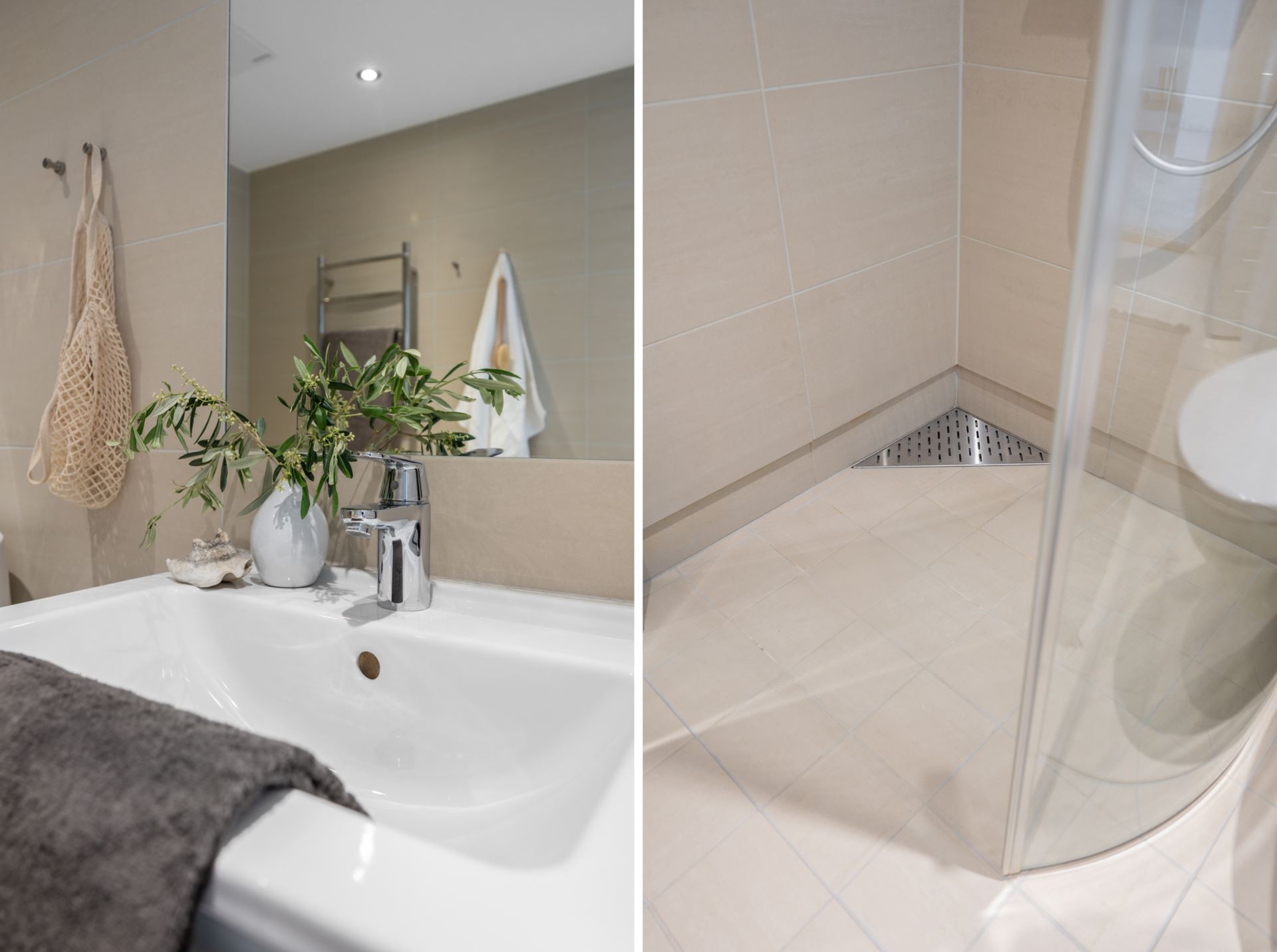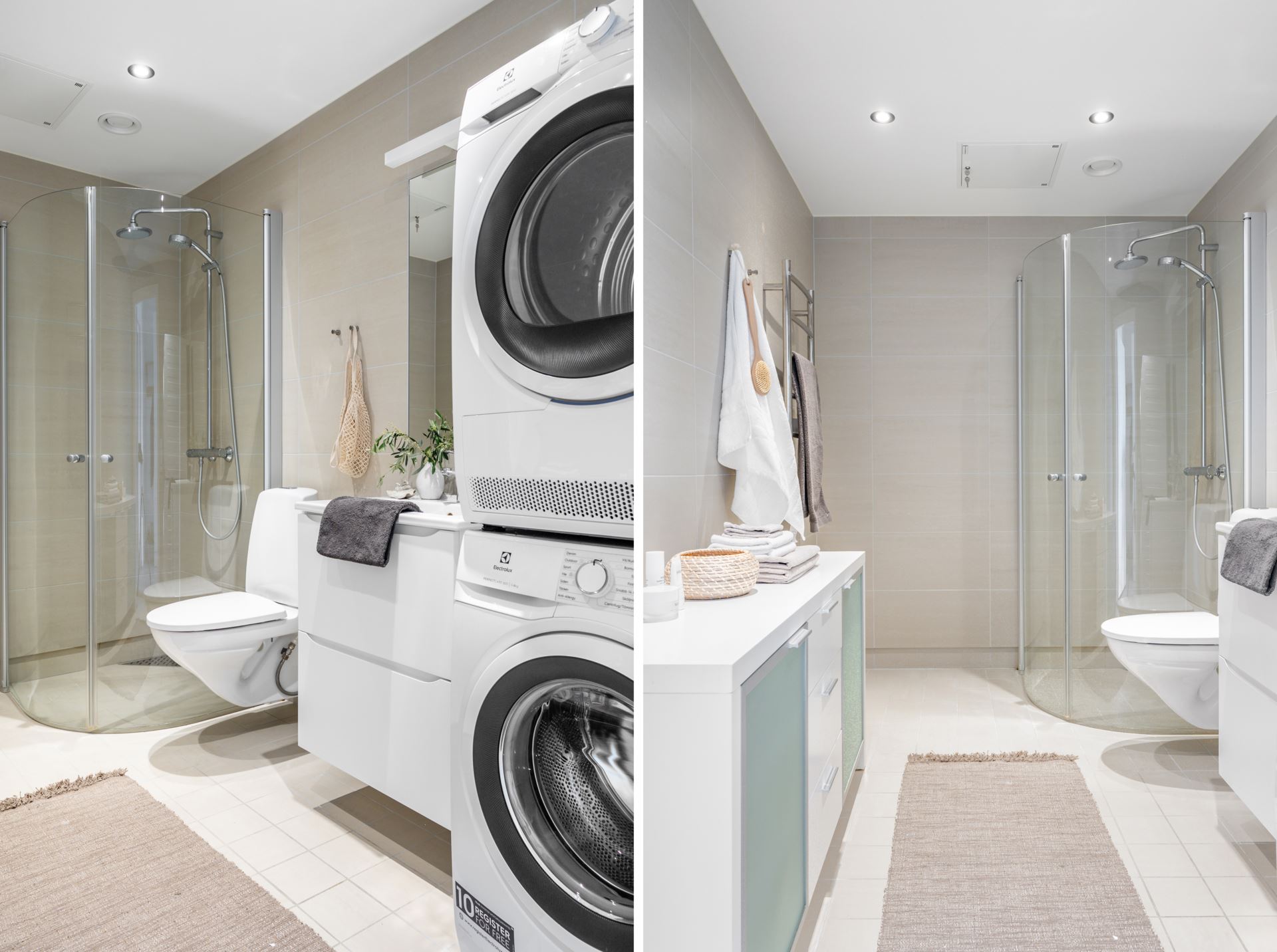 Helkaklat badrum med sobert beiga toner på både golv och väggar, badrummet är utrustat med golvvärme, vägghängande wc, takdusch med glaspartier, handfat med kommod, spegel, tvättmaskin och torktumlare.