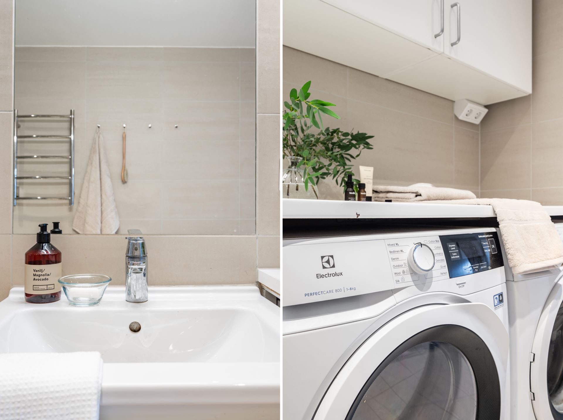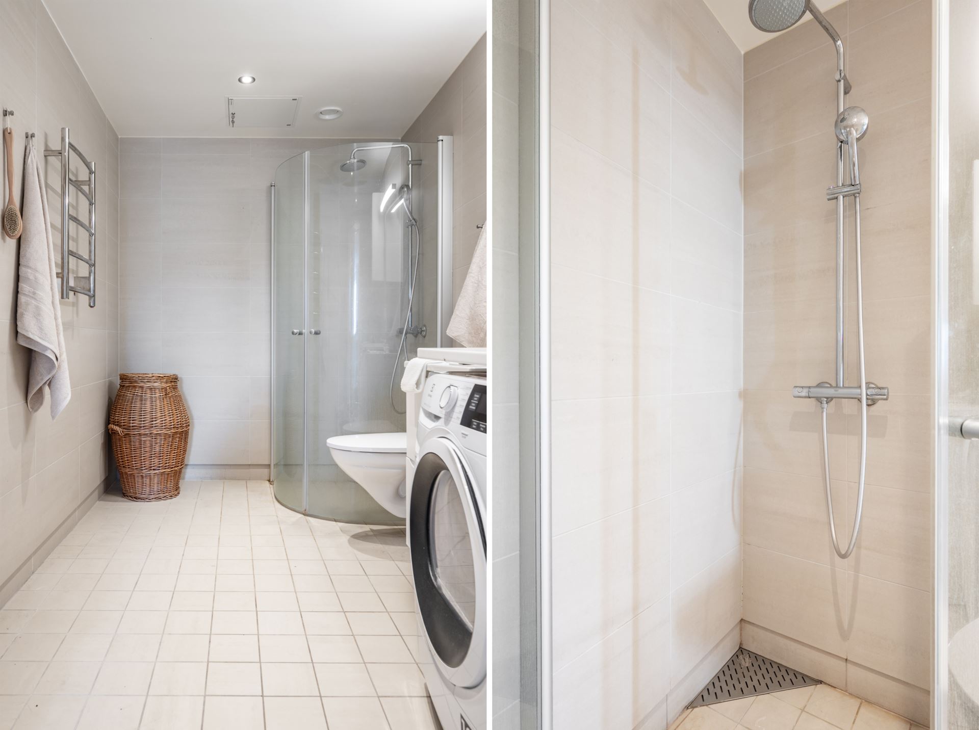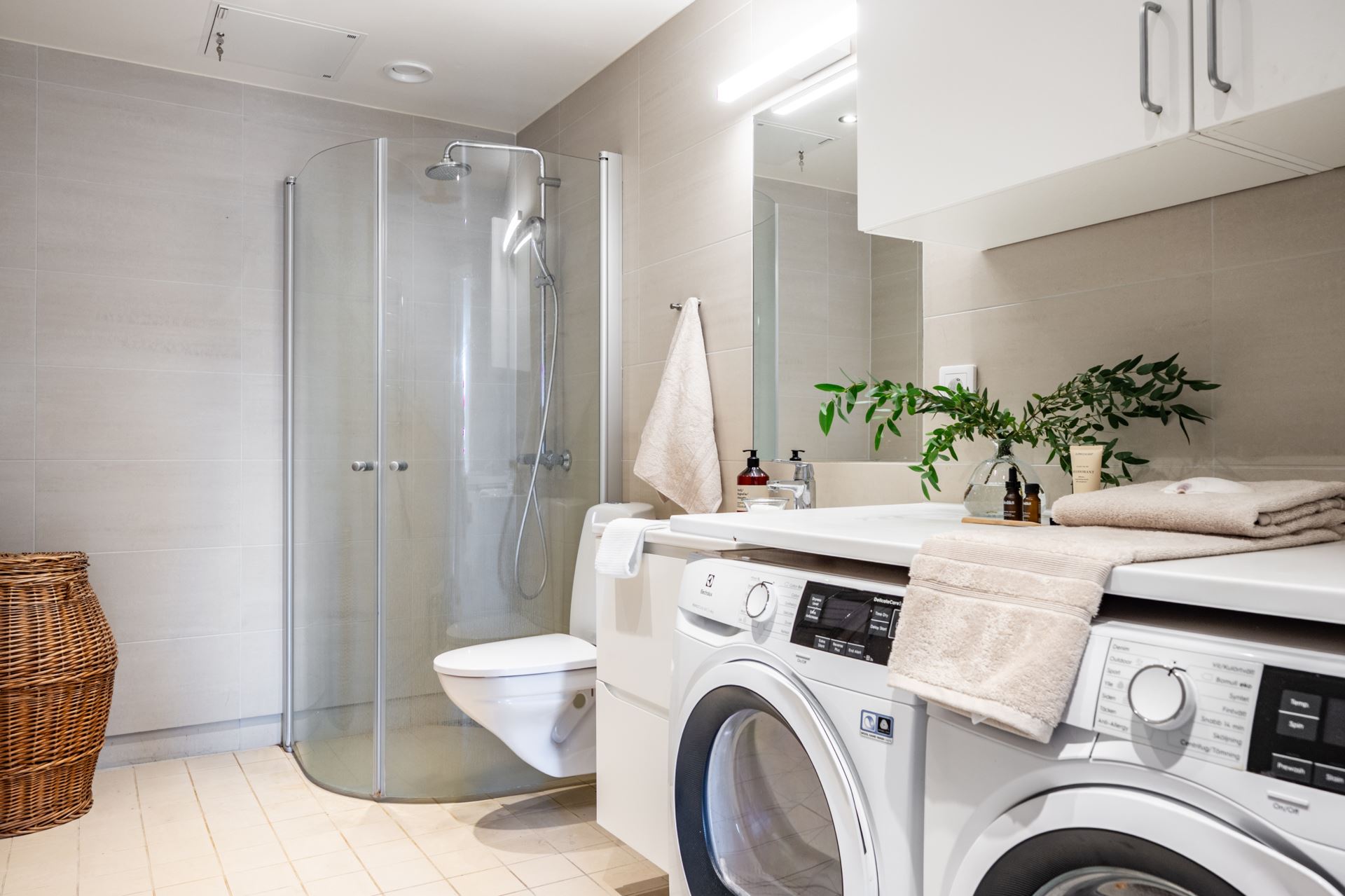 Helkaklad badrumsmiljö som bjuder på genomgående sobert beiga toner, både på kakel och klinkers. Badrummet är utrustat med vägghängd wc, takdusch bakom glasväggar, handfat med kommod, spegel, elektrisk handdukstork, tvättmaskin och torktumlare. Ytterligare skåpsförvaring ovanför tvätt,- och tork samt bänkskiva.
