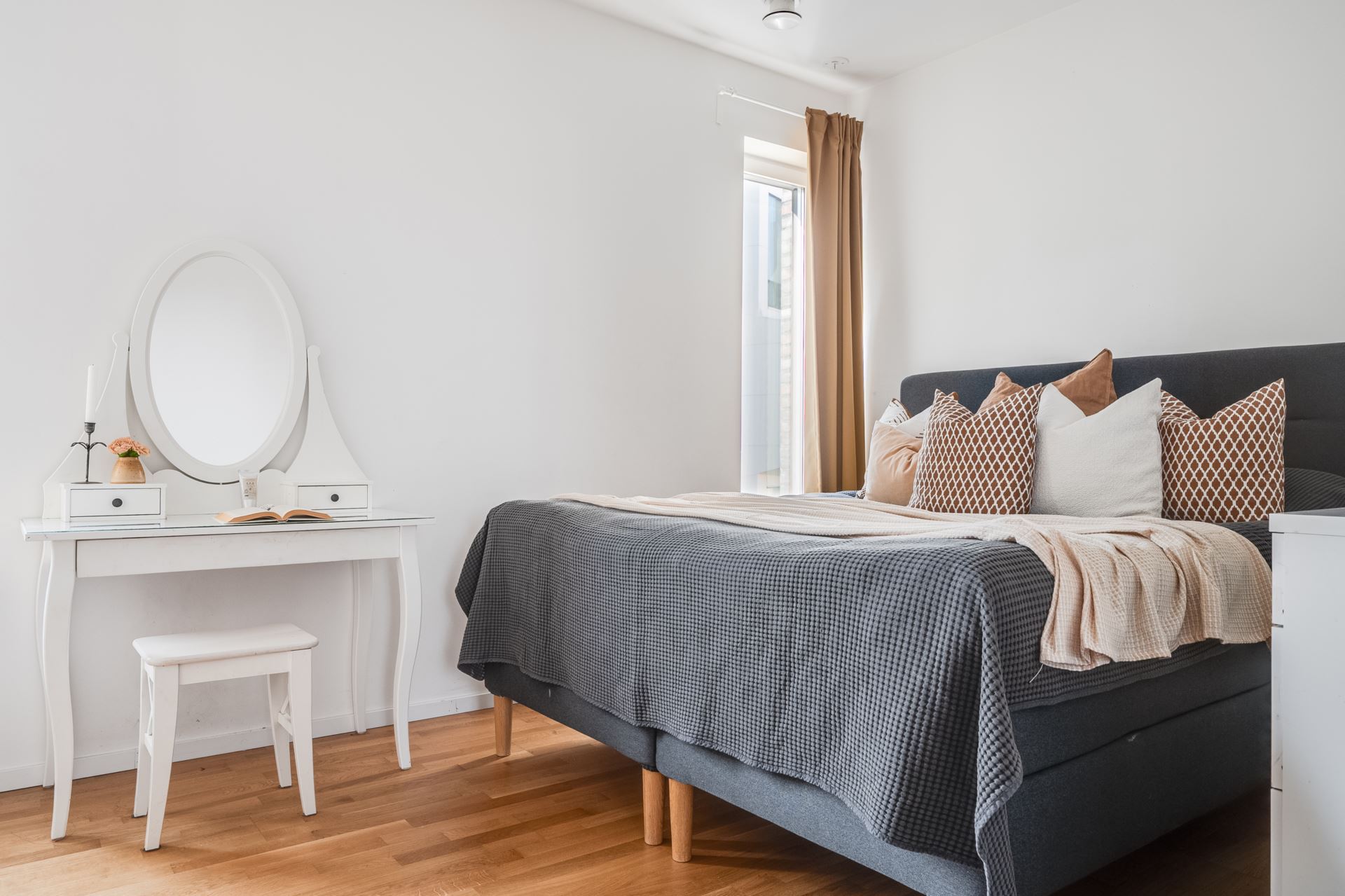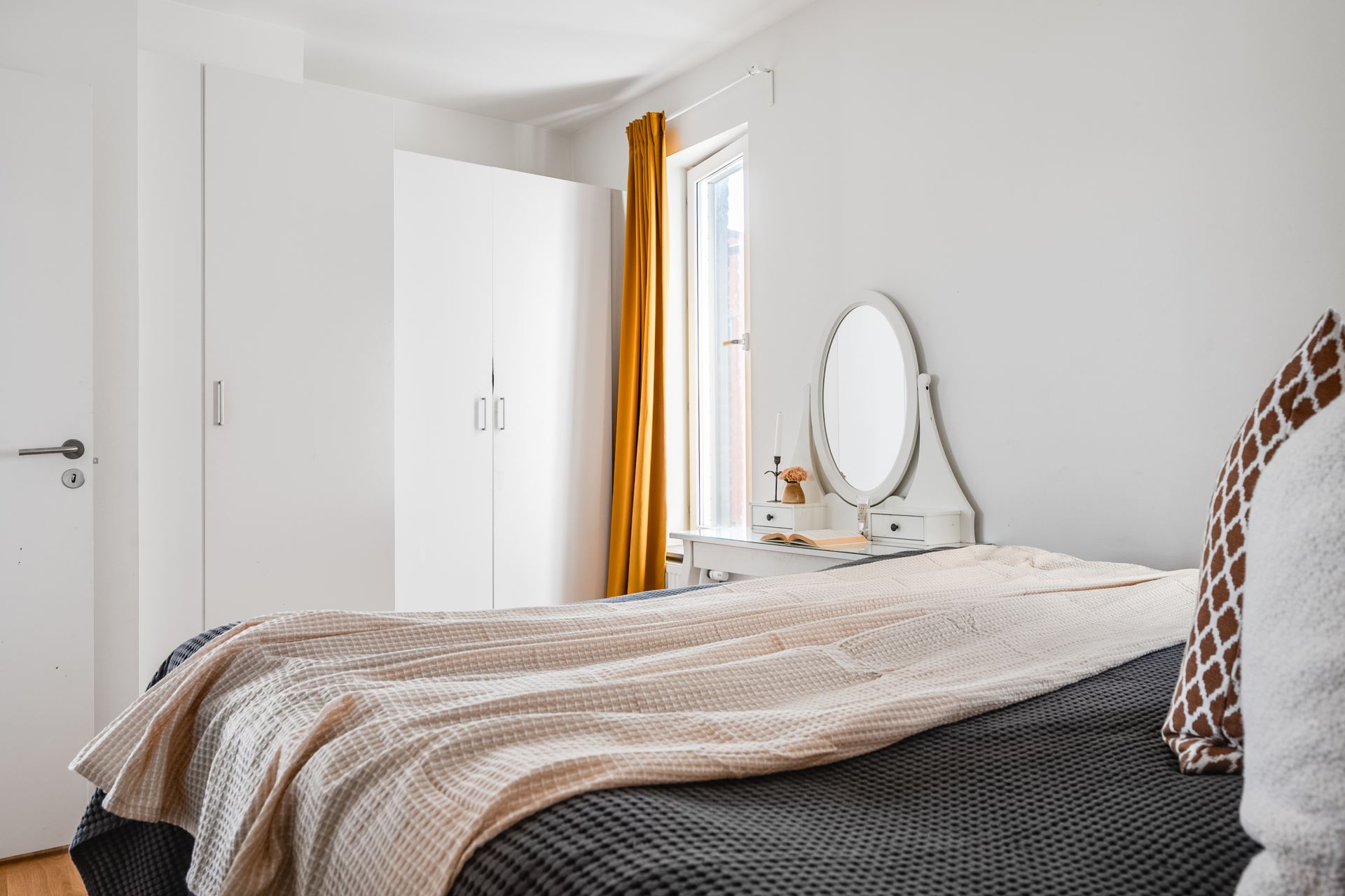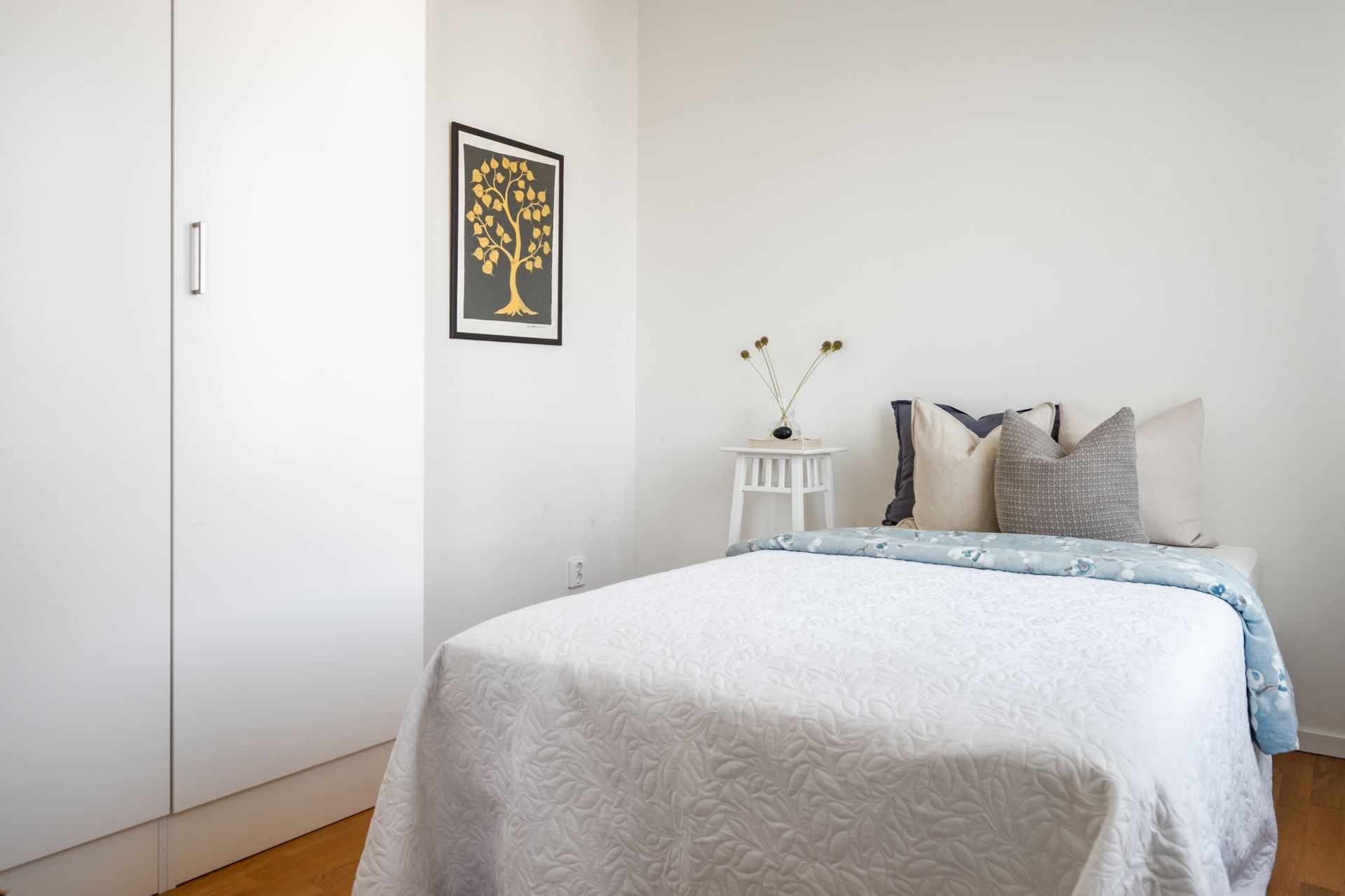 Det tredje sovrummet finner vi bredvid köket och det är också rymligt till storleken. Perfekt som barnrum, gästrum eller hemmakontor. Även här finns garderobsförvaring.