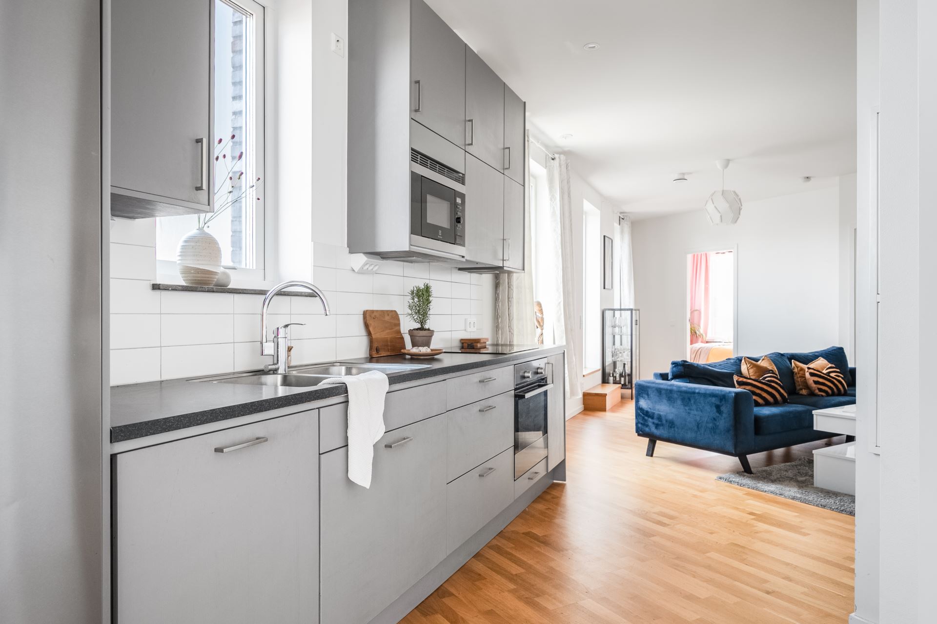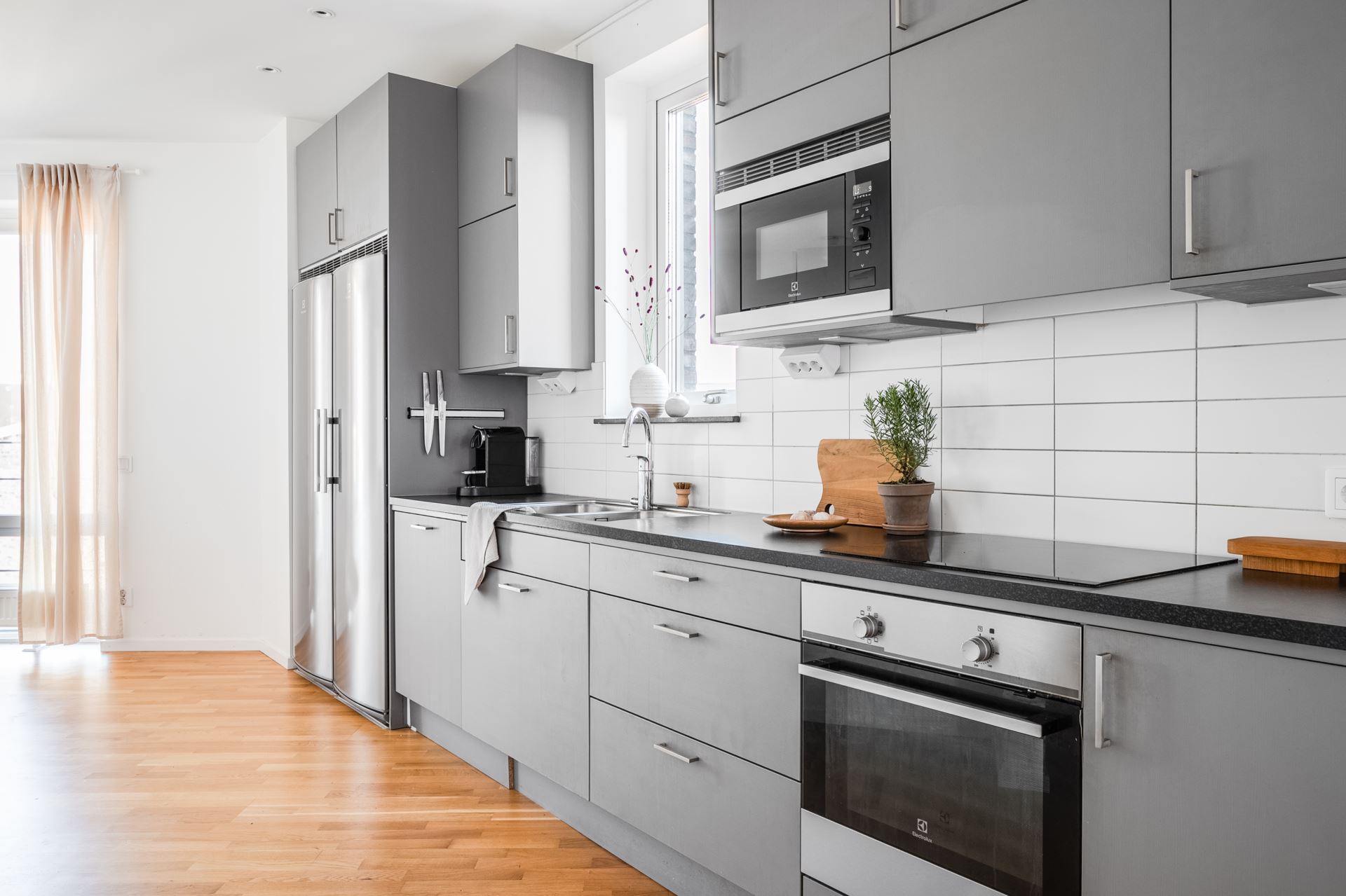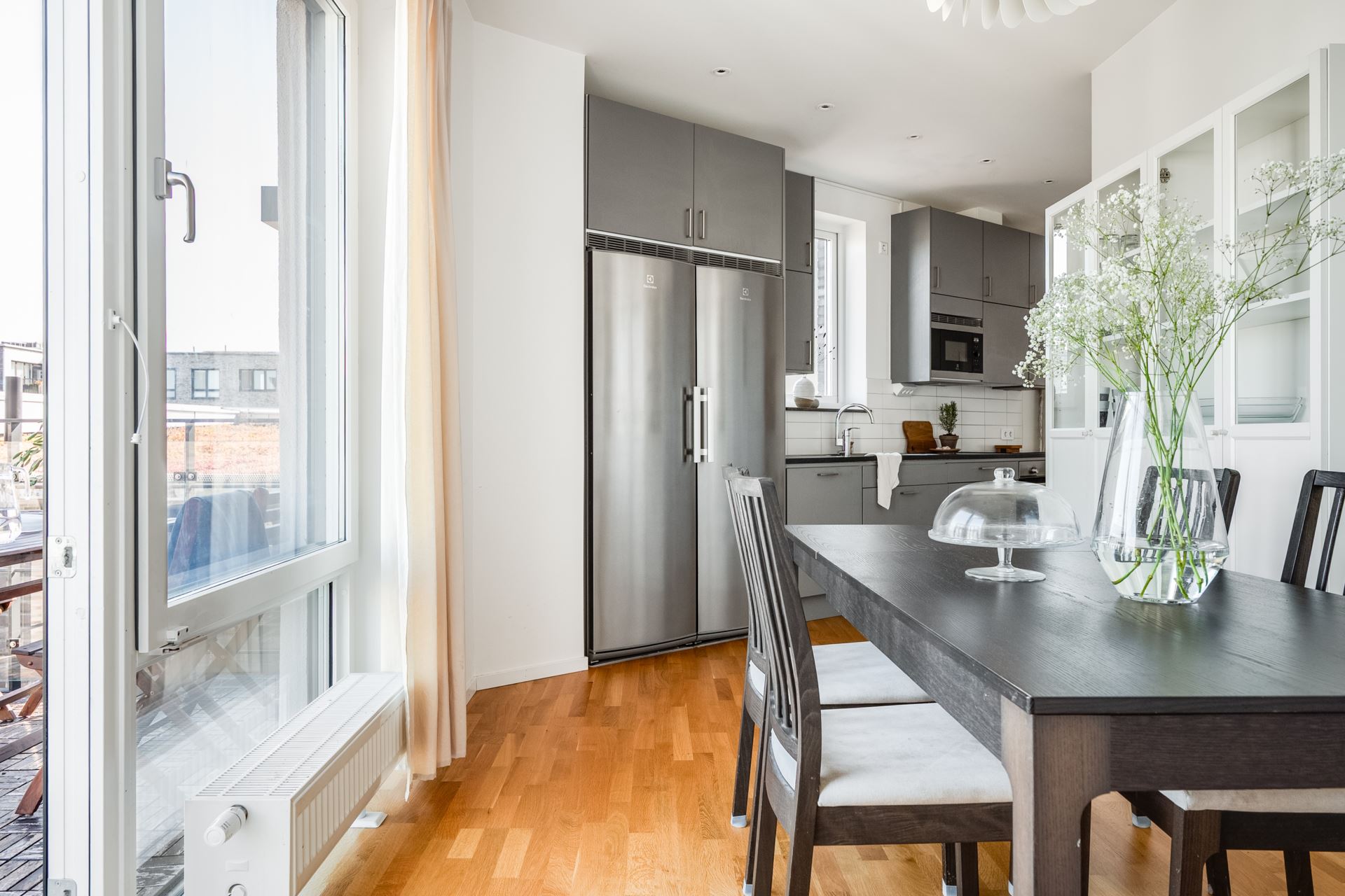 Vidare öppnar lägenheten upp med köket som bjuder på fantastisk rymd och plats för ett stort matbord. Stilrent mörkgråa köksluckor (Vedum) med svarta beslag kombinerat med svart bänkskiva och vitt kakel. Köket är utrustat med kyl och frys i fullhöjd (rostfritt), induktionshäll, ugn, köksfläkt, inbyggd mikrovågsugn, samt integrerad diskmaskin. Dessutom gott om plats med skåpsförvaring och utmärkta arbetsytor. Spotlights under väggskåpen och infällda spotlights i tak. Plats för större köksbord finns också och från köket når vi även lägenhetens andra utemiljö, balkongen. Belägen i österläge kan vi här avnjuta frukosten tillsammans med morgonsolen.