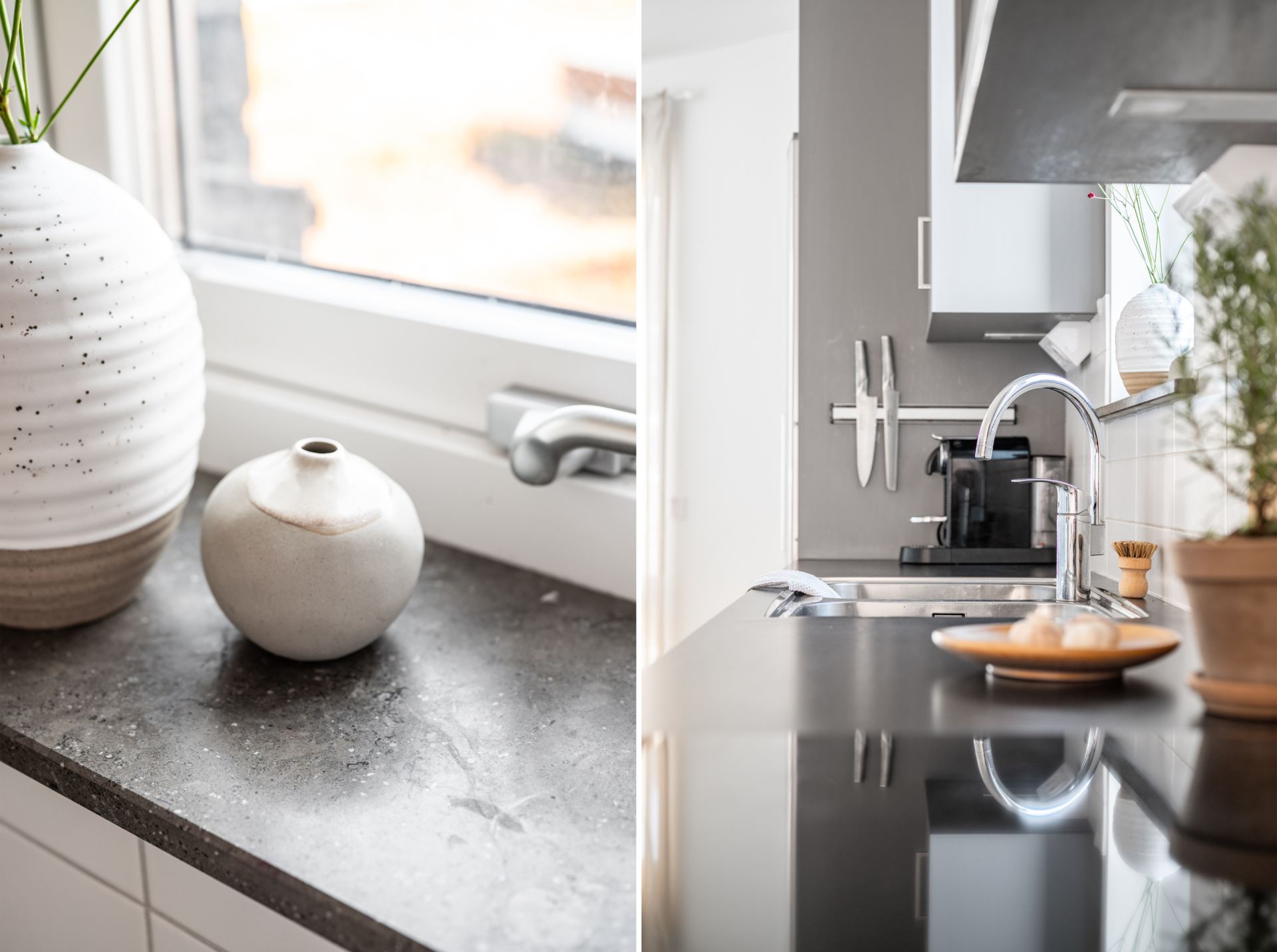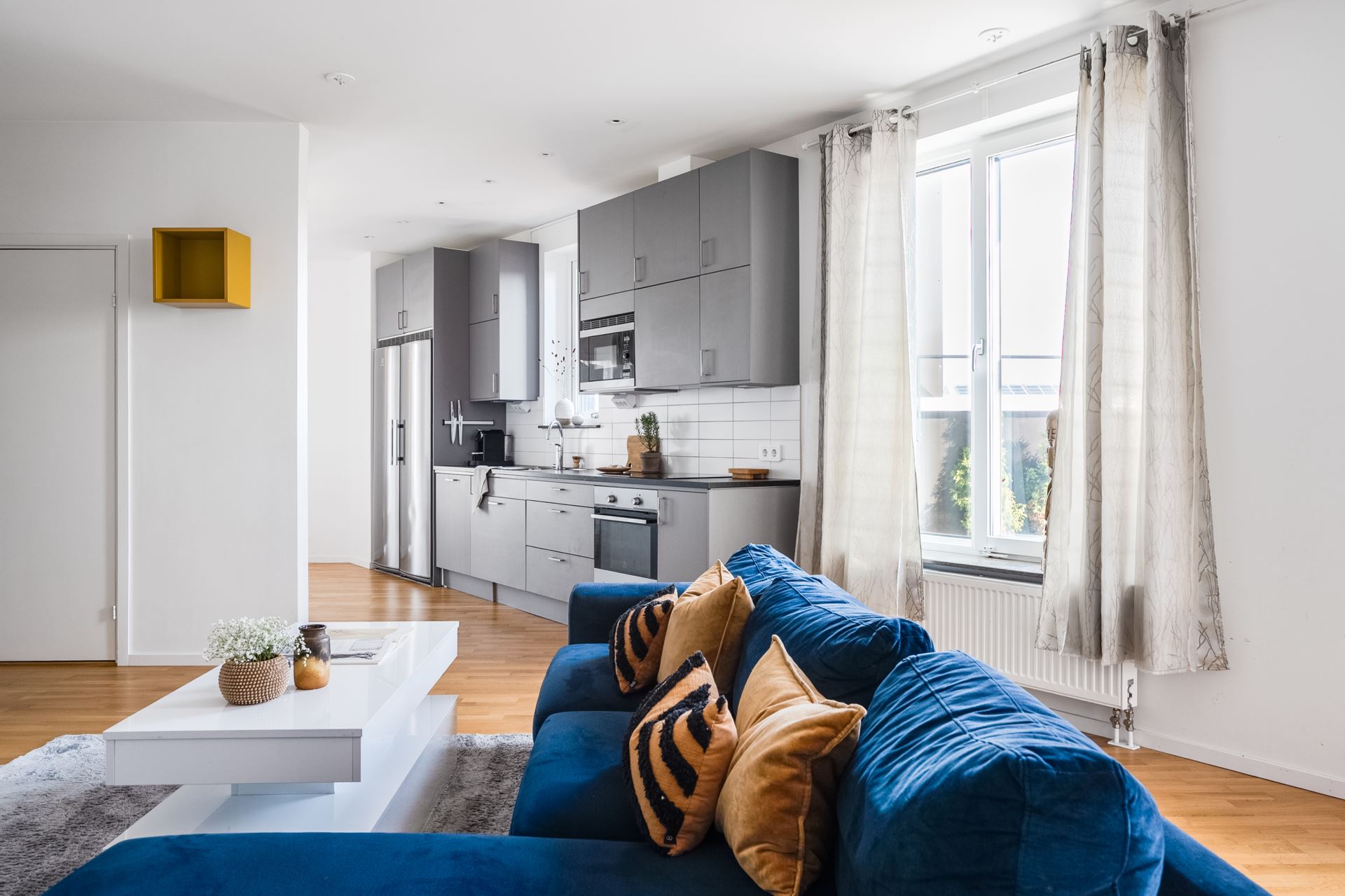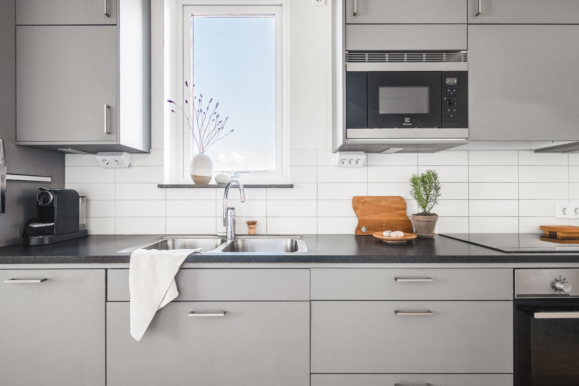 Vidare öppnar lägenheten upp med köket som bjuder på fantastisk rymd och plats för ett stort matbord. Stilrent mörkgråa köksluckor (Vedum) med svarta beslag kombinerat med svart bänkskiva och vitt kakel. Köket är utrustat med kyl och frys i fullhöjd (rostfritt), induktionshäll, ugn, köksfläkt, inbyggd mikrovågsugn, samt integrerad diskmaskin. Dessutom gott om plats med skåpsförvaring och utmärkta arbetsytor. Spotlights under väggskåpen och infällda spotlights i tak. Plats för större köksbord finns också och från köket når vi även lägenhetens andra utemiljö, balkongen. Belägen i österläge kan vi här avnjuta frukosten tillsammans med morgonsolen.