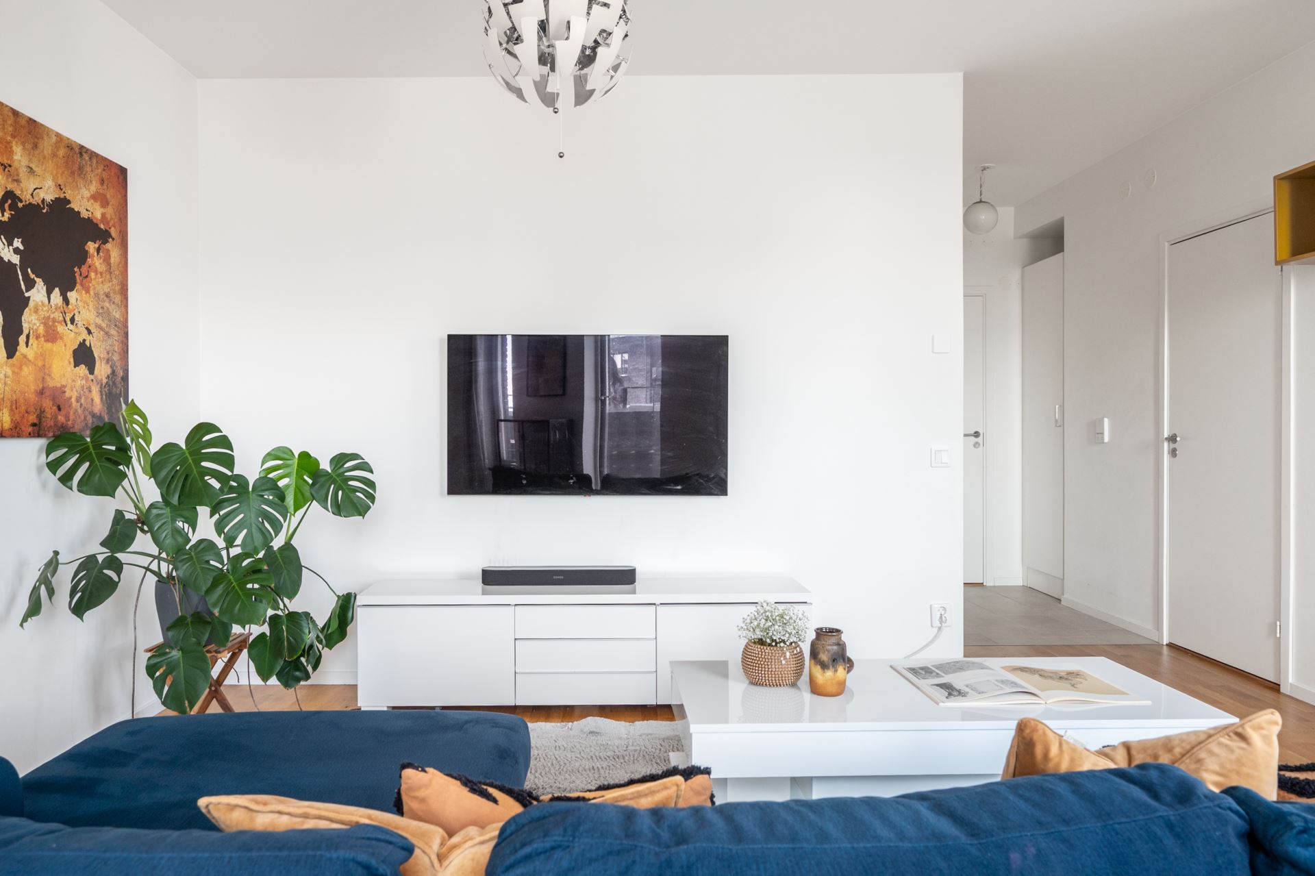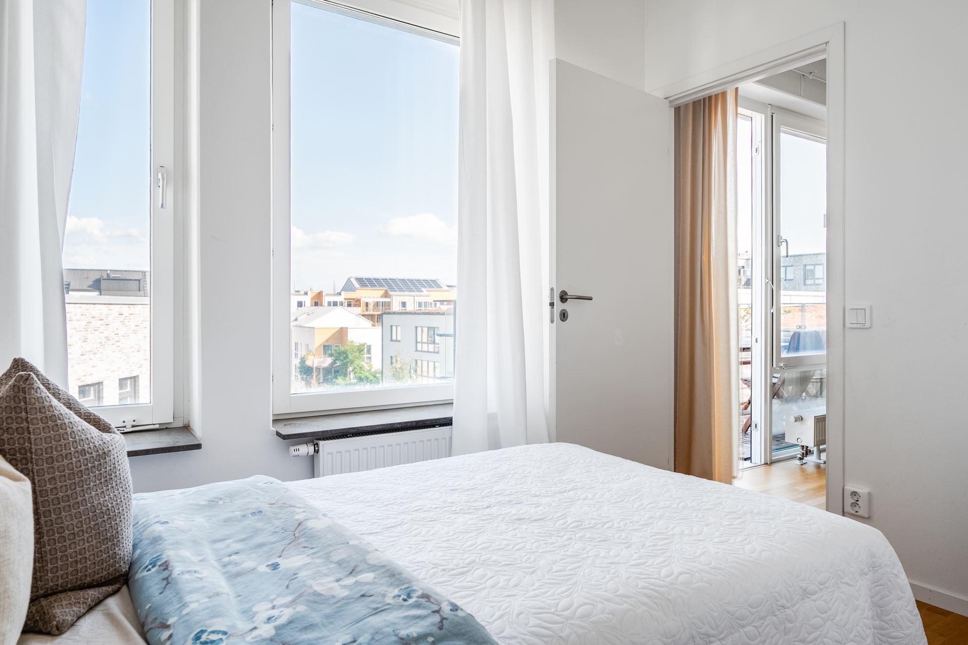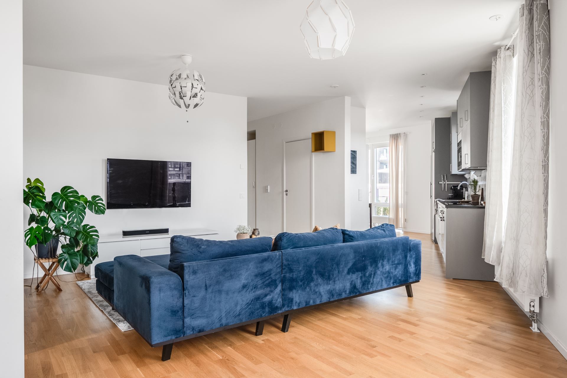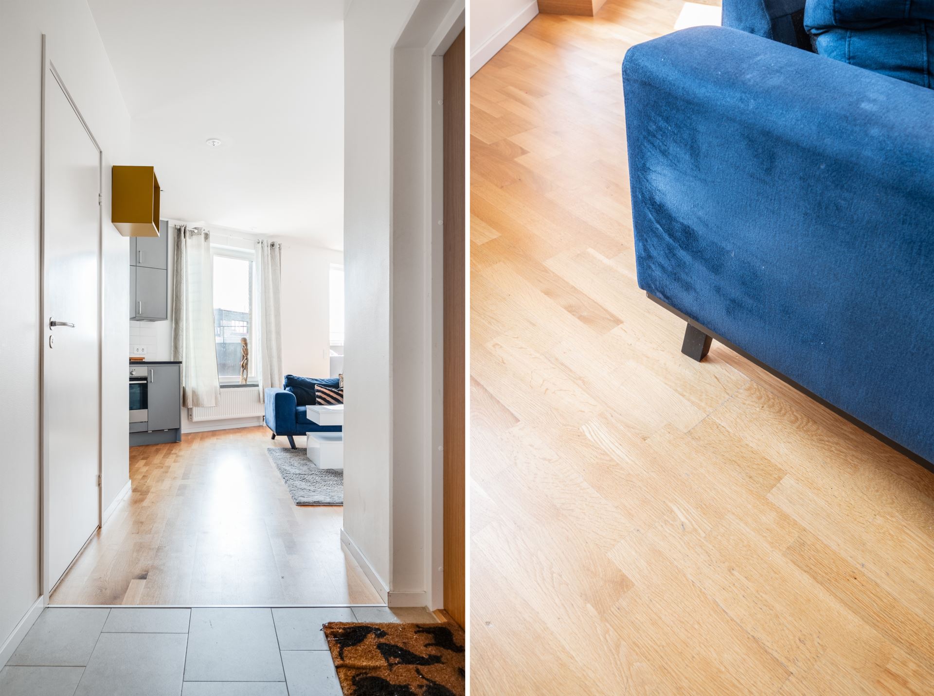 Vi tar hissen från markplan högst upp i huset, till femte våningen, där vi välkomnas in i denna otroligt ljusa fyrarummare. På golvet vilar smakfullt sandfärgade klinkers, vilket sedan övergår till mattlackad enstavsparkett i ek som återfinns i hela bostaden tillsammans med mestadels vita väggar. Plats för avhängningsmöjligheter på vänster sida och vidare in i hallen finns dessutom plats för extra hallmöbel.
