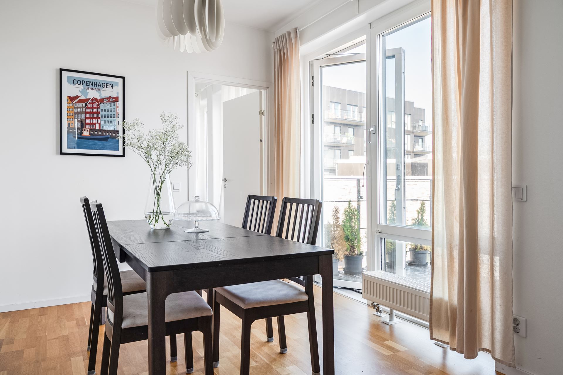 Vardagsrummet sammanlänkas på ypperligt vis med köket och rymmer plats för större soffgrupp. Härifrån når vi dessutom utgången till lägenhetens alldeles egna takterrass, belägen i soligt söderläge och en plats att på privat läge kunna njuta av både utsikten och lugnet. Här kan vi njuta av många soltimmar och underbar utsikt på Hyllies absoluta toppläge!