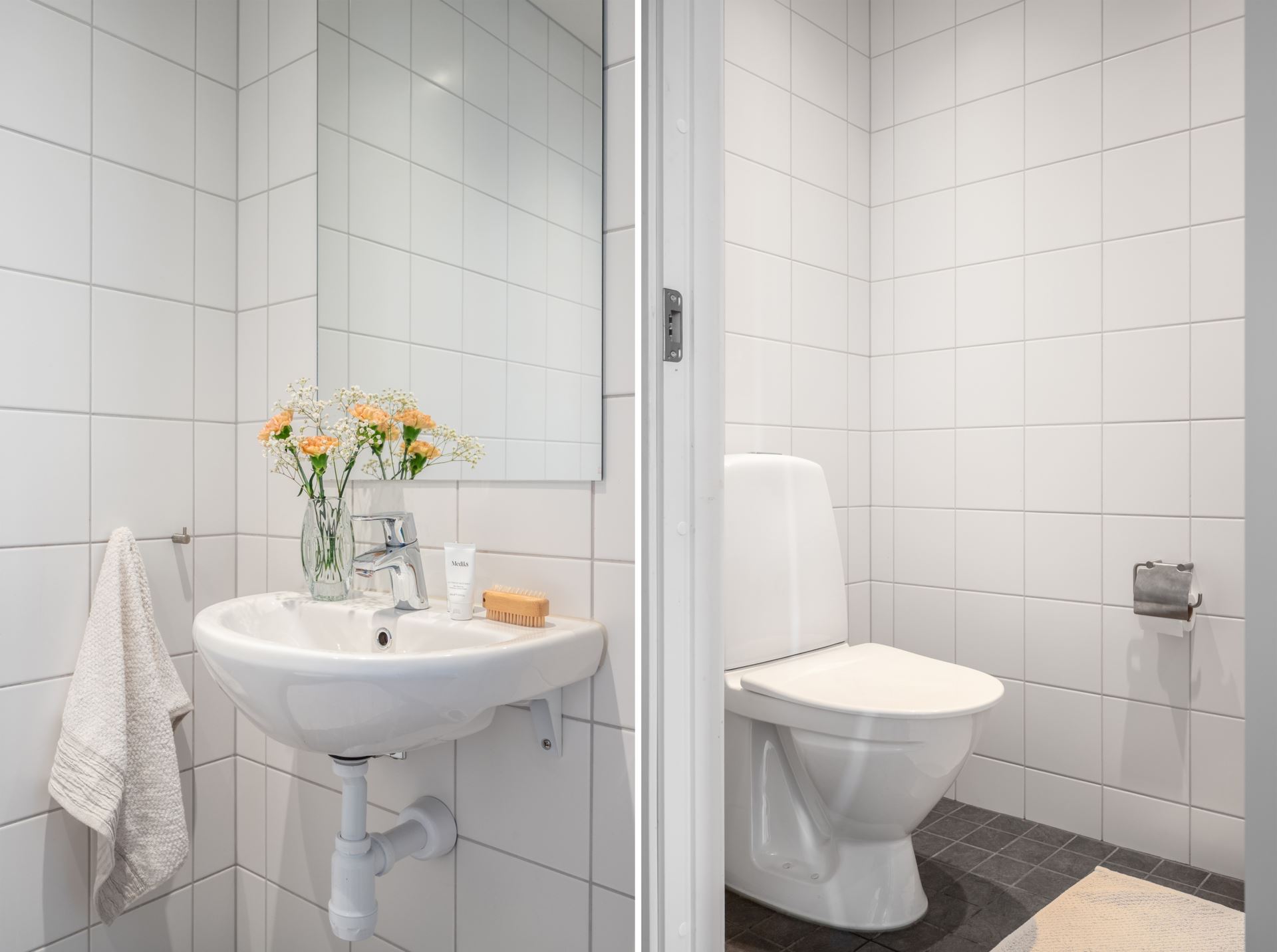 Gäst-wcn är även detta i helkaklat utförande, där gråa klinkers kombineras med ljusare kakel på väggarna. Utrustat med spegel, handfat med kommod och wc.