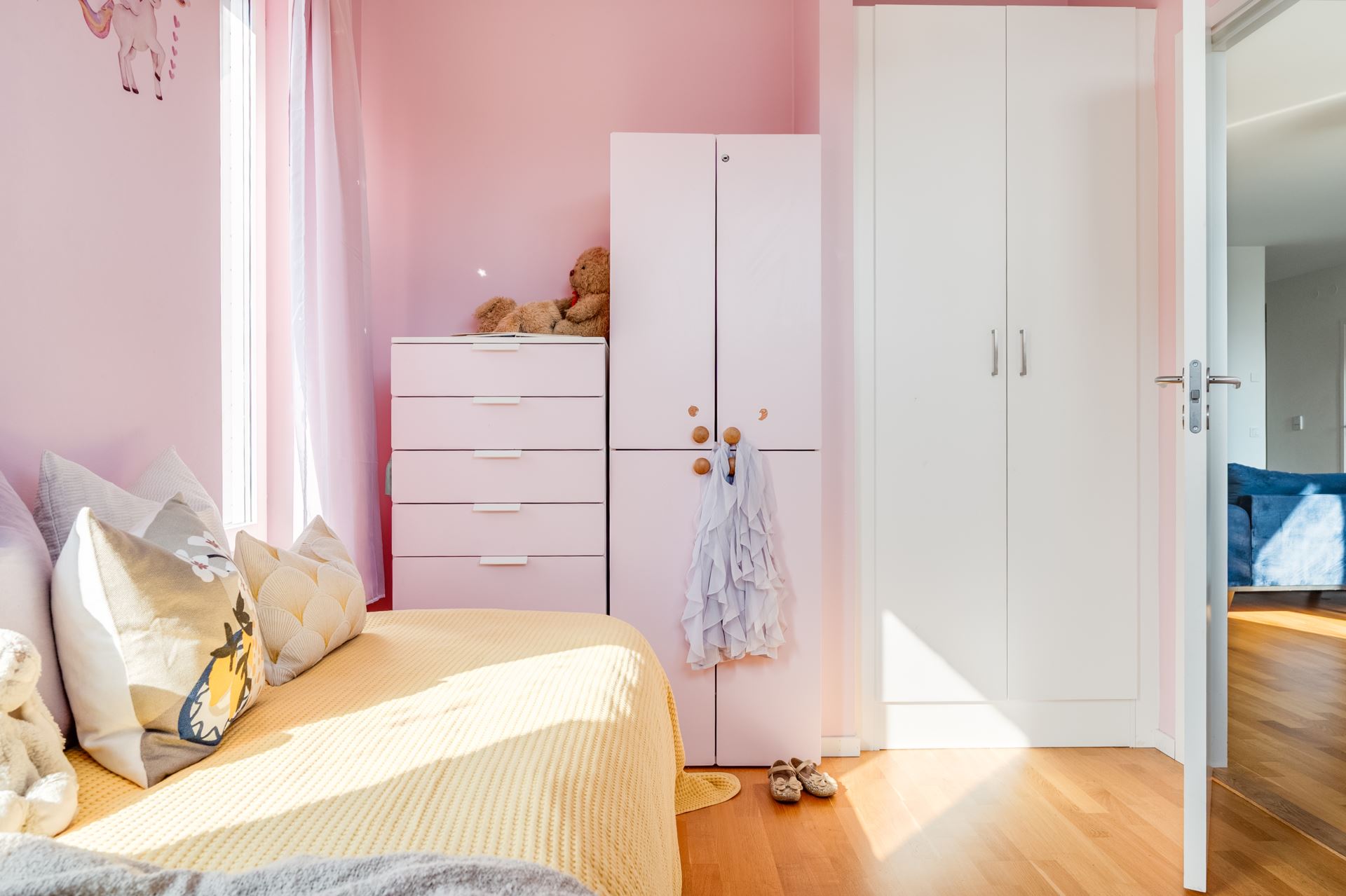 Vägg i vägg med sovrummet finns det andra sovrummet som idag används som barnrum. Rosa väggar tillsammans med mattlackad ekparkett och här finns plats för säng, sängbord och skrivbord. Fönster i två väderstreck gör att rummet känns extra trivsamt.