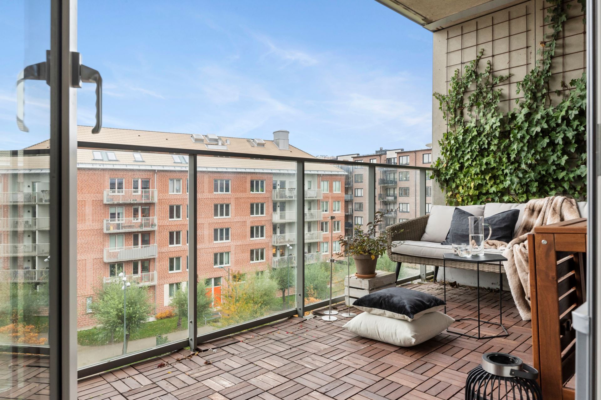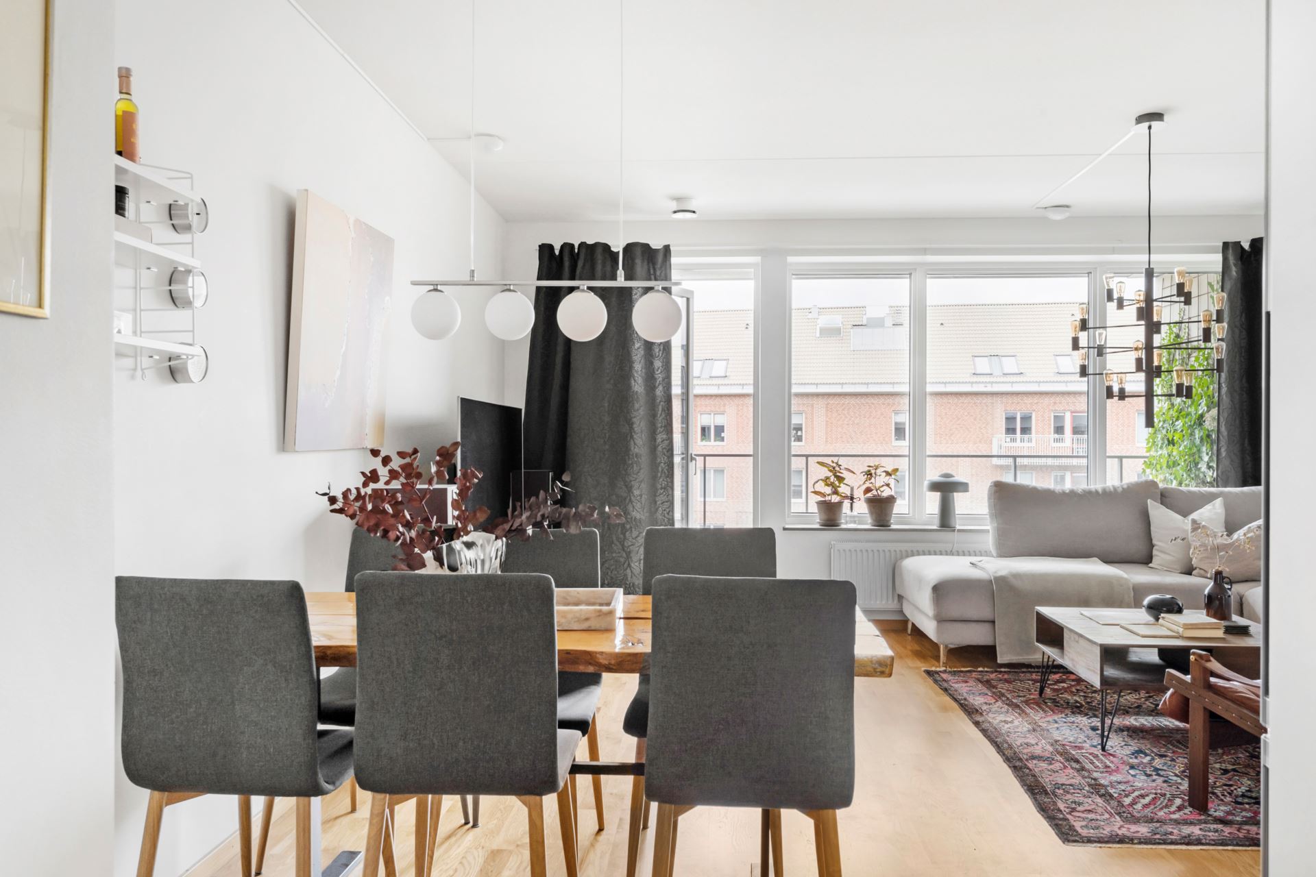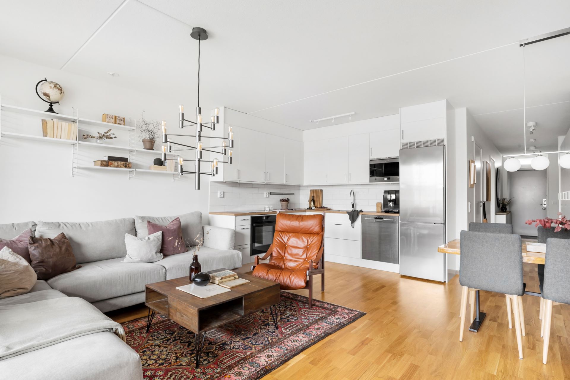 Lägenheten öppnar upp med ljus och rymd tack vare stora fönsterpartier. Vardagsrummet bjuder på gott om plats för större soffgrupp och plats för större matbord mot köksdelen. Från vardagsrummet nås dessutom den sköna balkongen belägen i västerläge. Här kan vi under njuta av solen från eftermiddag till kväll!