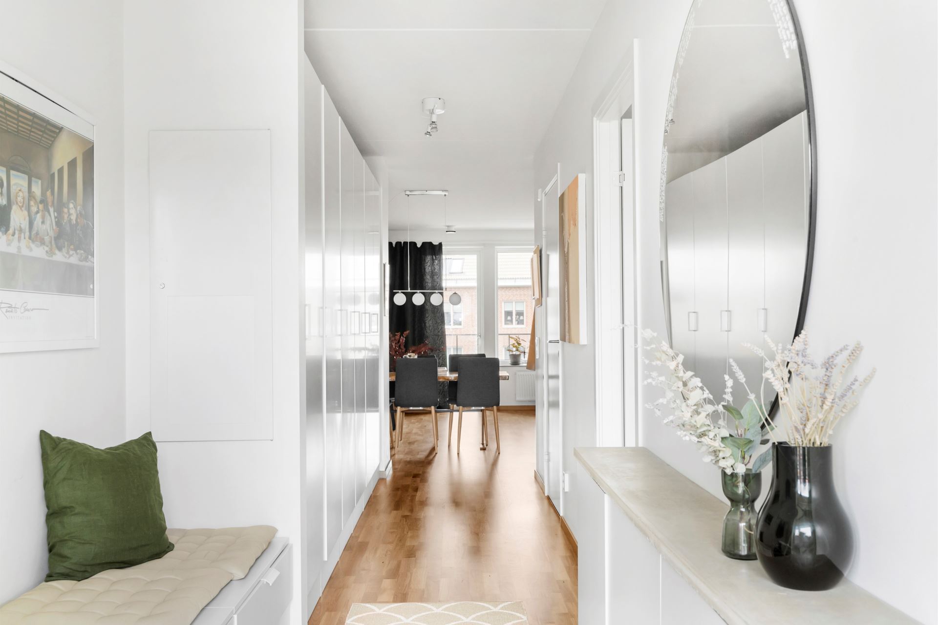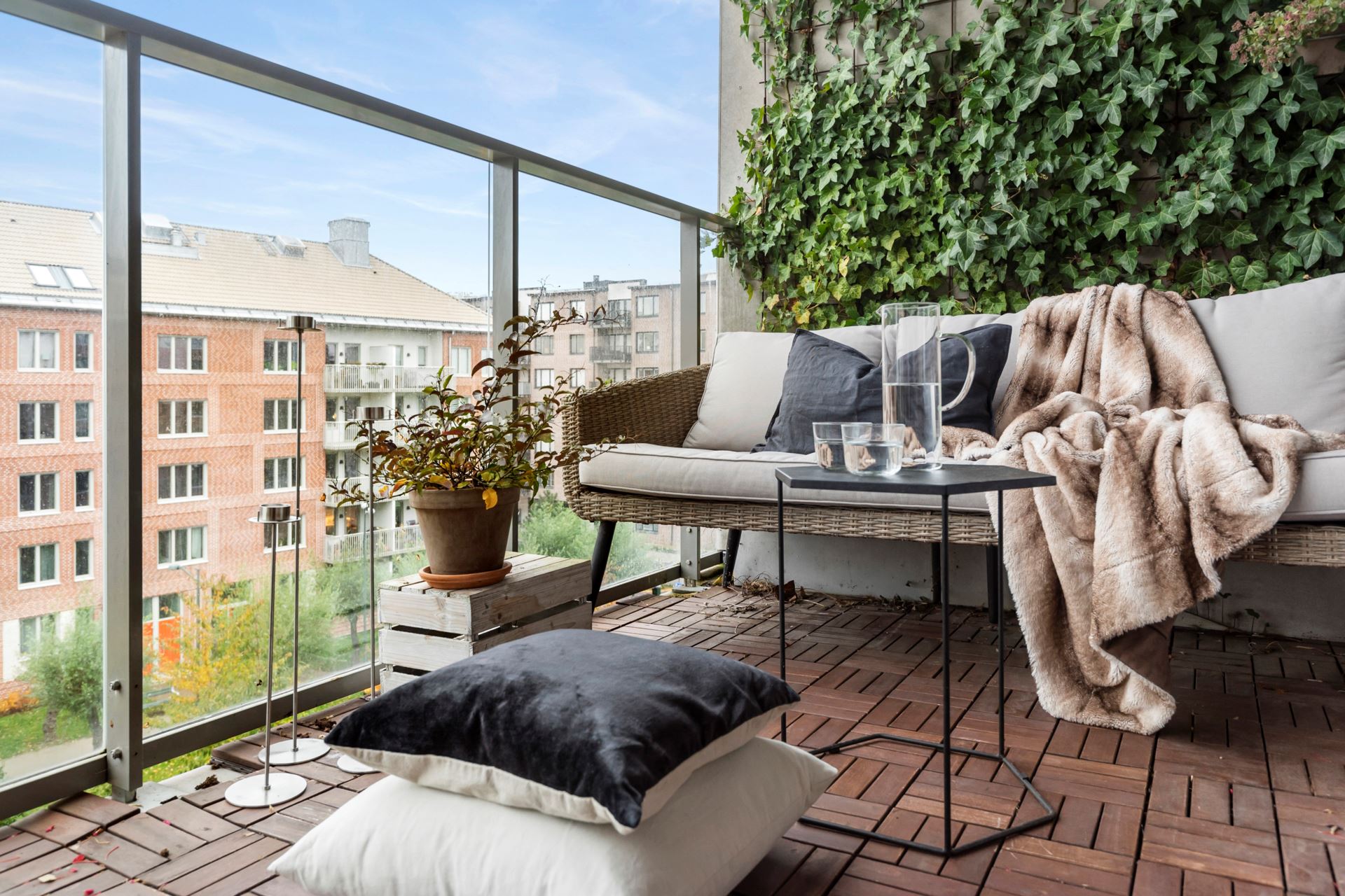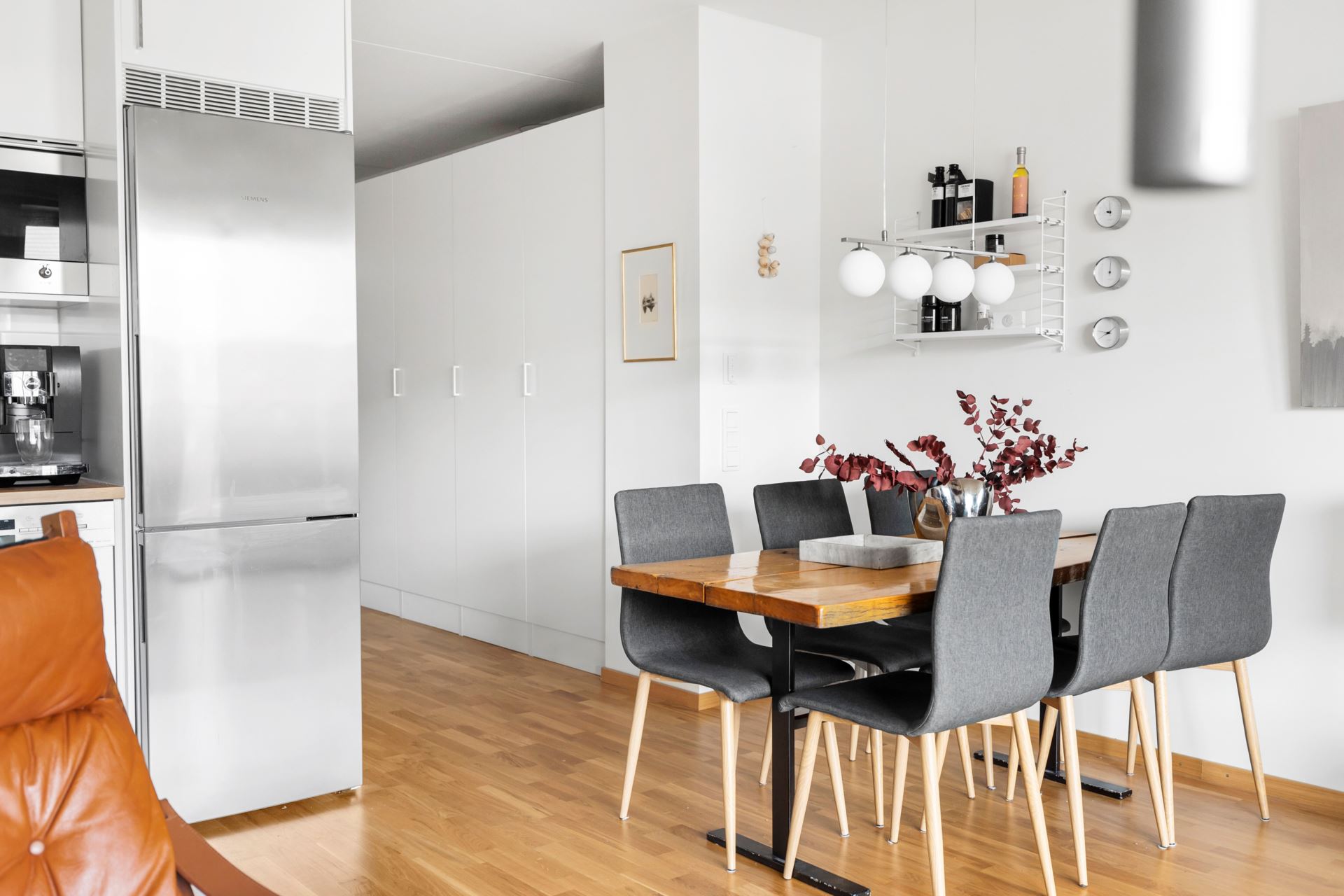 Lägenheten öppnar upp med ljus och rymd tack vare stora fönsterpartier. Vardagsrummet bjuder på gott om plats för större soffgrupp och plats för större matbord mot köksdelen. Från vardagsrummet nås dessutom den sköna balkongen belägen i västerläge. Här kan vi under njuta av solen från eftermiddag till kväll!