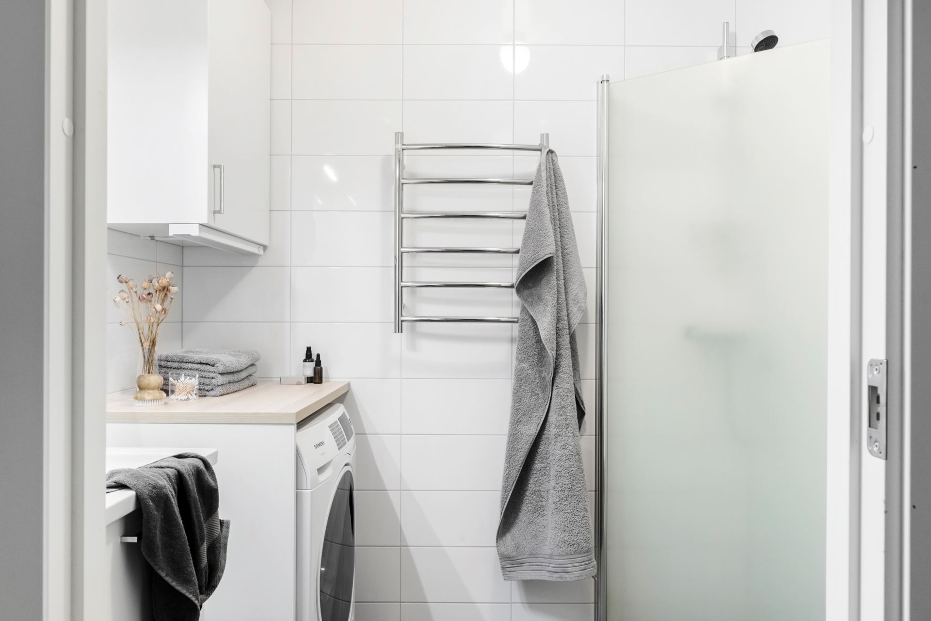 Helkaklat badrum i sobra färgval med mörkgrått kakel på väggarna tillsammans med mörka klinkers på golv. Badrummet är utrustat med wc, dusch bakom glasvägg, handfat med kommod, spegel, kombimaskin för tvätt,- och tork. Ovanför finns dessutom ytterligare arbetsyta och skåpsförvaring (Vedum).
