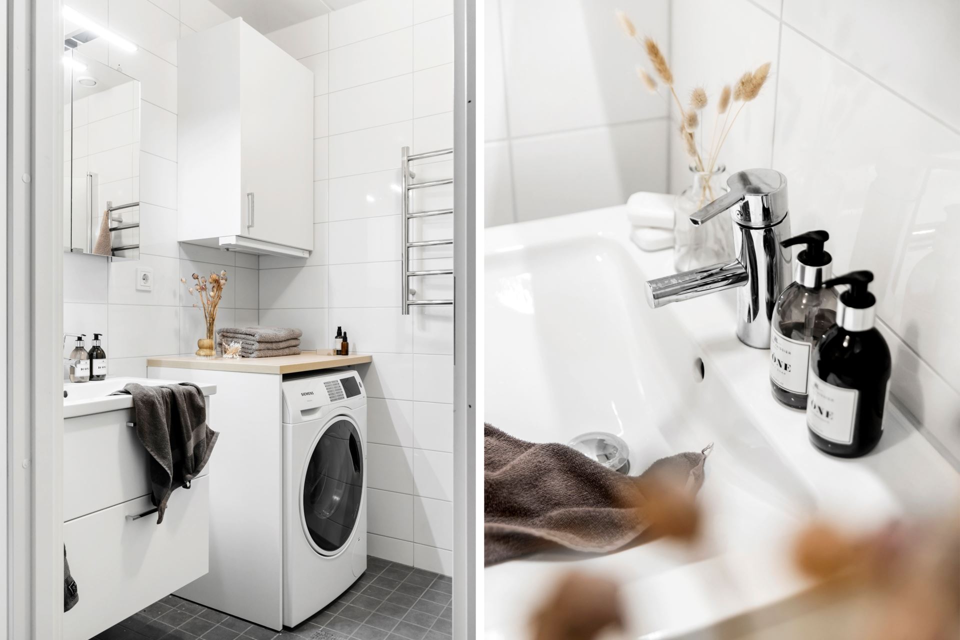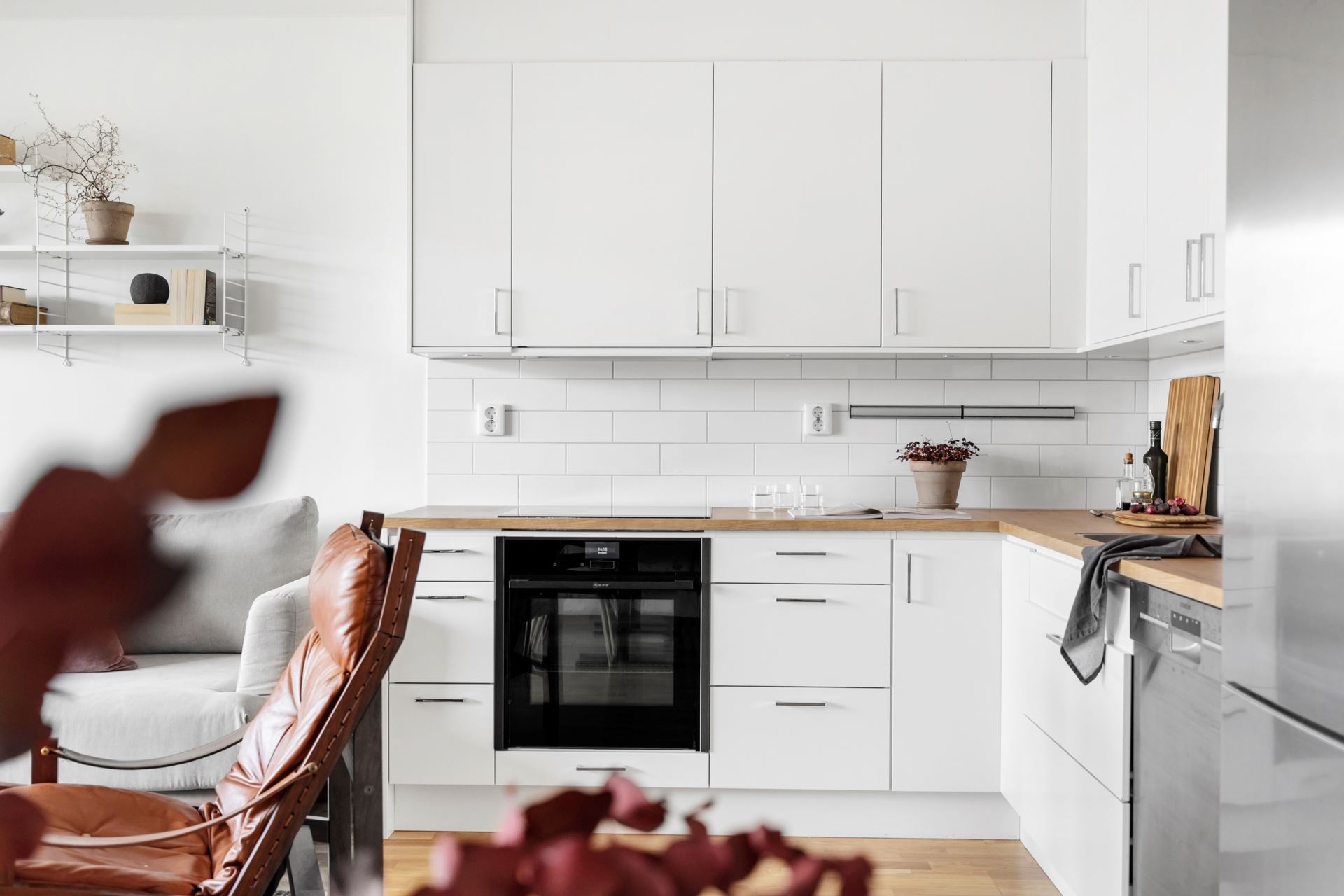 Smakfullt vita köksluckor (Vedum) kombineras med vitt kakel och bänkskiva i laminat. Köket bjuder på gott om plats till både arbetsytor och förvaring bakom skåp och luckor. Köket är utrustat med diskmaskin, delad kyl och frys, induktionshäll och mikrovågsugn (Smeg). Samtlig utrustning från Siemens. Fläkt (Franke).