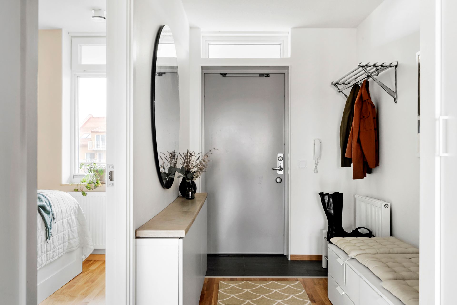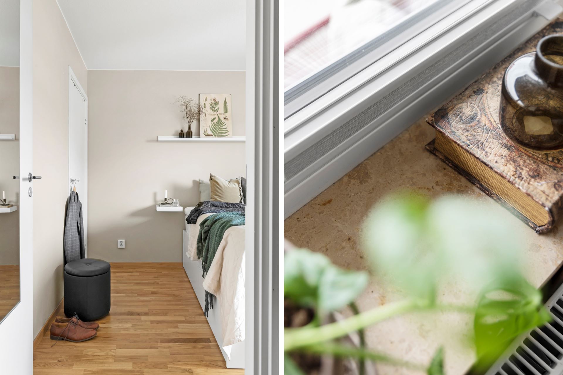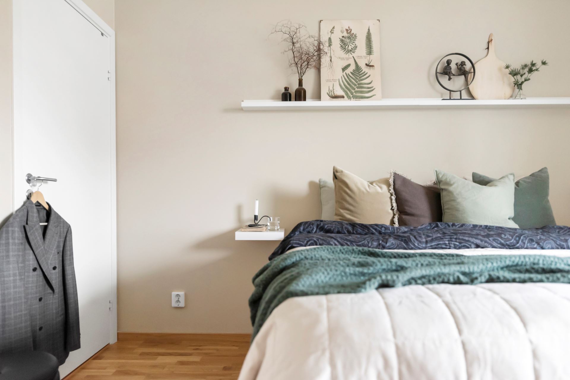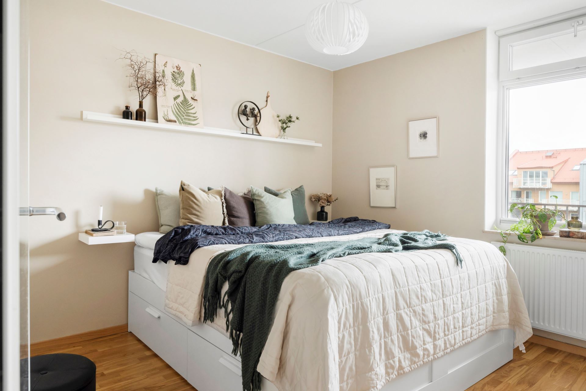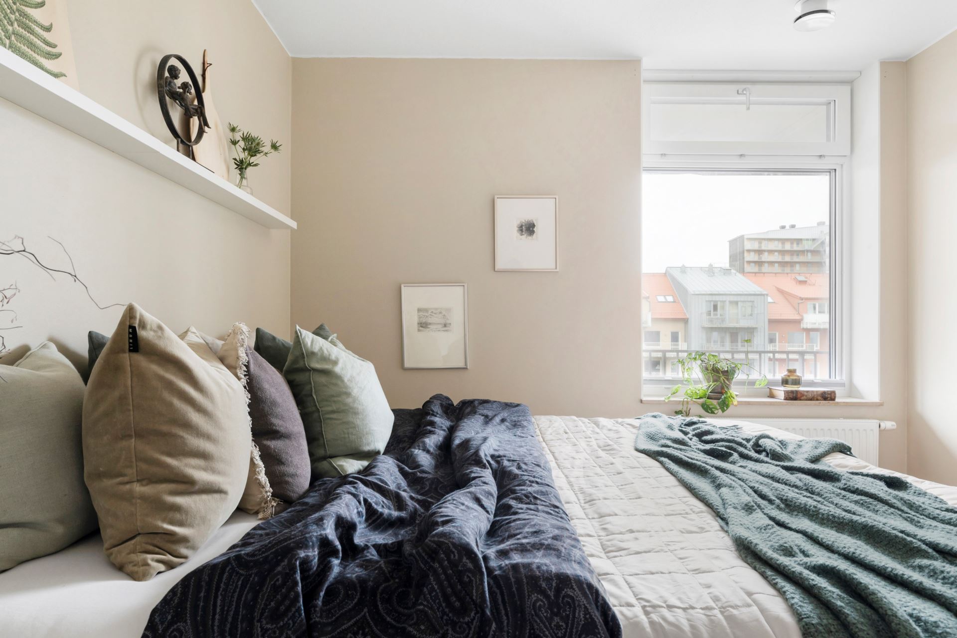 På vänster sida vid entrén finns sovrummet som är av generösa kvadratmeter och som gott och väl rymmer plats för dubbelsäng, sängbord och mer därtill. Ytterligare förvaring för byrå eller liknande finns också. Från sovrummet nås lägenhetens walk in closet/förråd.