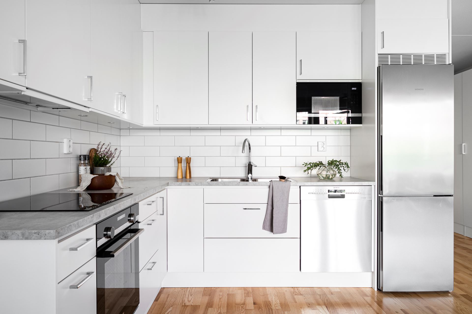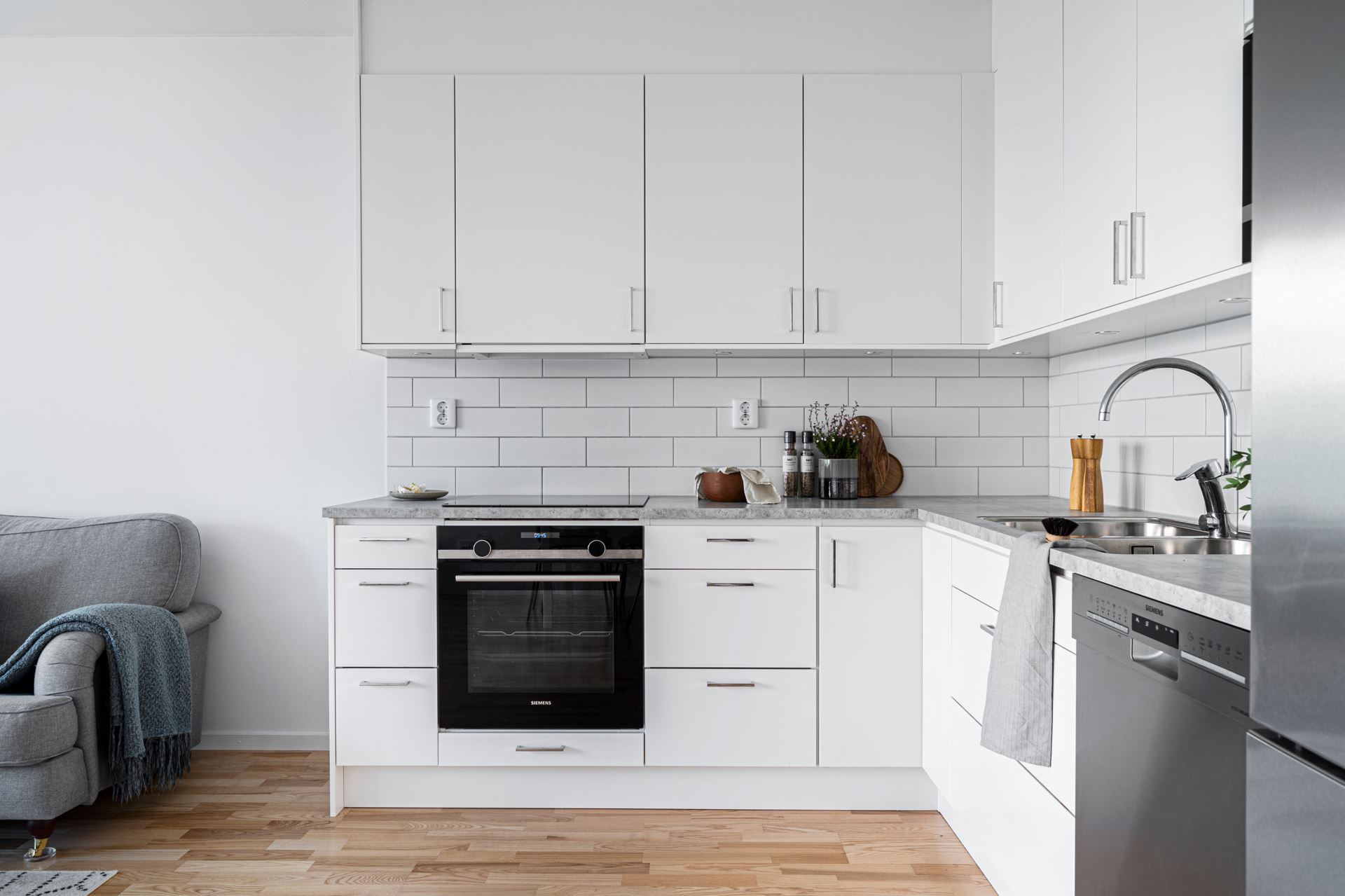 Kök och vardagsrum i öppen planlösning där köket bjuder på sobert vita köksluckor (Vedum) som kombineras med vitt kakel och bänkskiva i ljus laminat. Köket är utrustat med diskmaskin, kul och frys, ugn, mikro, spishäll och fläkt. Samtliga utrustning från Siemens.