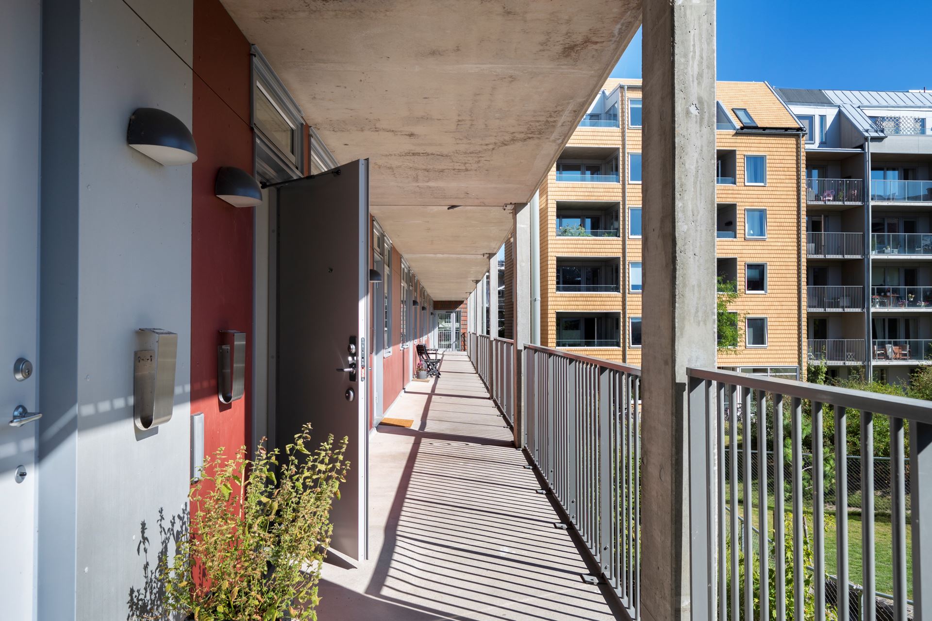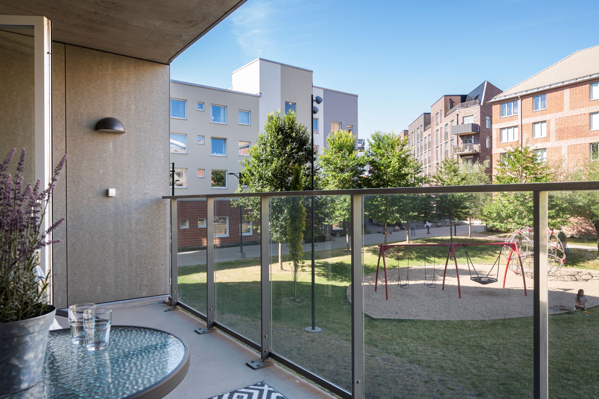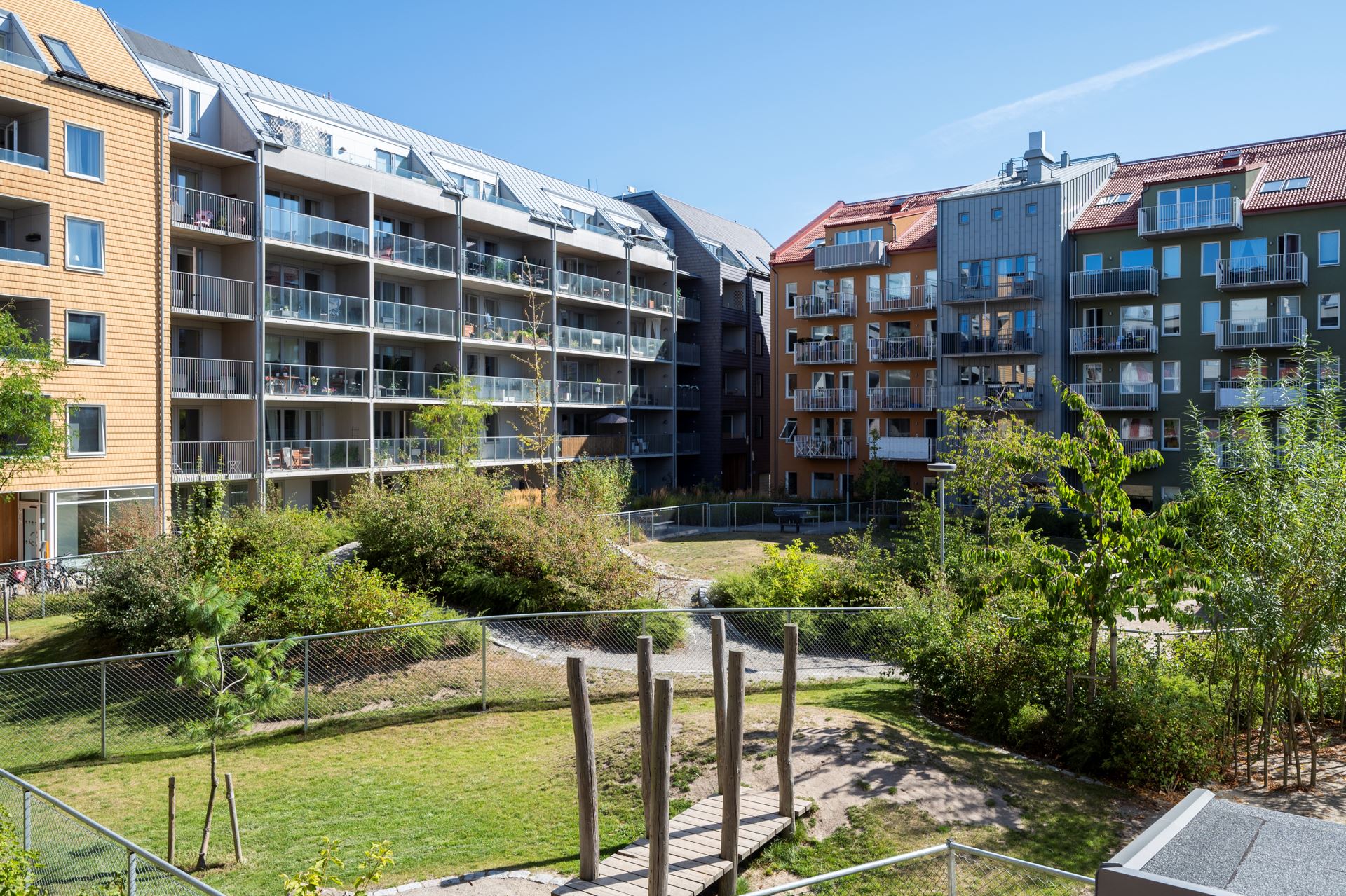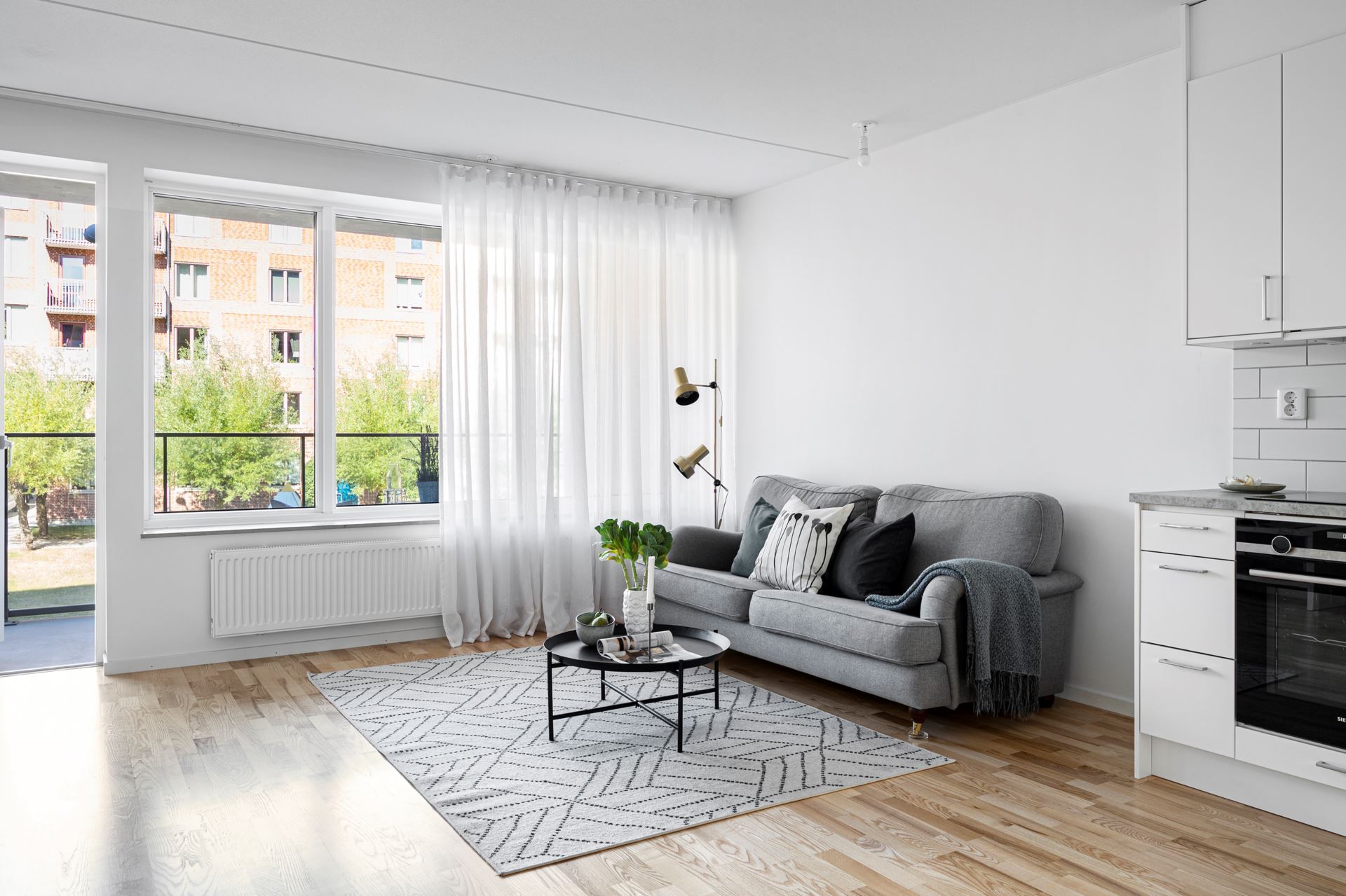 Vidare öppnar lägenheten upp med vardagsrummet som bjuder på ljus och rymd tack vare stora fönsterpartier. Här finns gott om plats för att enkelt kunna möblera med både matbord och större soffgrupp. Från vardagsrummet nås vidare det ovanligt stora balkongen, belägen i attraktivt västerläge. Här kan vi njuta av många soltimmar under dagen och tidig kväll.