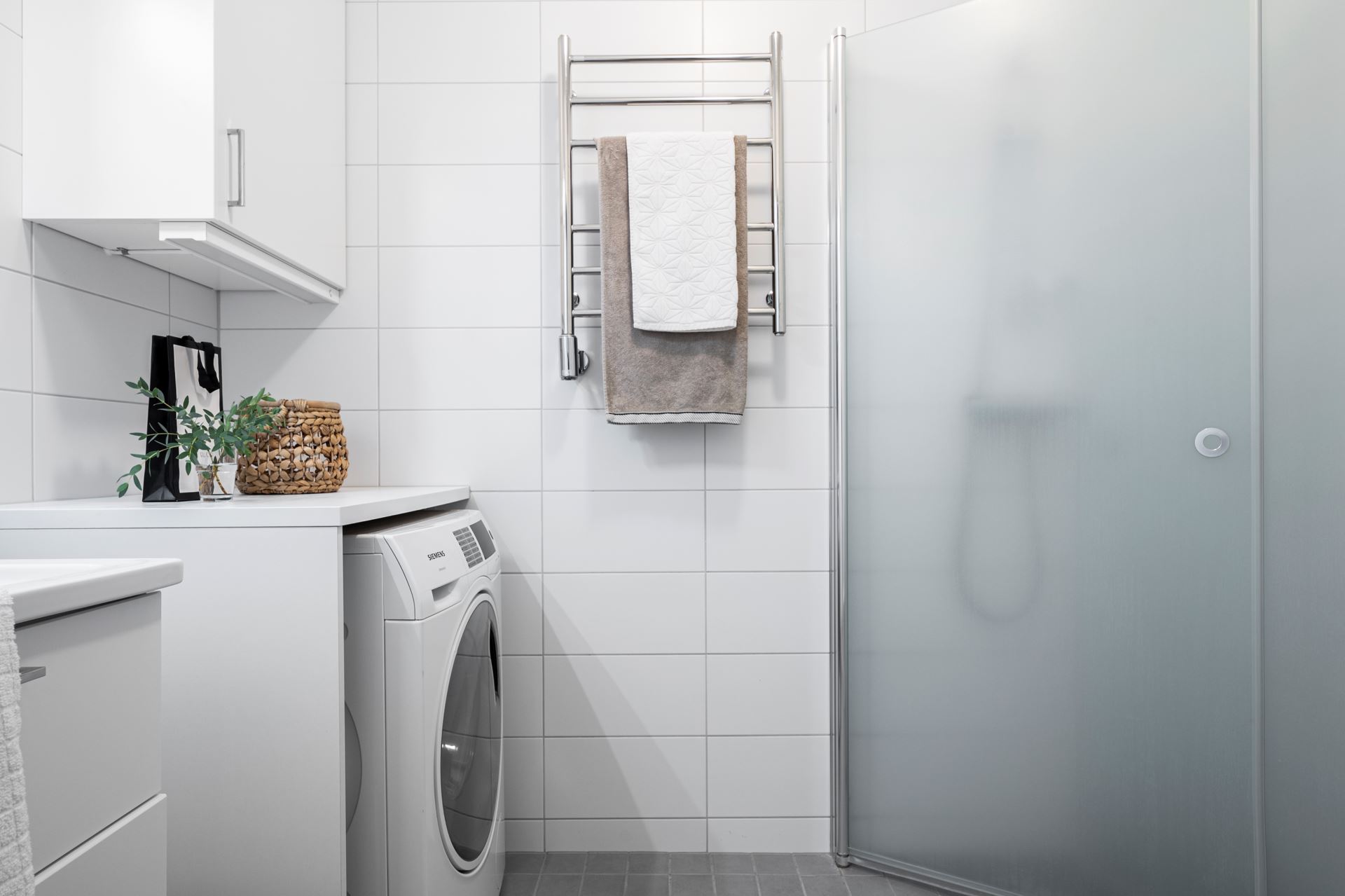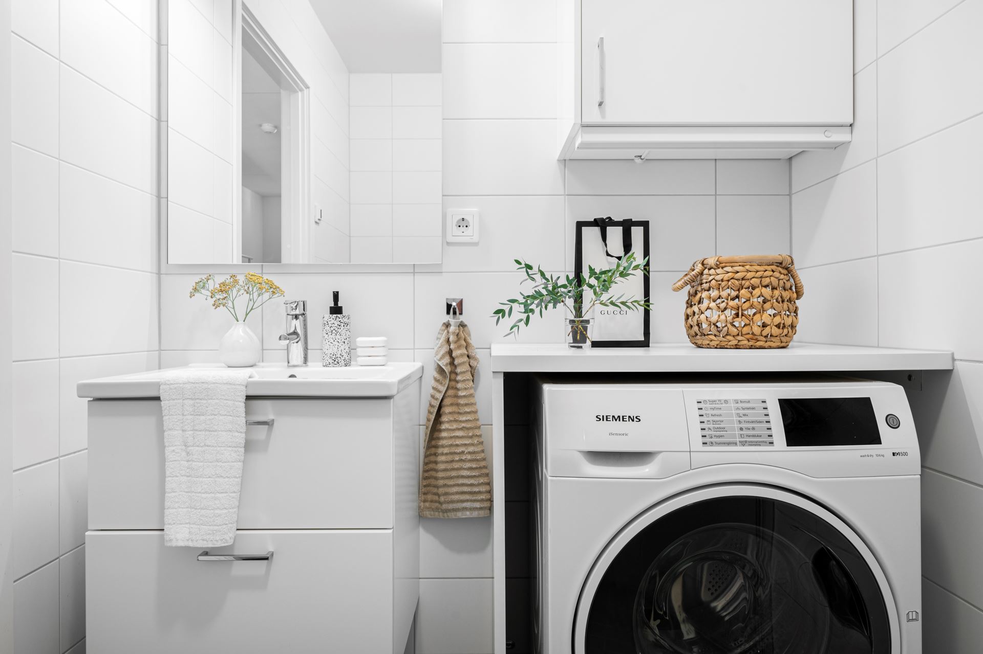Helkaklat badrum med vitt kakel på väggarna tillsammans med mörkare klinkers på golv. Badrummet är utrustat med dusch bakom glasvägg (frostad), handfat med kommod, spegel, wc, kombimaskin samt handdukstork. Ovanför tvätt,- och tork finns ytterligare arbetsyta och skåpsförvaring. Dessutom finns även golvvärme installerat, vilket skänker ytterligare komfort.
