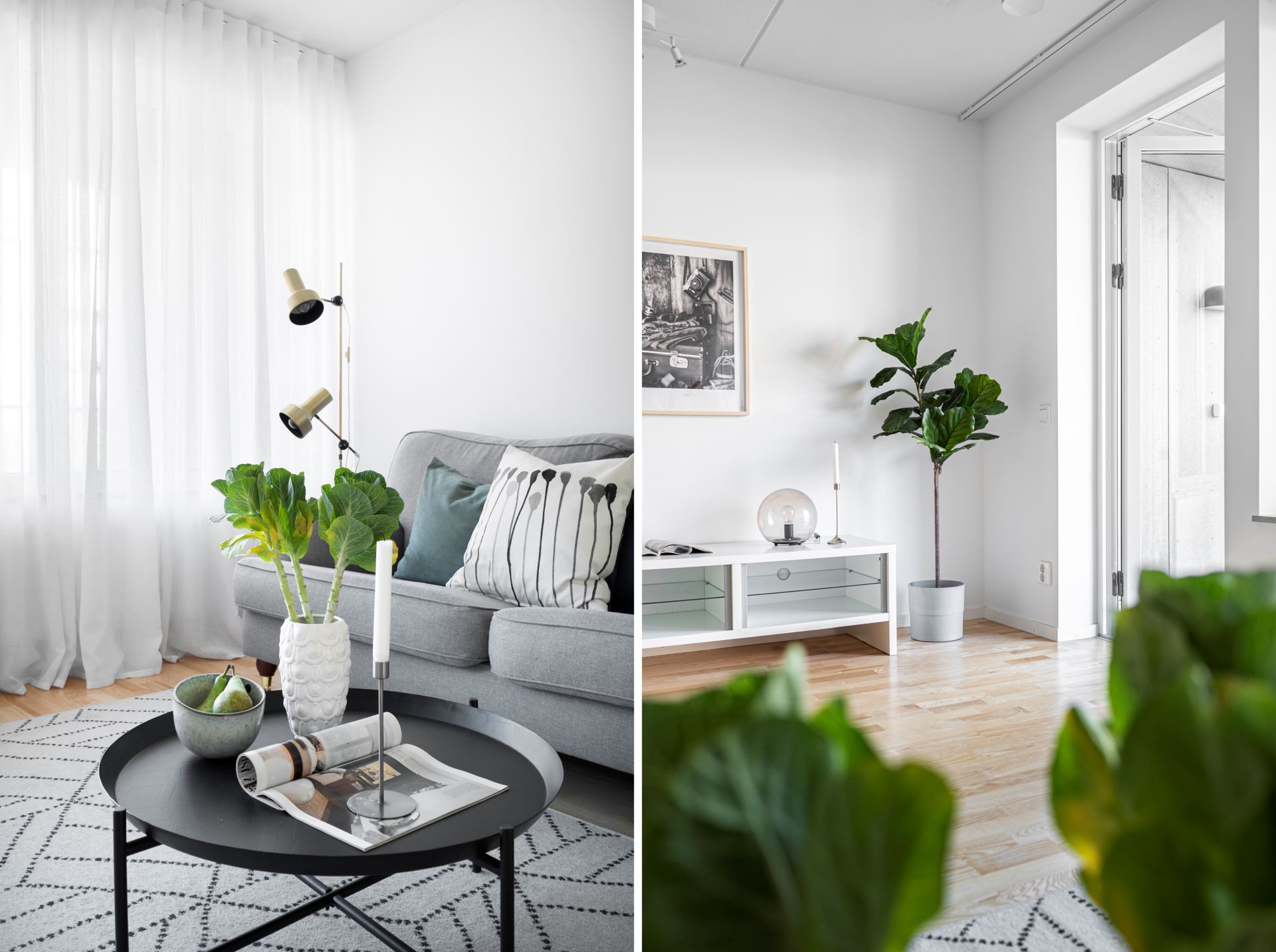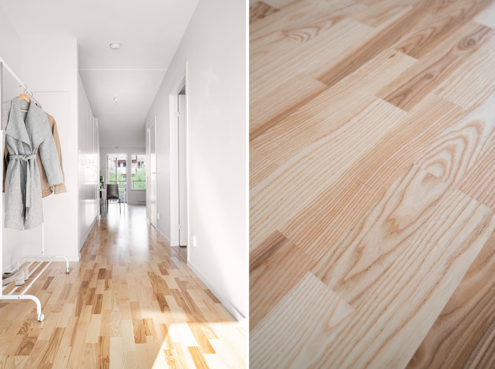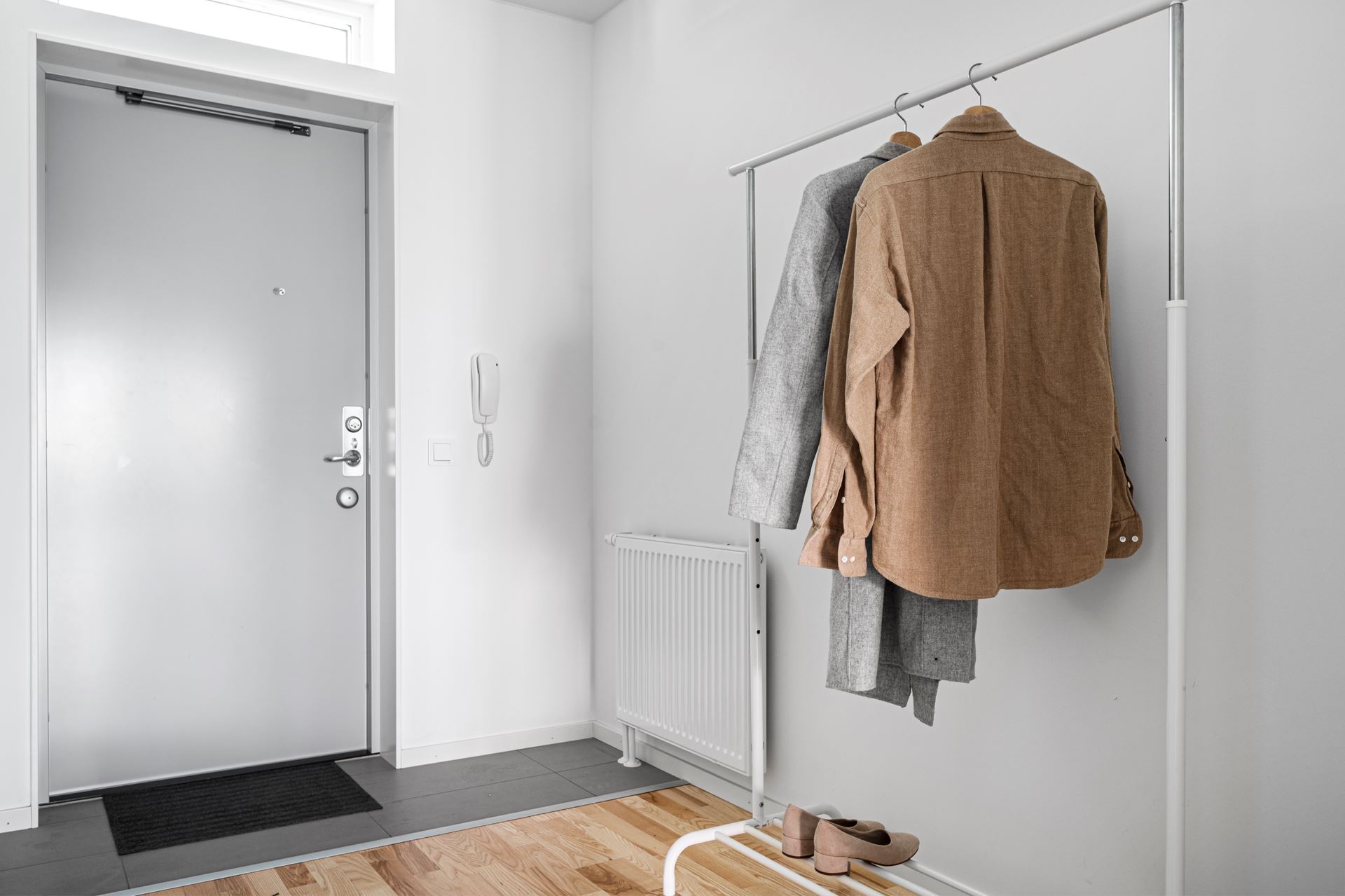 Vi tar hissen till andra våningen där vi välkomnas in i denna trivsamma tvårummare. I hallen finns mörkgråa klinkers på golv, vilket vidare övergår till vacker askparkett kombinerat med släta vita väggar som återfinns i hela bostaden. På vänster sida finns gott om plats för avhängningsmöjligheter och vidare in i hallen finns dessutom gott om plats till förvaring i flertalet garderober längs med vänster sida.