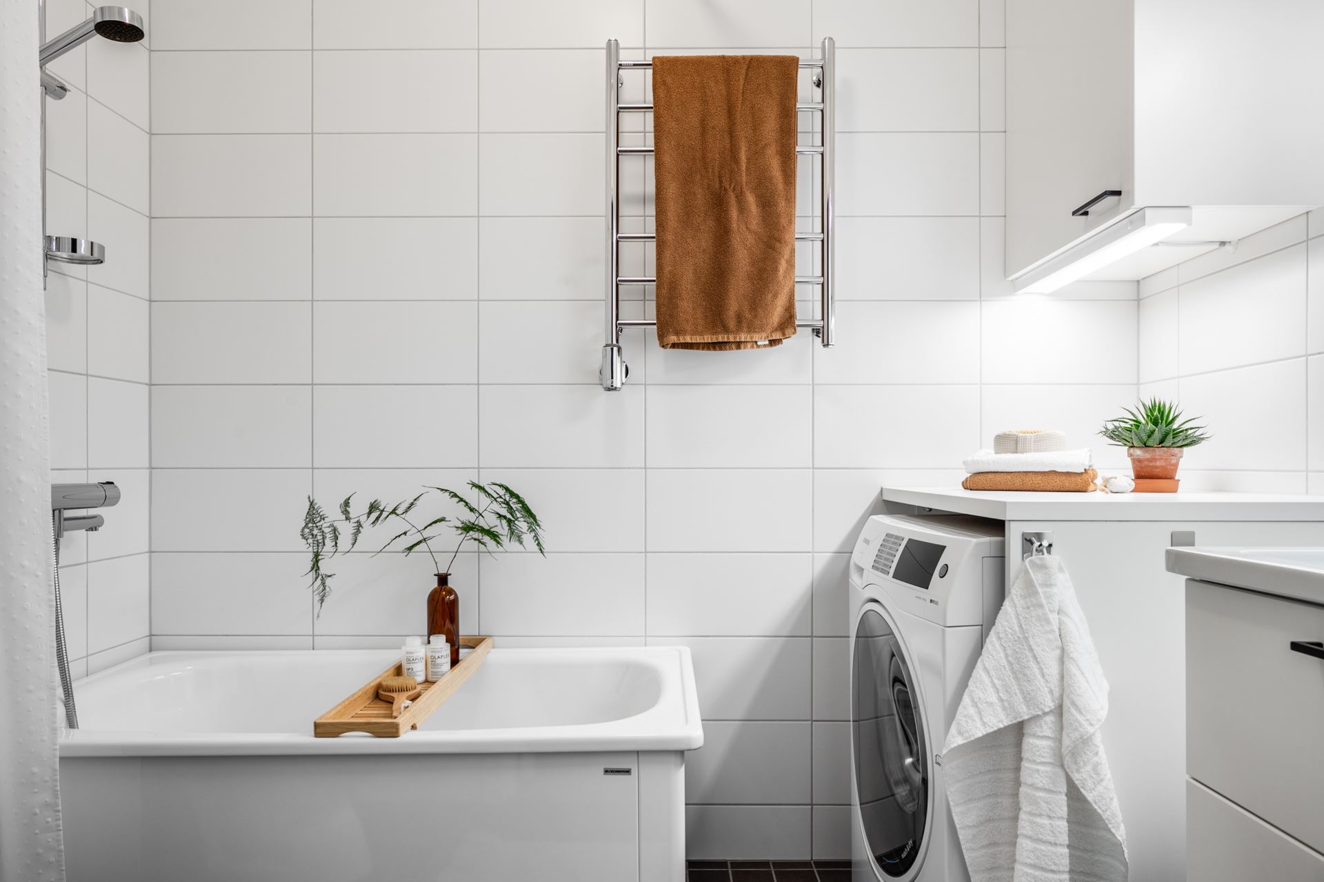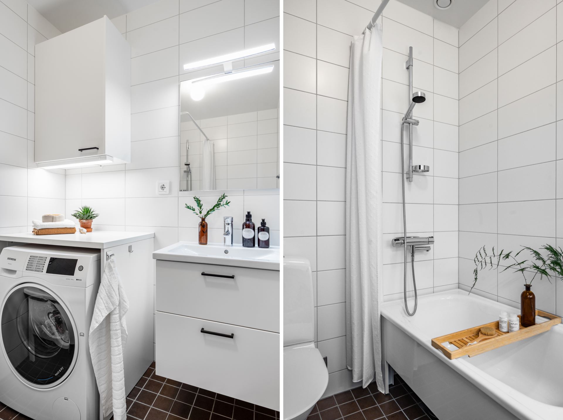 Helkaklat badrum i sobra färgval som harmonierar fint med varandra, bruna klinkers på golv tillsammans med vitt kakel på väggarna. Badrummet är utrustat med handfat med kommod, spegel, wc, badkar, handdukstork, kombimaskin för tvätt,- och tork samt skåpsförvaring och bänkyta ovanför.