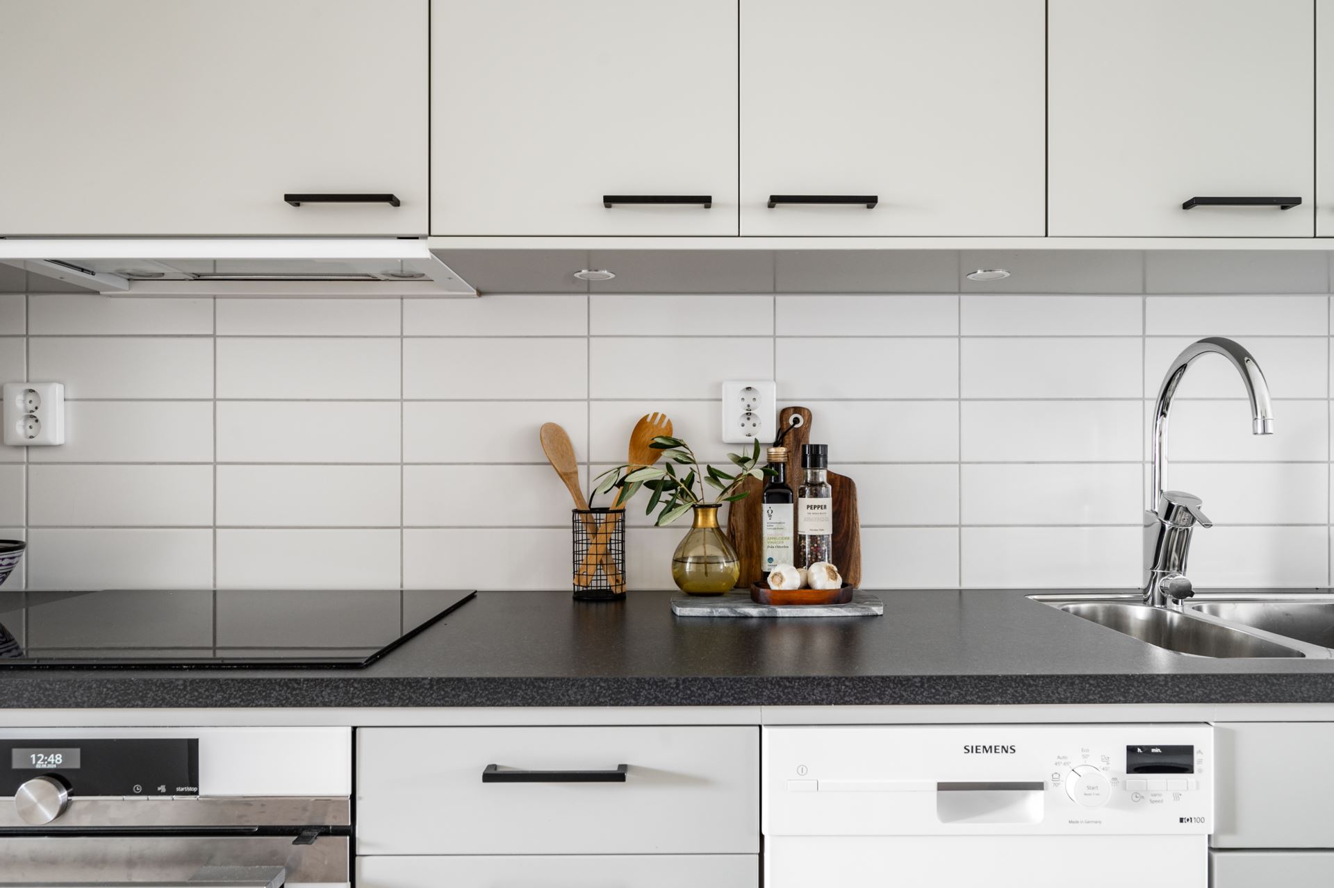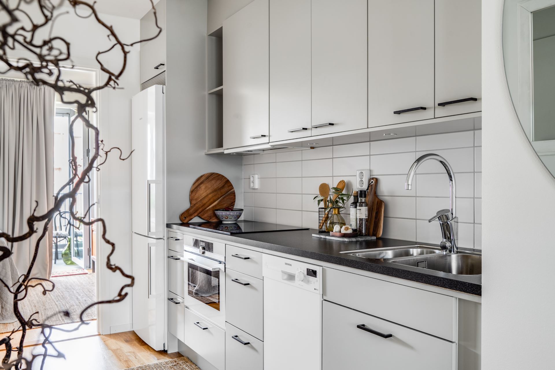 I passage mellan vardagsrum och sovrum finner vi köket som är oerhört välplanerat och yteffektivt. Kök från välrenommerade Vedum bjuder på utmärkt förvaring i skåp och lådor som frontas av tidlöst varmgråa köksluckor. Stilrent kök med bänkskiva i laminat som kombineras med vitt kakel på väggen. Köket är utrustat med diskmaskin, ugn med inbyggd mikro, spishäll (induktion), kyl/frys samt köksfläkt. Samtlig utrustning från Siemens. Spotlights finns även under överskåpen i köket.