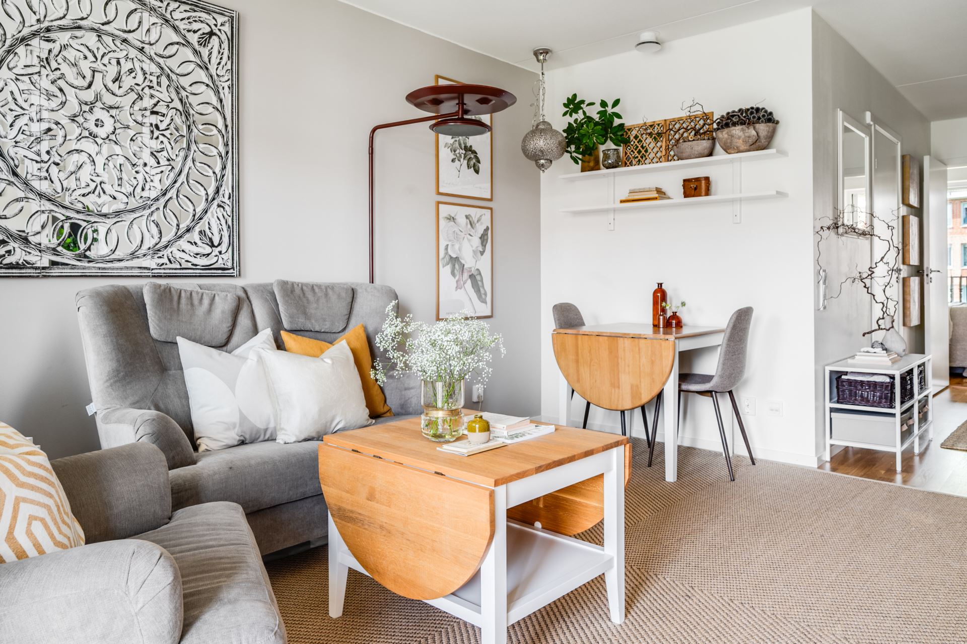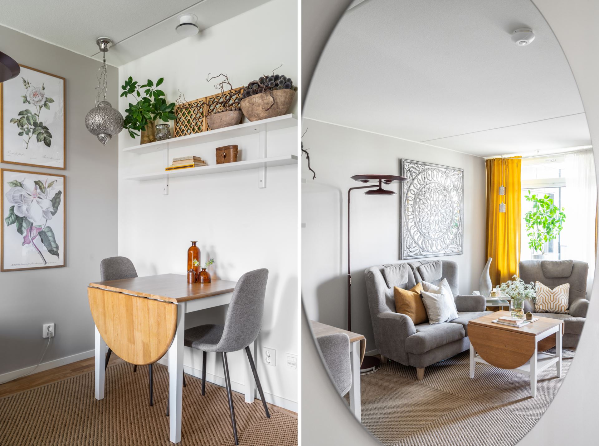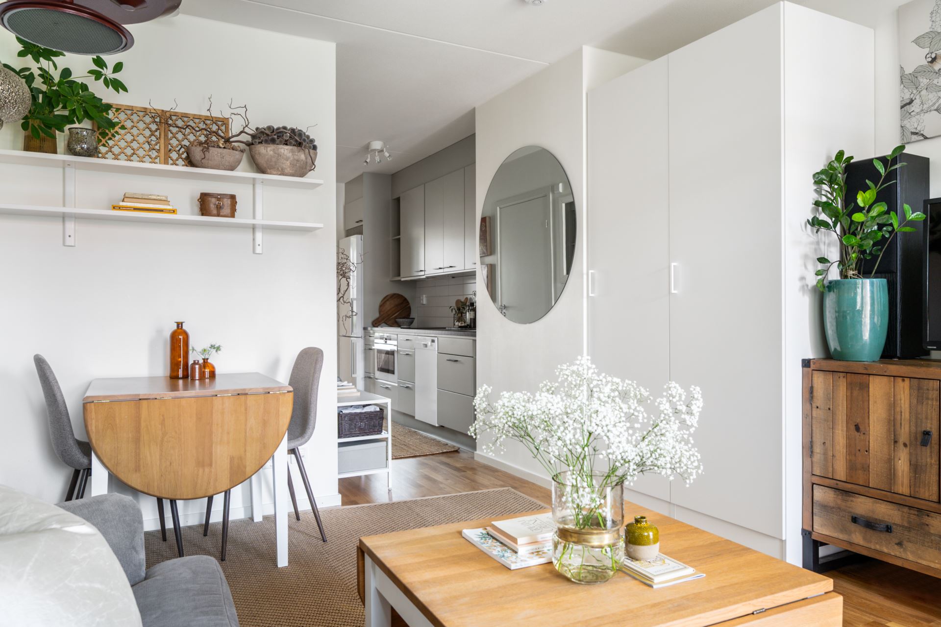Vardagsrummet är välplanerat och rymmer gott om plats för soffa och matbord mot köksdelen. Rummet är enkelt att möblera och här finns dessutom ytterligare förvaringsutrymme mellan tv och kök.