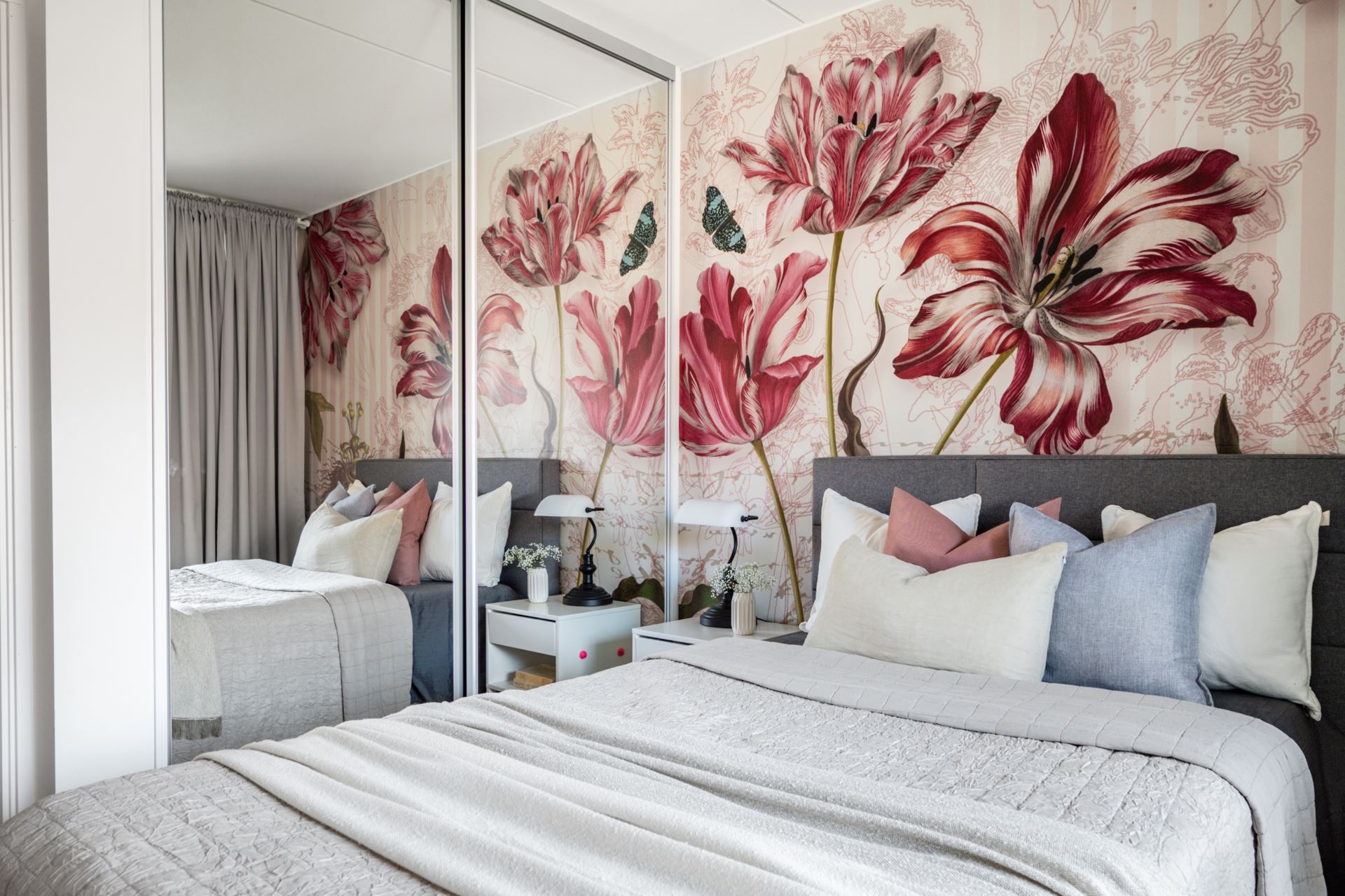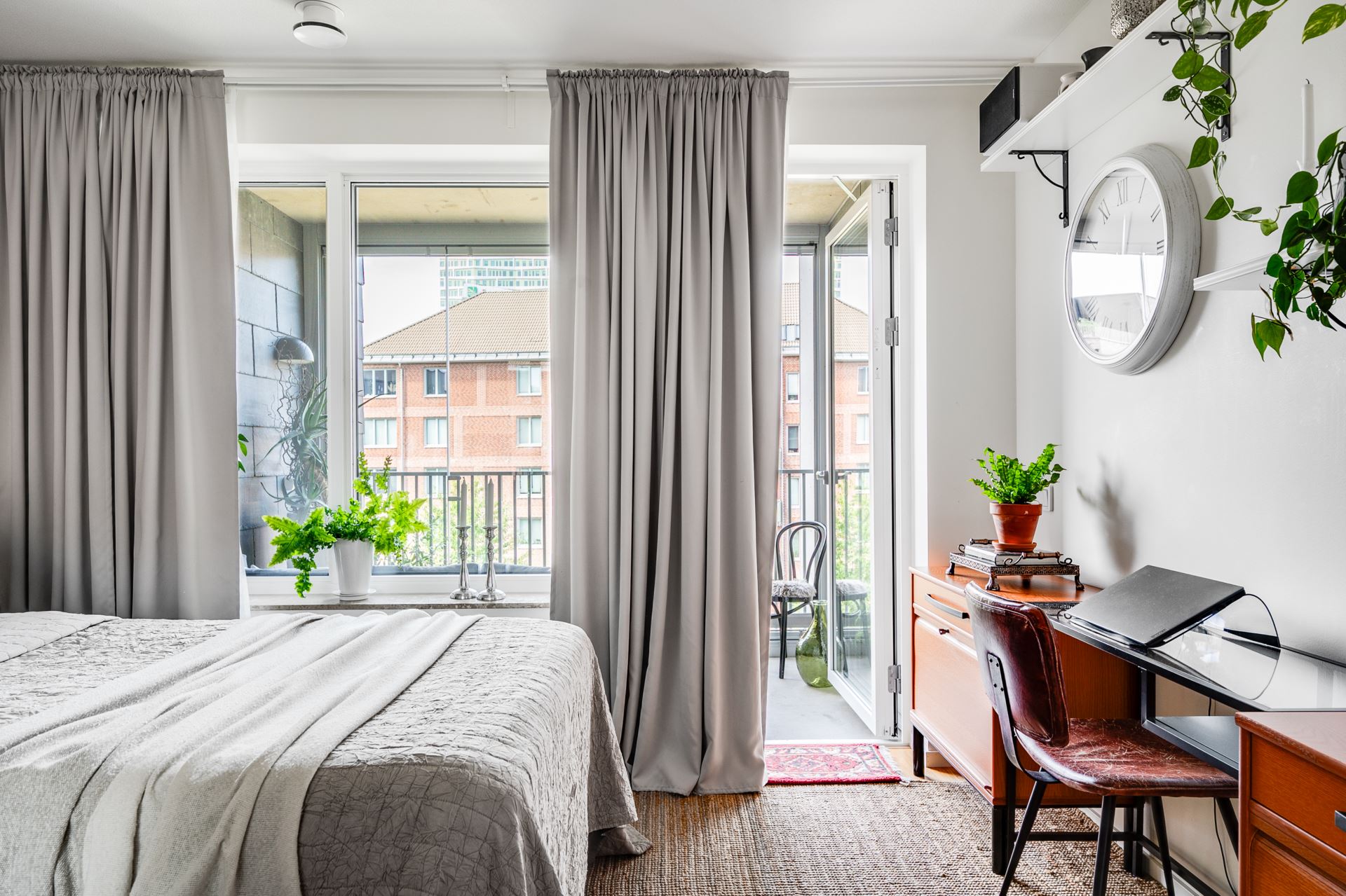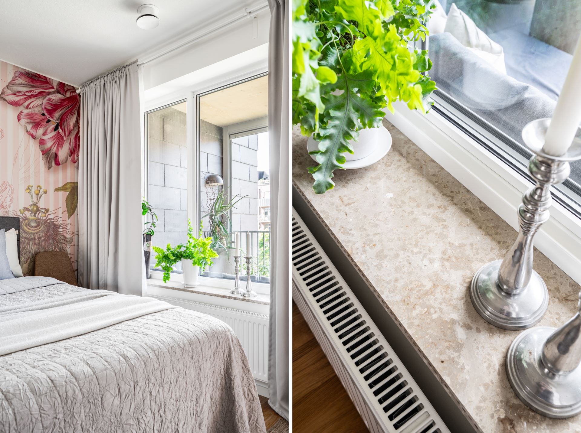 Sovrummet bjuder på gott om plats för dubbelsäng och sängbord samt utmärkt förvaringsutrymme i garderober bakom spegelbeklädda skjutdörrar längst med väggen. Vita väggar tillsammans med mönstrad fondvägg bakom sängen. Från sovrummet når vi dessutom den sköna balkongen belägen i soligt västerläge och helt insynsskyddat med trevlig utsikt. Möblerbar balkong med gott om plats för möblemang och mer därtill. Tack vare inglasningen kan balkongen även nyttjas ytterligare fler månader om året. Här kan vi njuta av solen från tidig eftermiddag till kvällen!