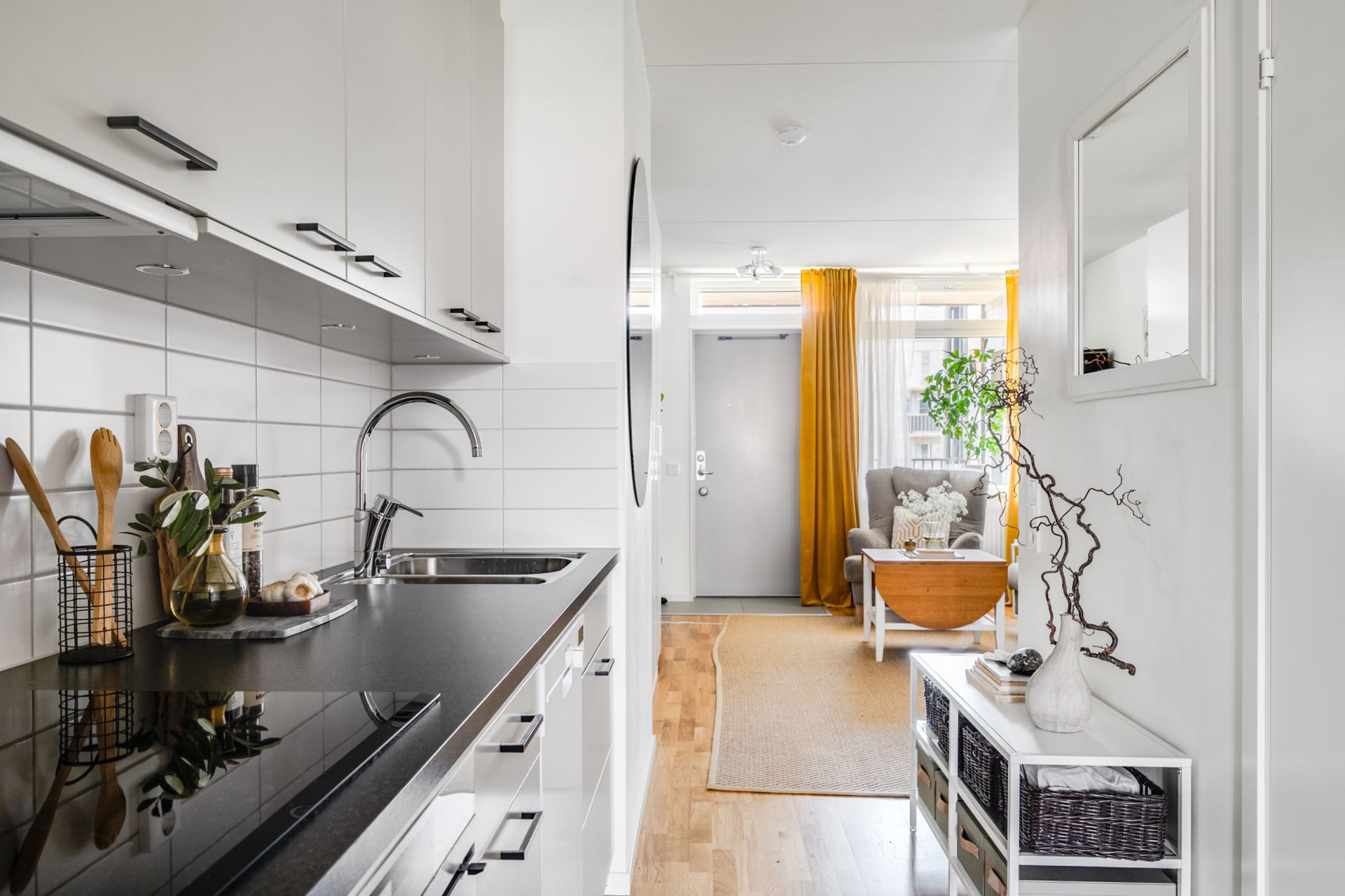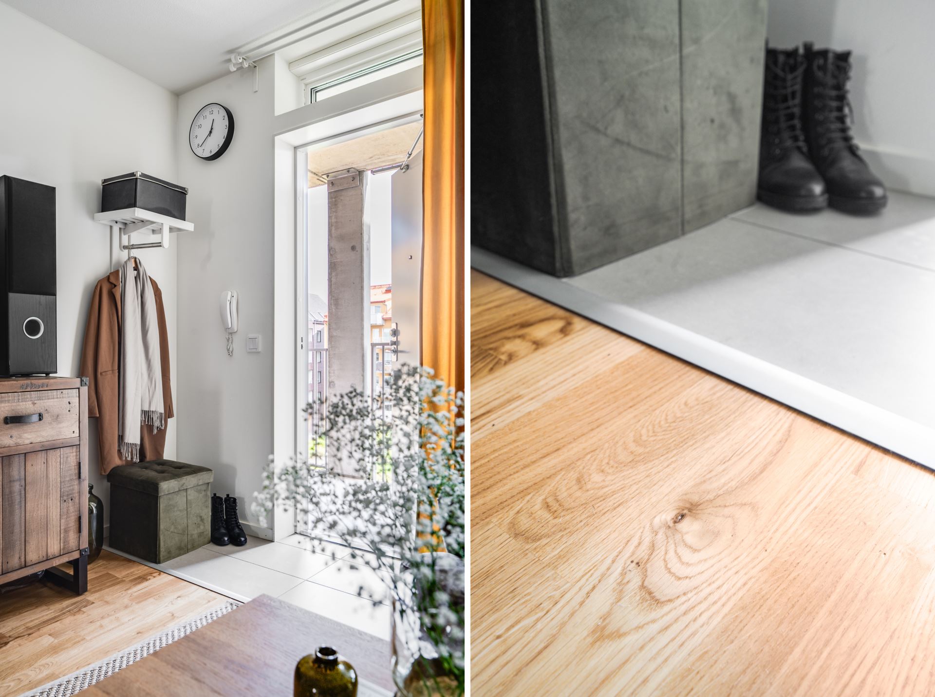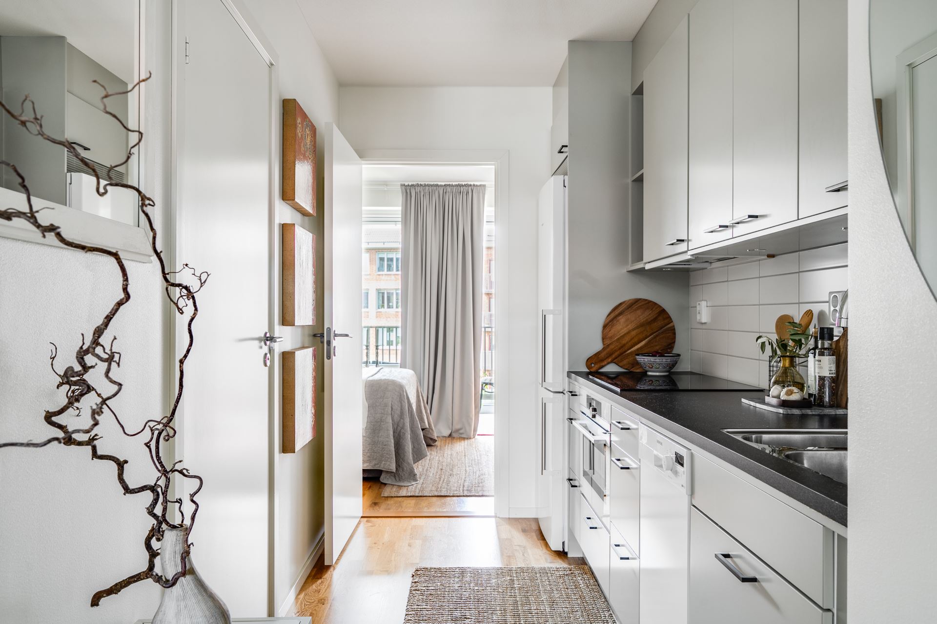 Vi tar hissen upp till fjärde våningen där vi välkomnas in i denna ljusa tvårummare med optimalt utnyttjade kvadratmeter. Hallen inviterar med beiga klinkers på golv samt utmärkta avhängningsmöjligheter direkt på höger sida. Här kombineras smakfullt släta vita väggar tillsammans med vacker mattlackad ekparkett på golv, vilket återfinns i hela bostaden.