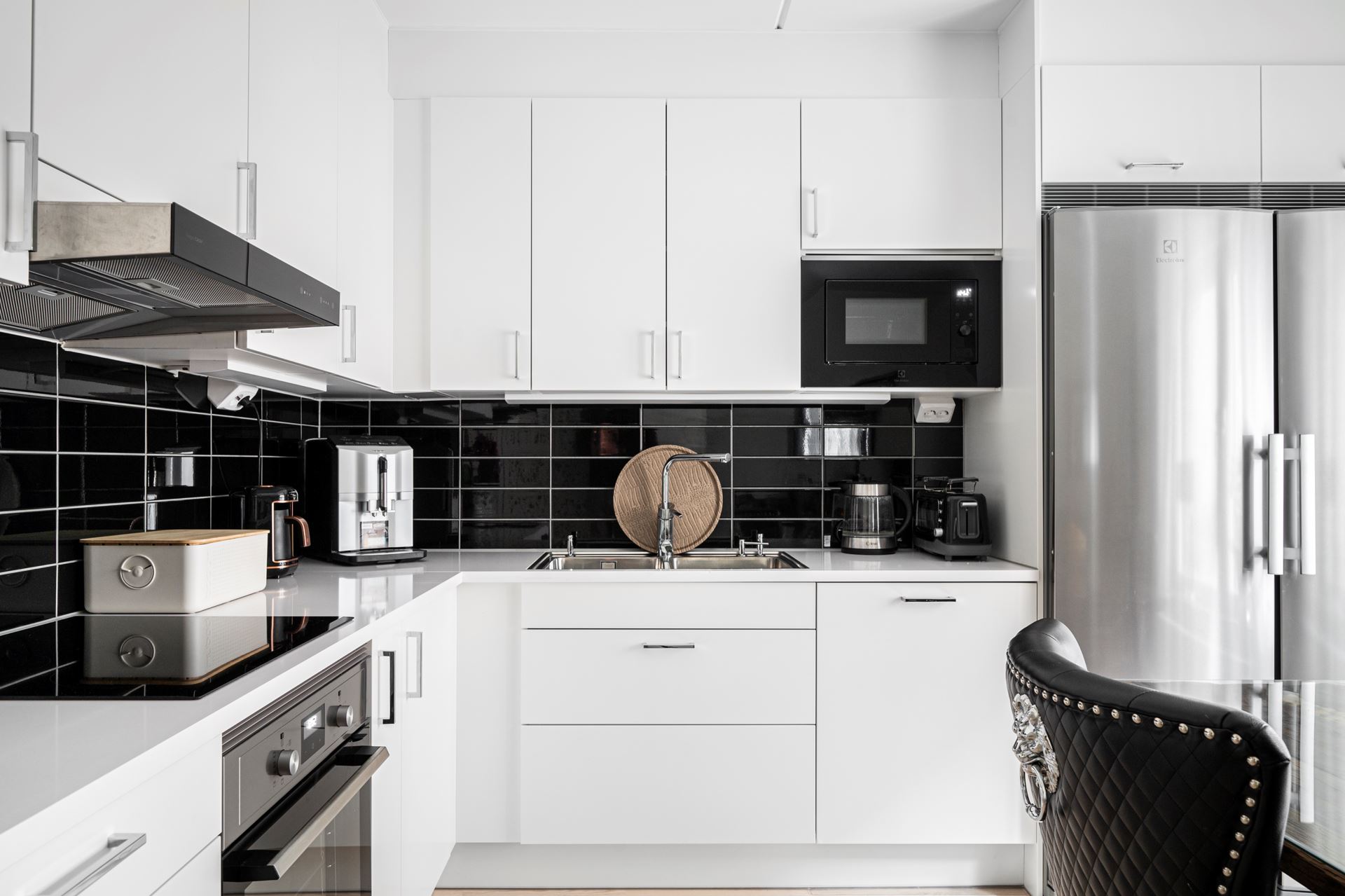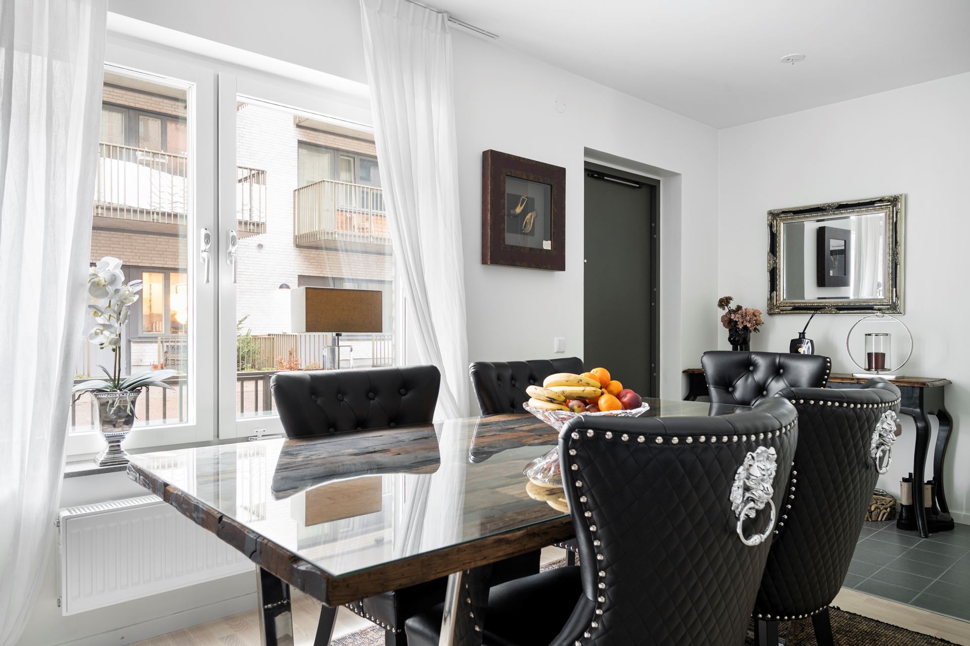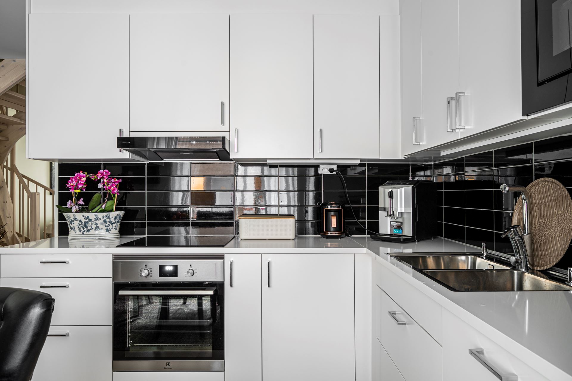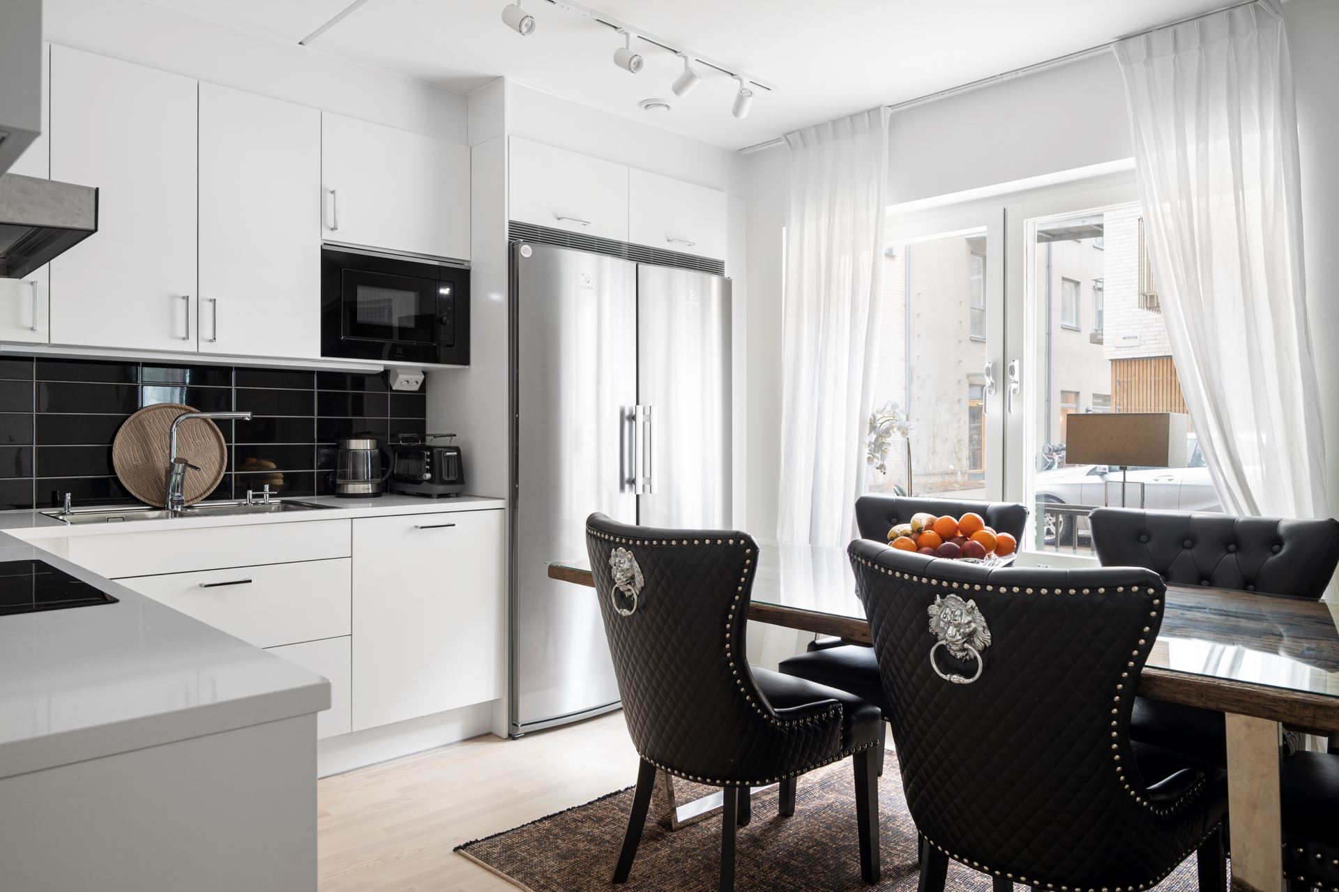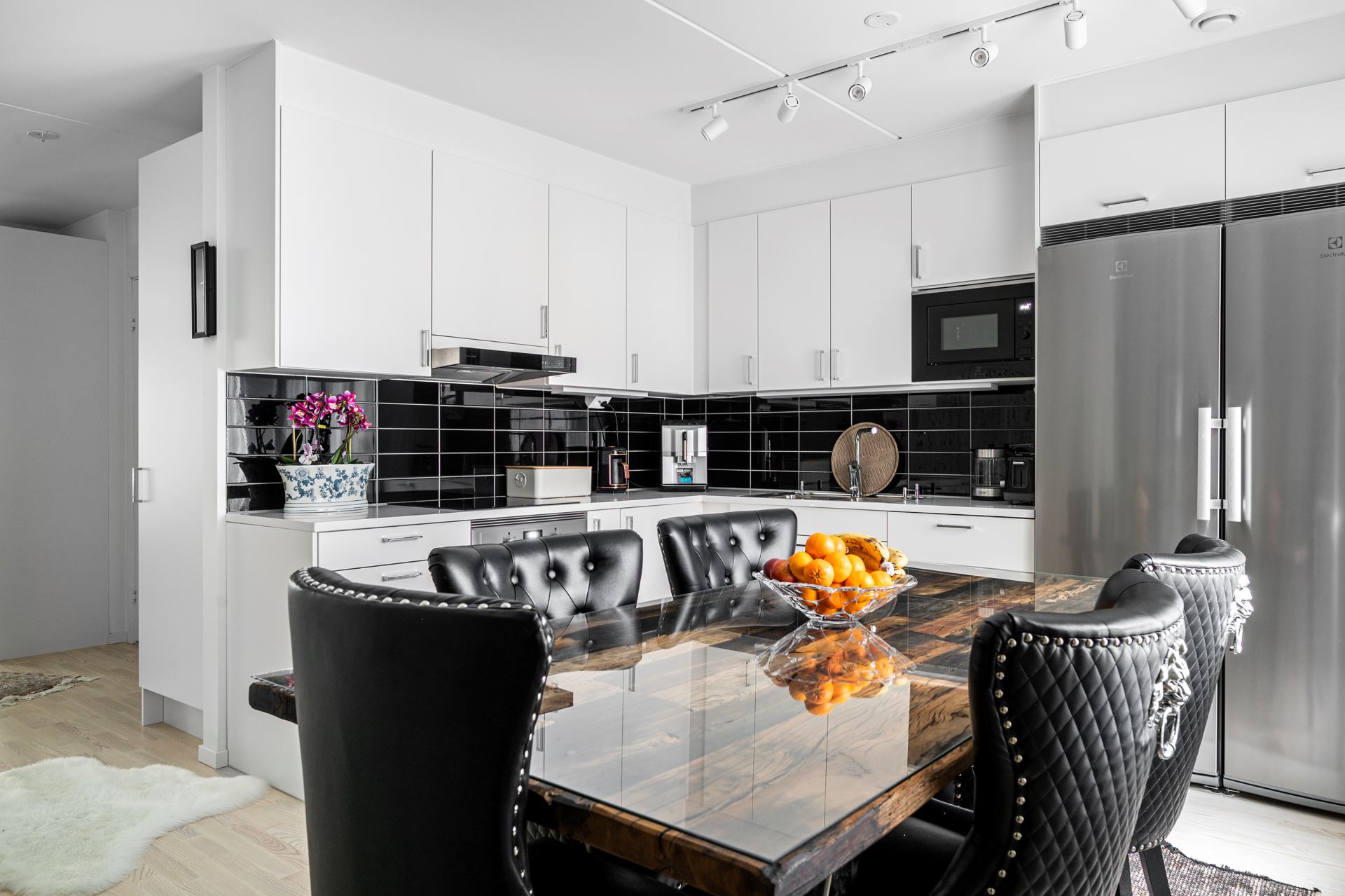 Vita köksluckor (Marbodal) tillsammans med rostfria beslag, bänkskiva och svart kakel. Köket är utrustat med kyl och frys (Electrolux, rostfritt), inbyggnadsugn, inbyggd mikro, induktionshäll och integrerad diskmaskin. Plats för större matbord i köksdelen.