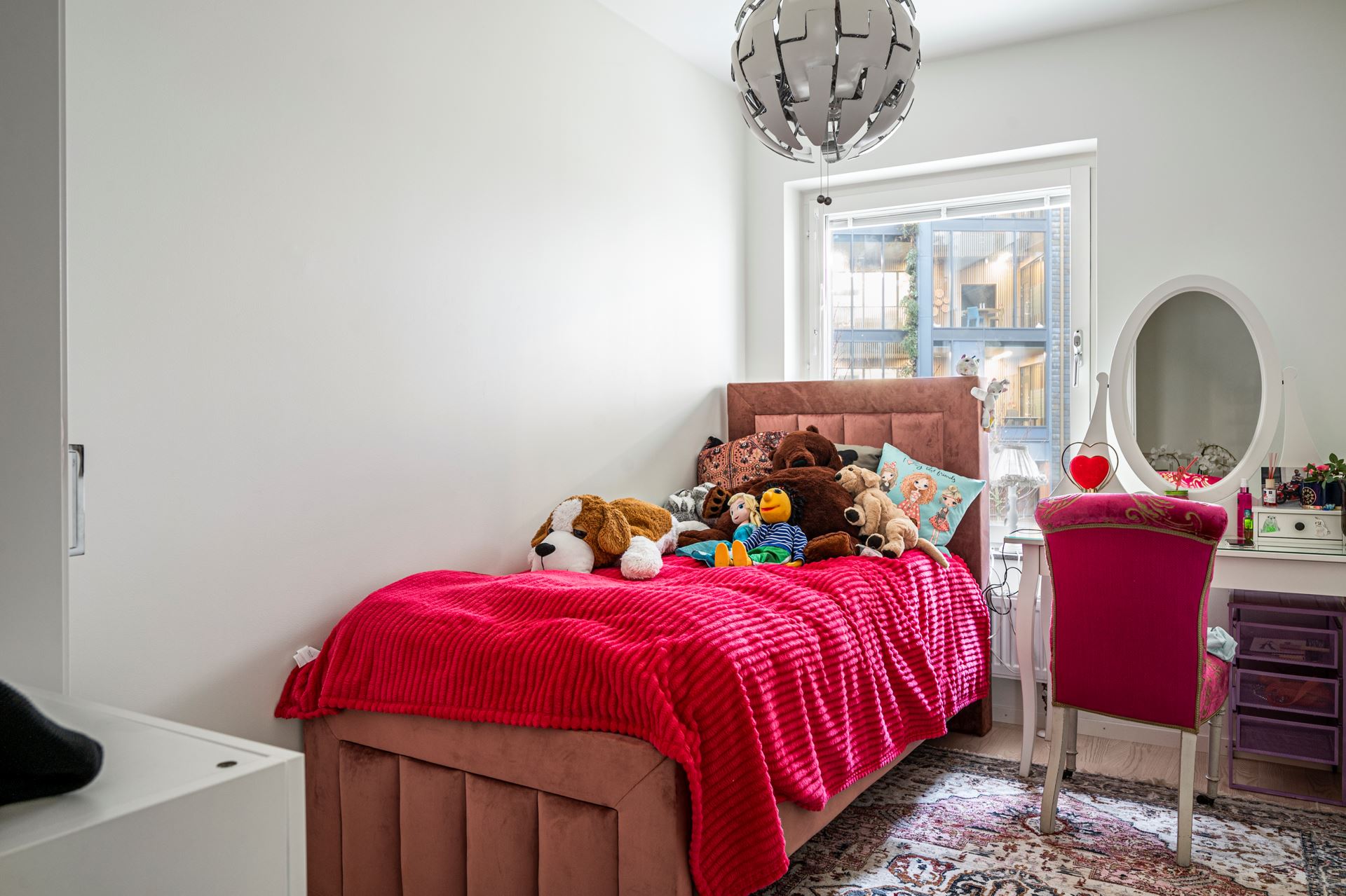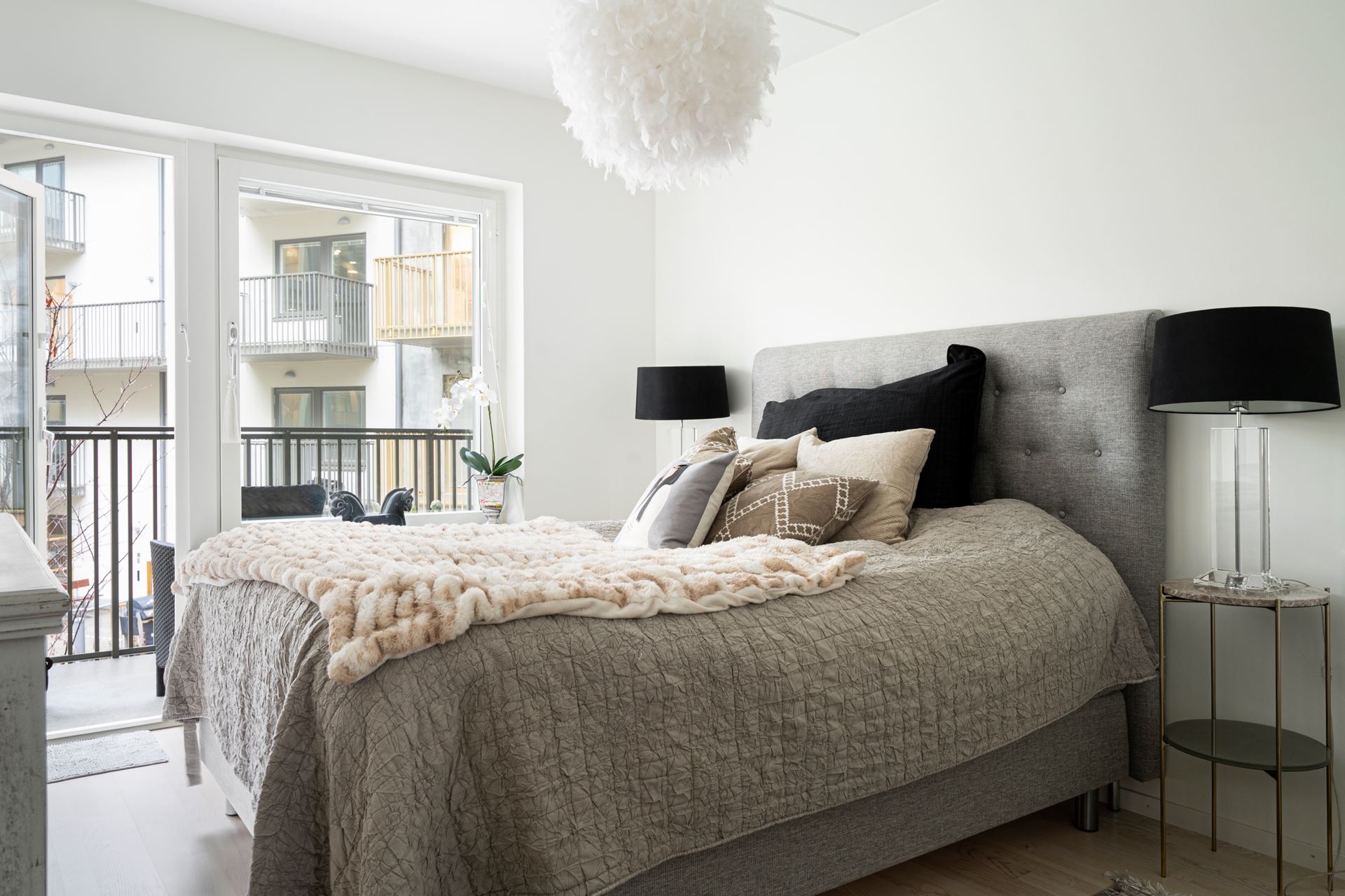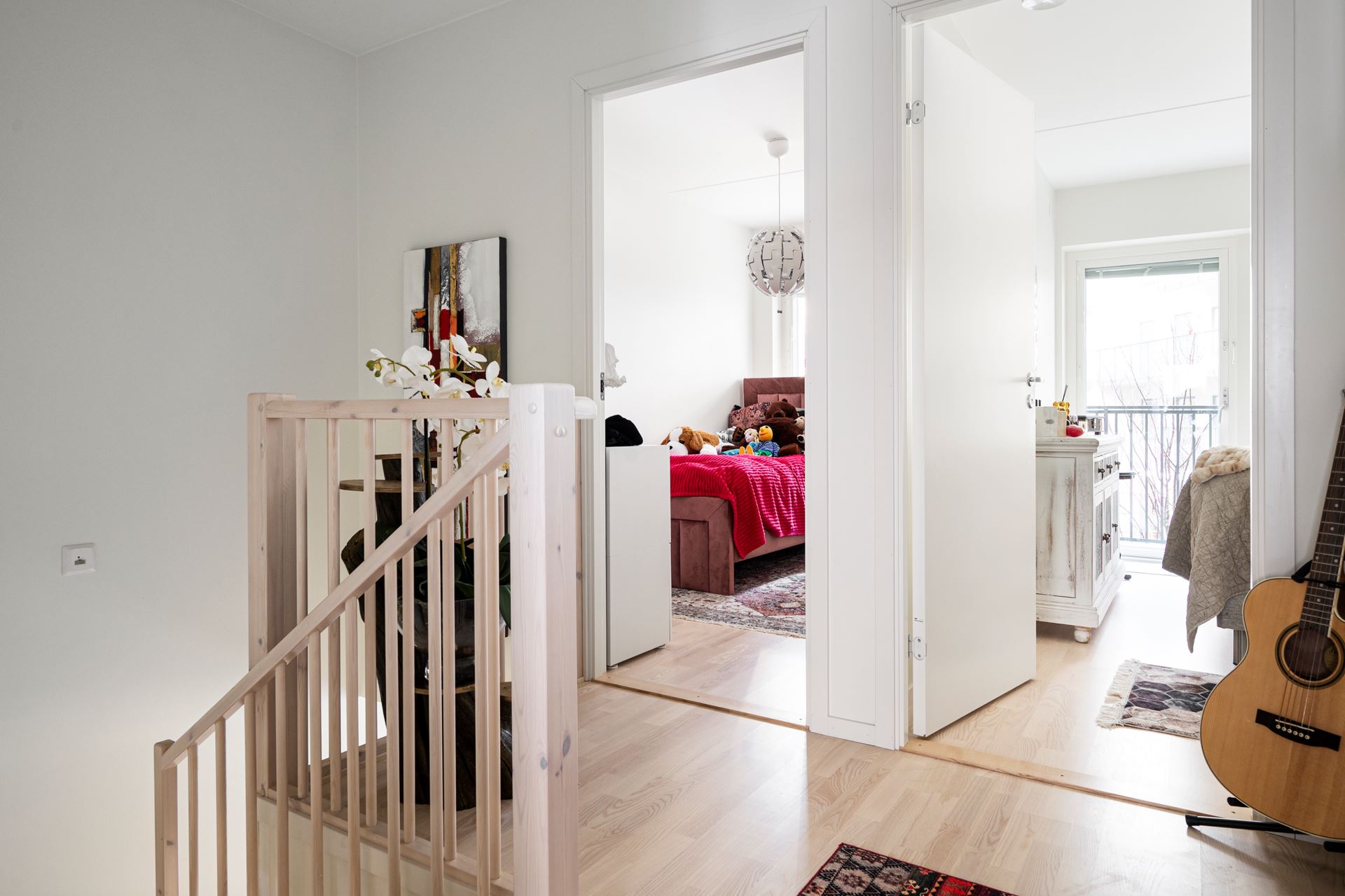 Samtliga fyra sovrum finns på ovanvåningen och bjuder på släta vita väggar tillsammans med ljust parkettgolv, vilket återfinns i hela lägenheten. Gardeobsförvaring finns även i samtliga av sovrummen. Access till balkongen får vi från master bedroom.