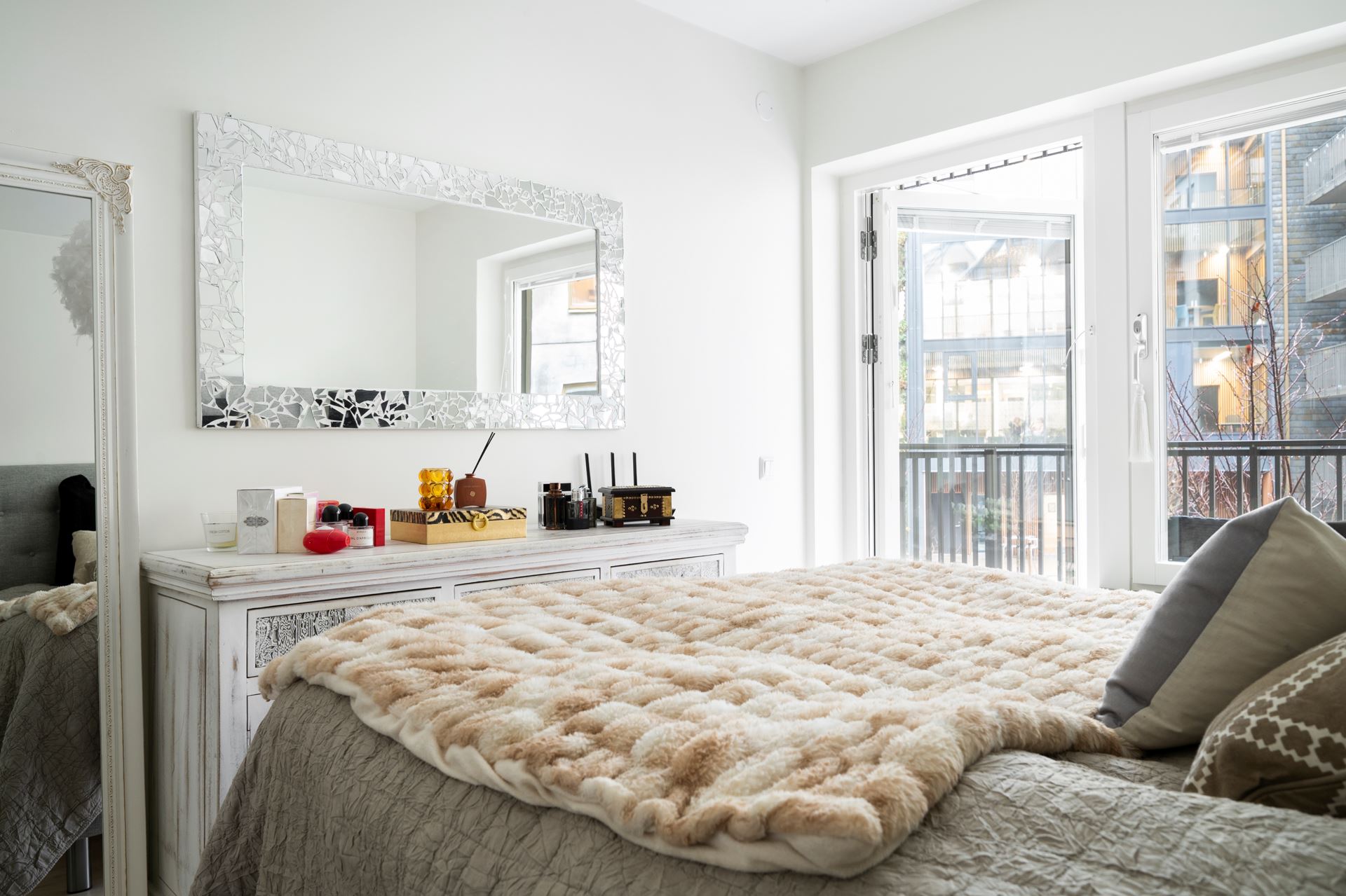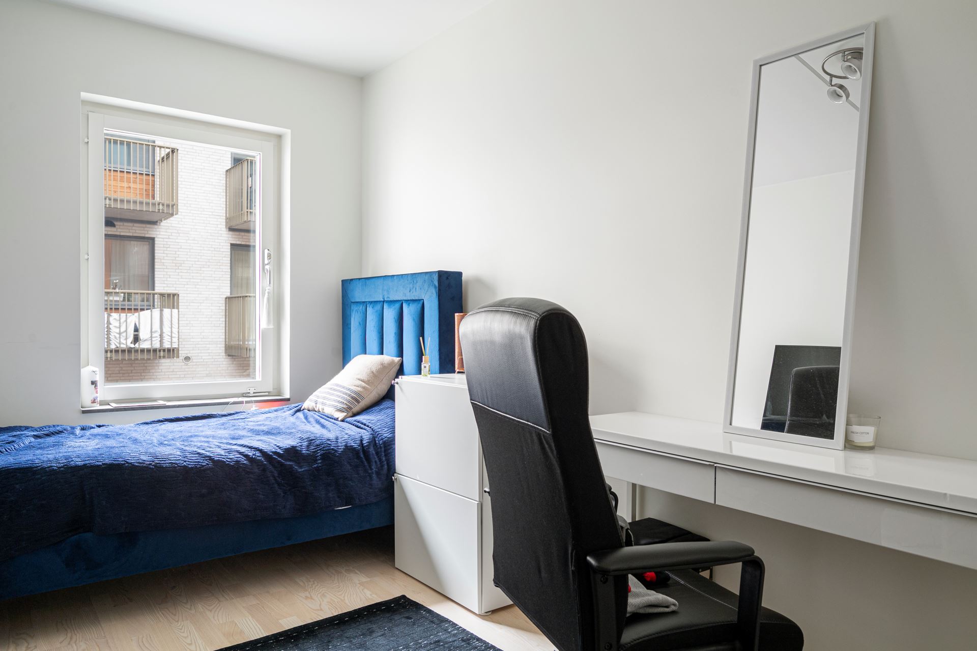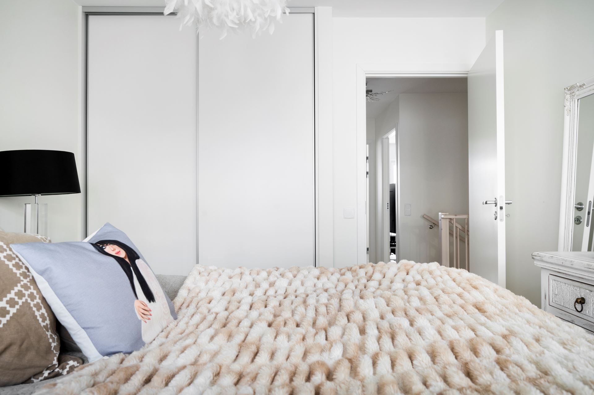 Samtliga fyra sovrum finns på ovanvåningen och bjuder på släta vita väggar tillsammans med ljust parkettgolv, vilket återfinns i hela lägenheten. Gardeobsförvaring finns även i samtliga av sovrummen. Access till balkongen får vi från master bedroom.
