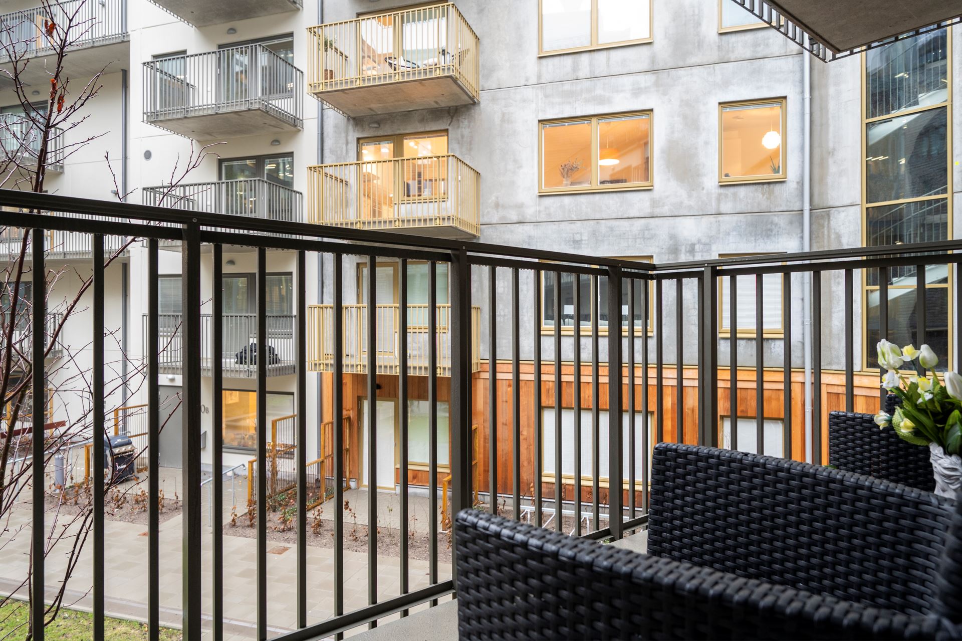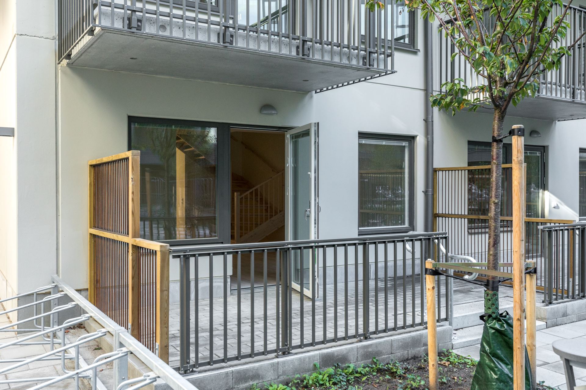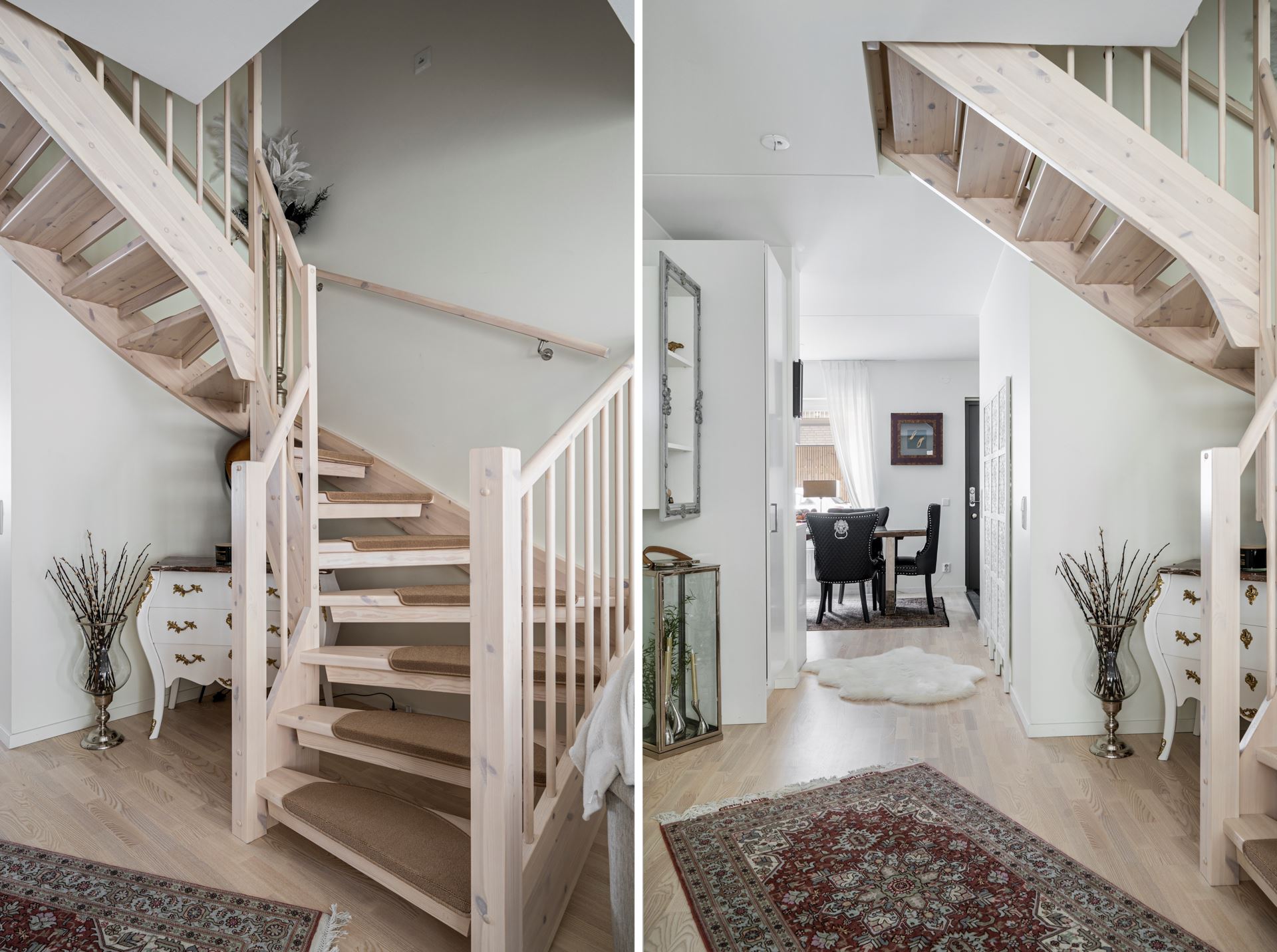 På entrésidan välkomnas vi till en av bostadens två uteplatser. Plats för avhängningsmöjligheter på vänster i hallen längre in finns även bostadens förråd som är av väl tilltagna kvadratmeter.