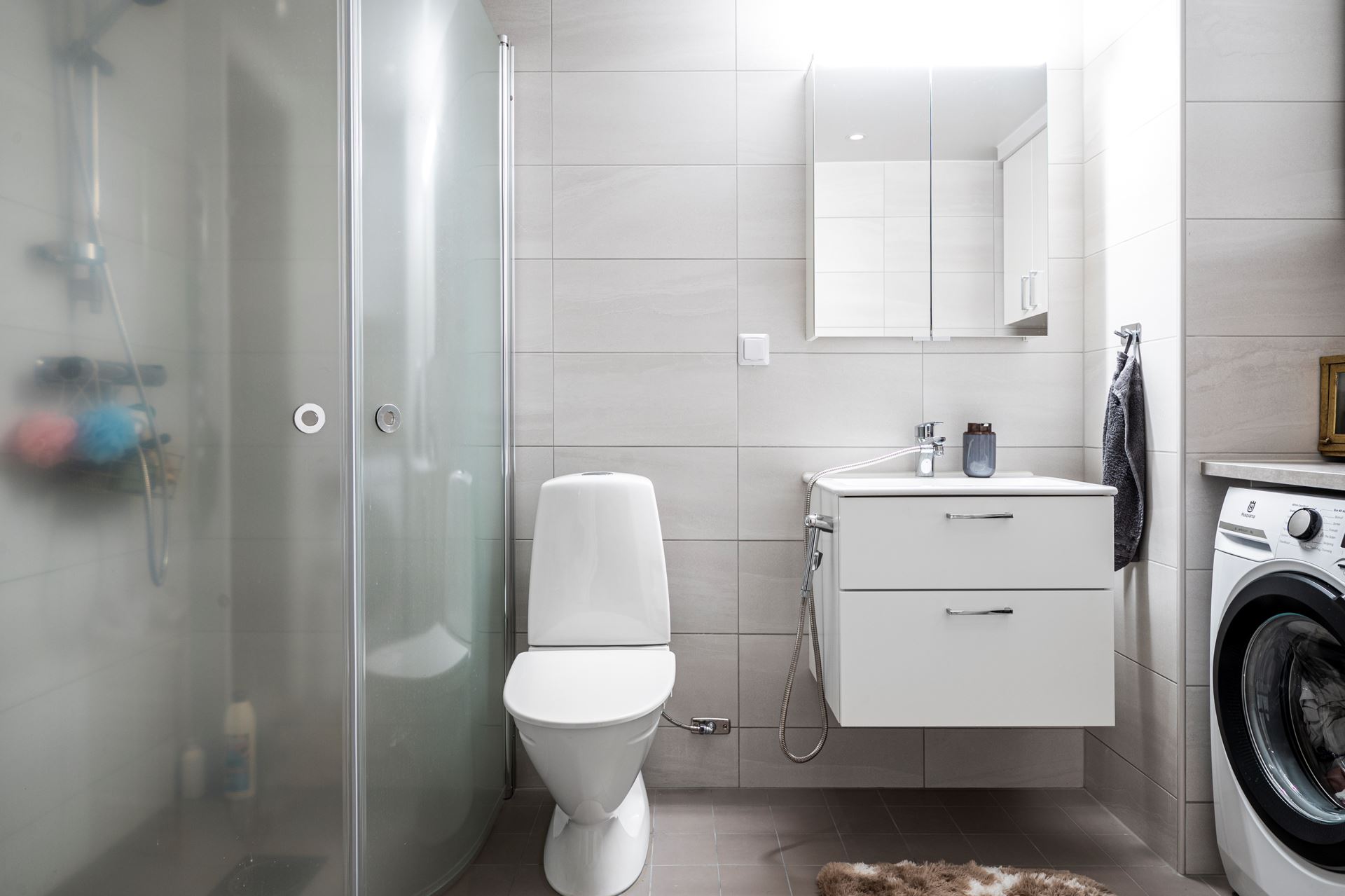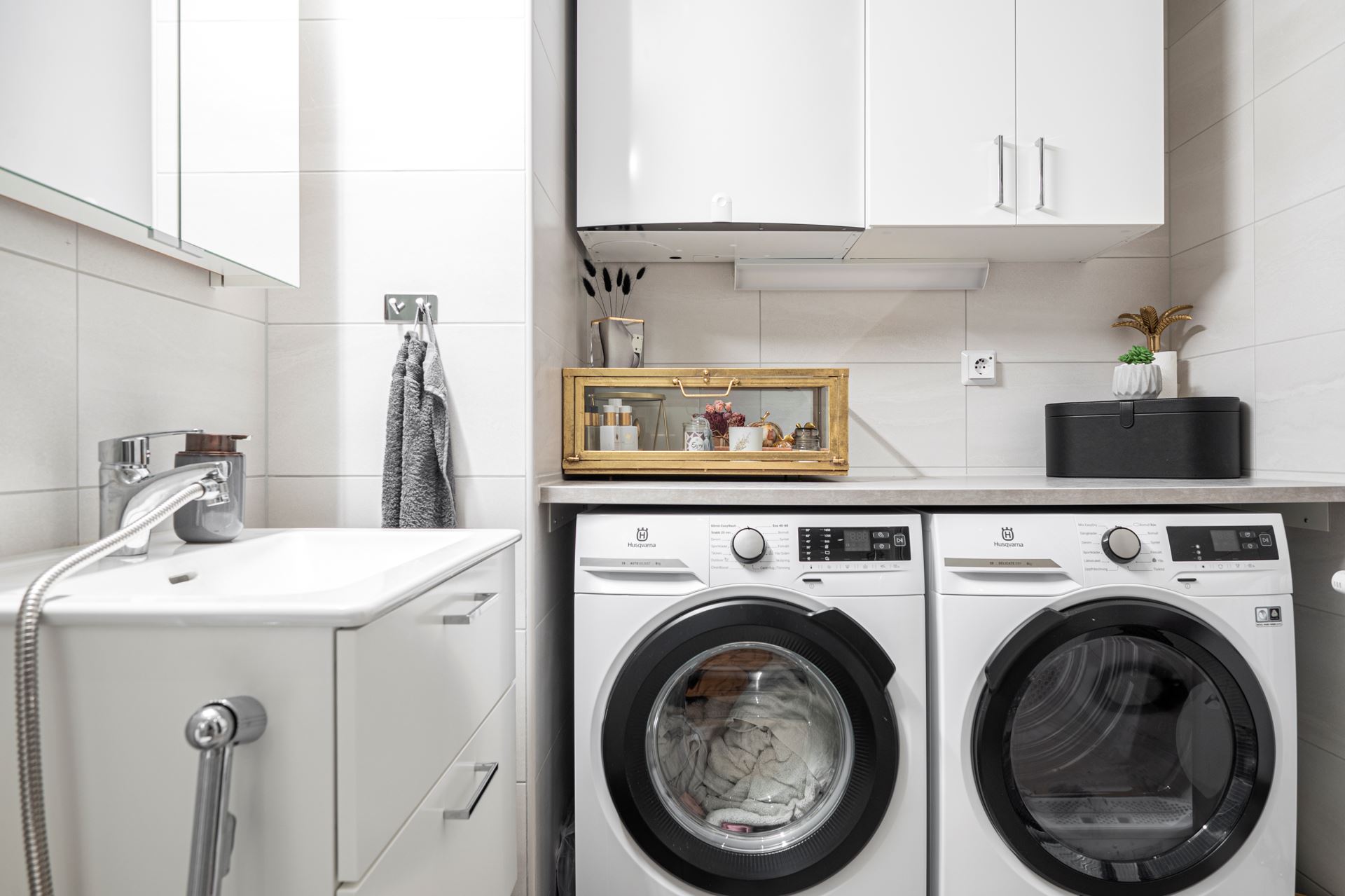 Helkaklat badrum på bottenplan med ljust kakel på väggarna tillsammans med ljusbeiga klinkers på golv. Utrustat med dusch bakom glasvägg, handfat med kommod, spegelskåp, tvättmaskin och torktumlare (Electrolux). Ytterligare skåpsförvaring och arbetsytor ovanför.