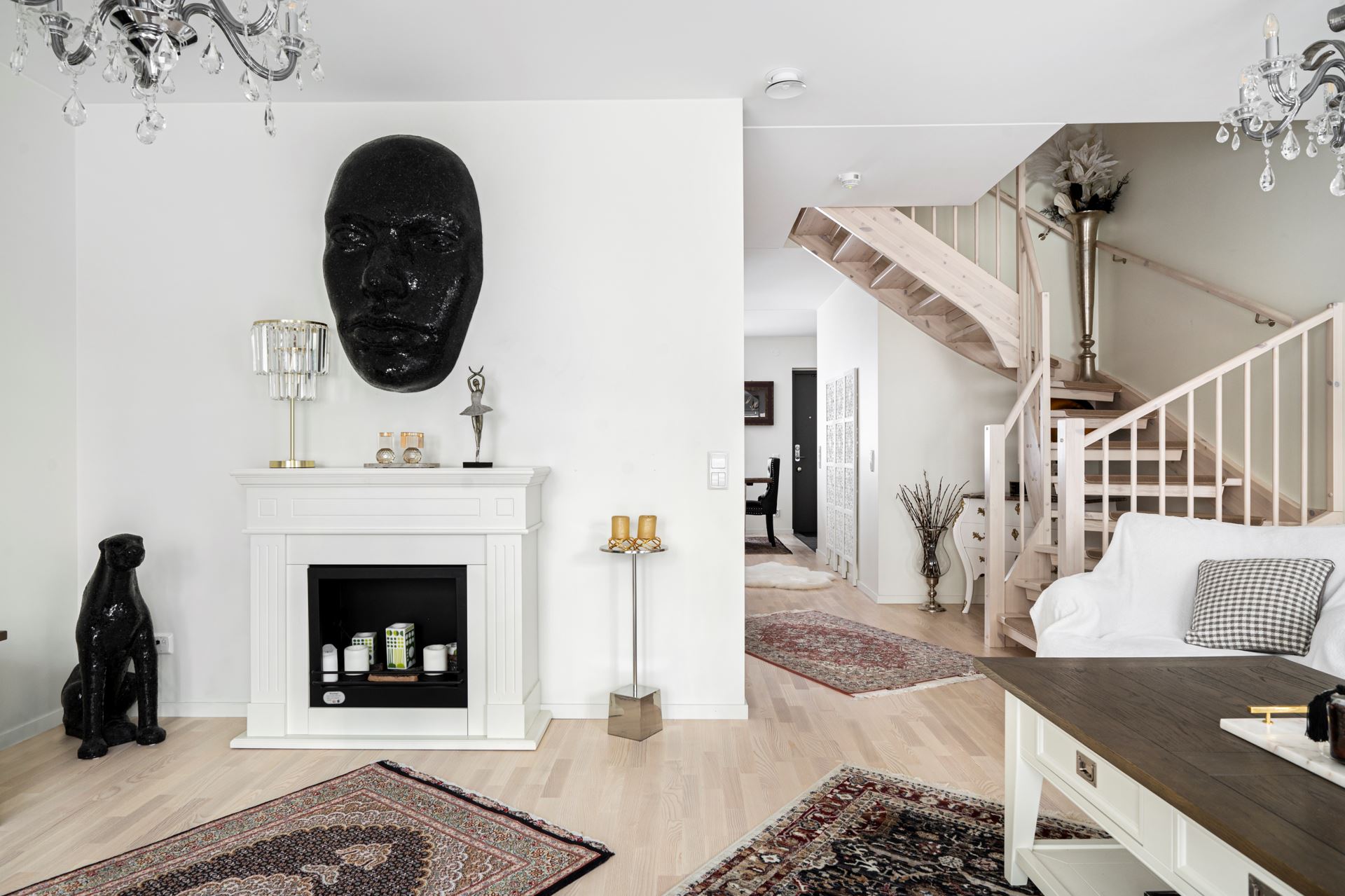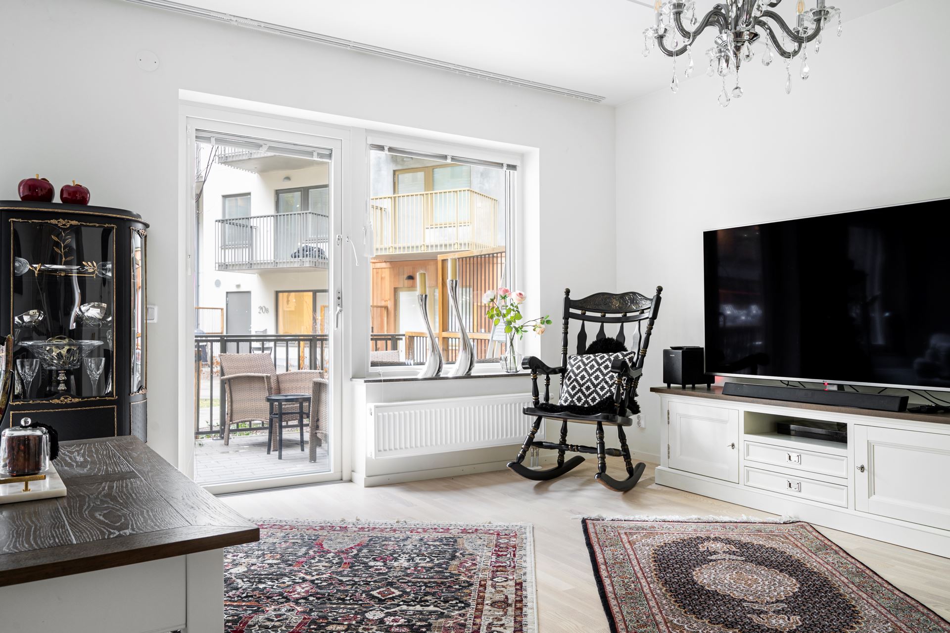 Rymligt vardagsrum av generösa kvadratmeter med gott om plats för möblering av soffgrupp och tv. Härifrån finns även en av bostadens två uteplatser. Vita väggar i hela bostaden tillsammans med vacker parkett på golv.