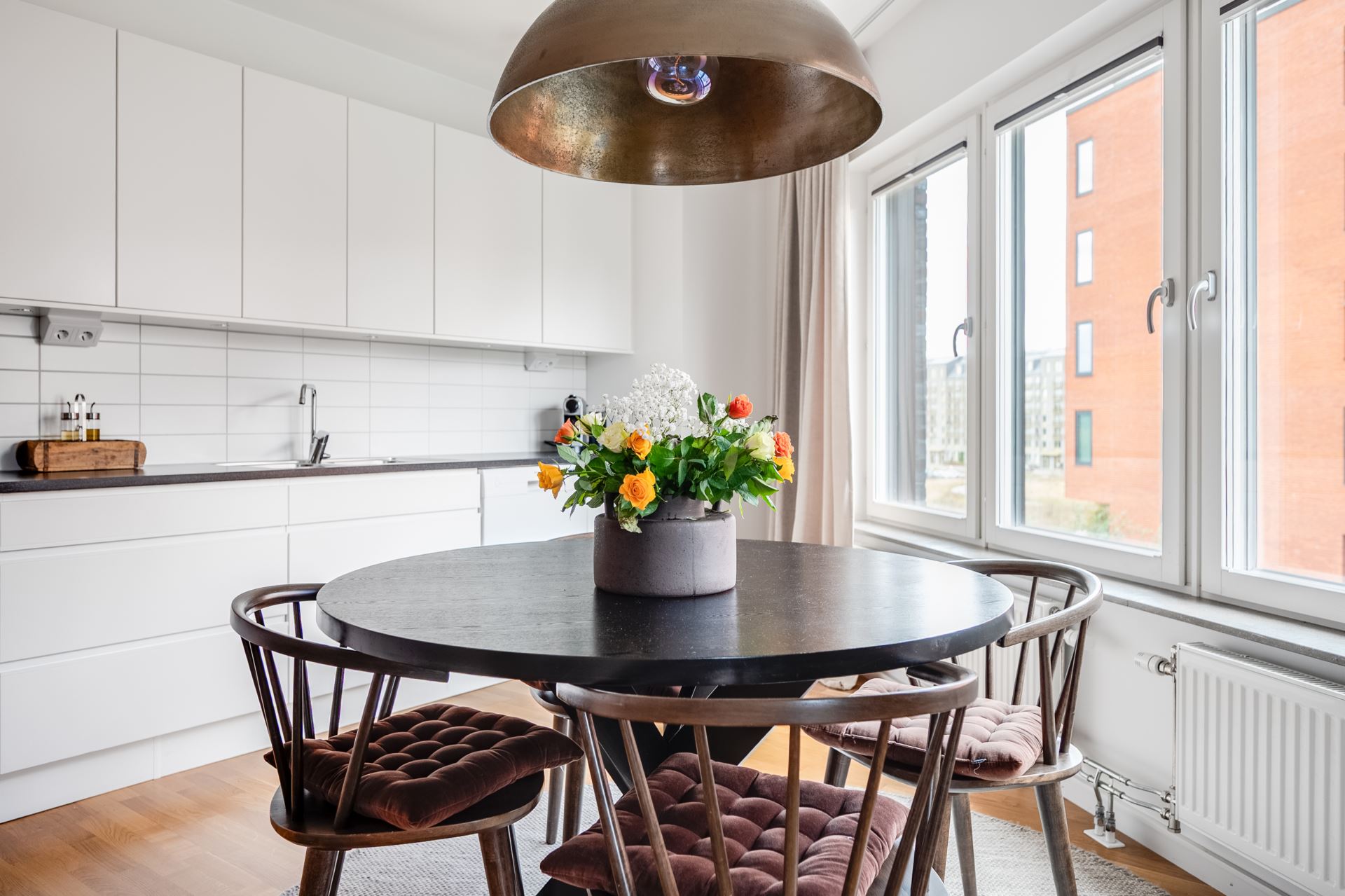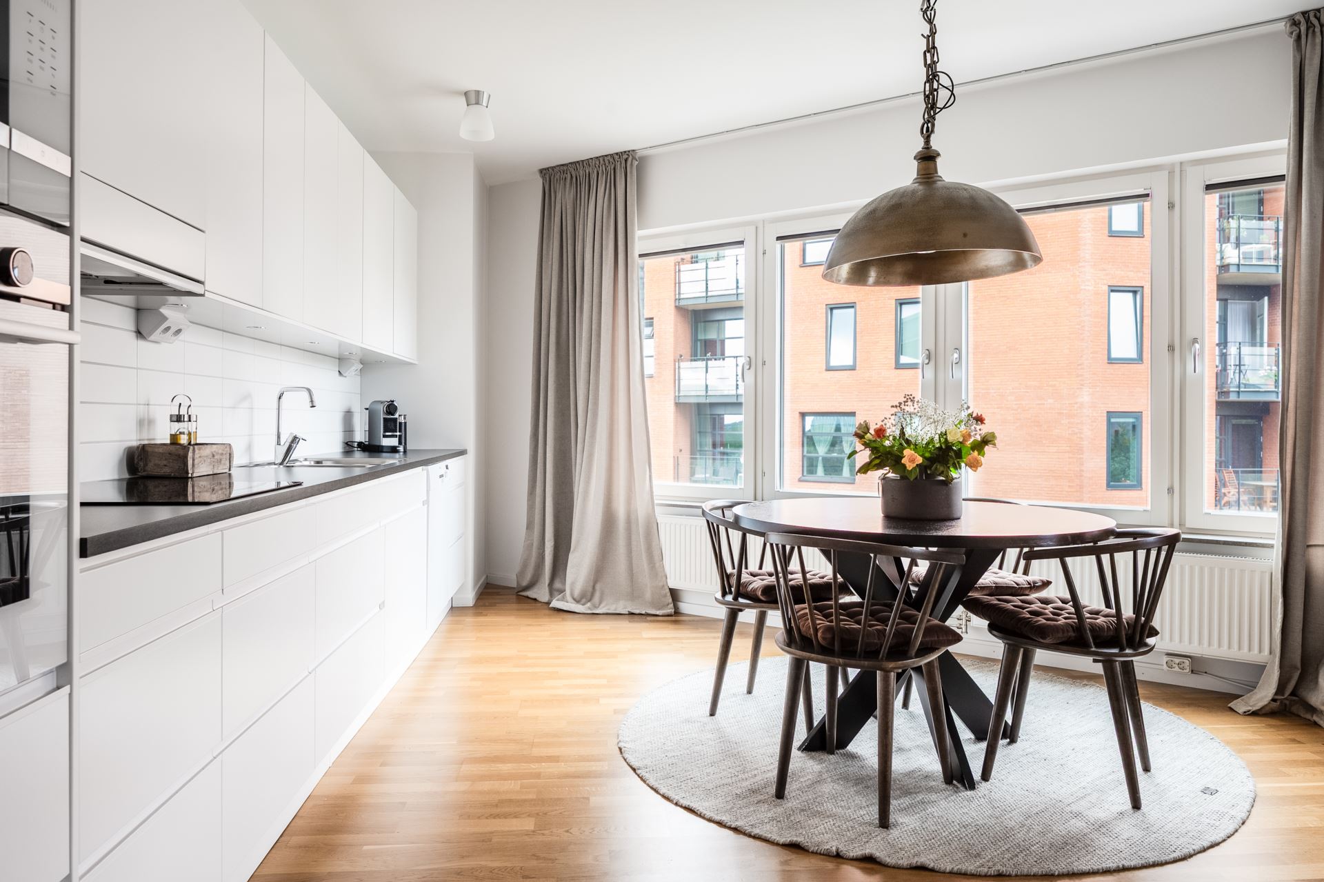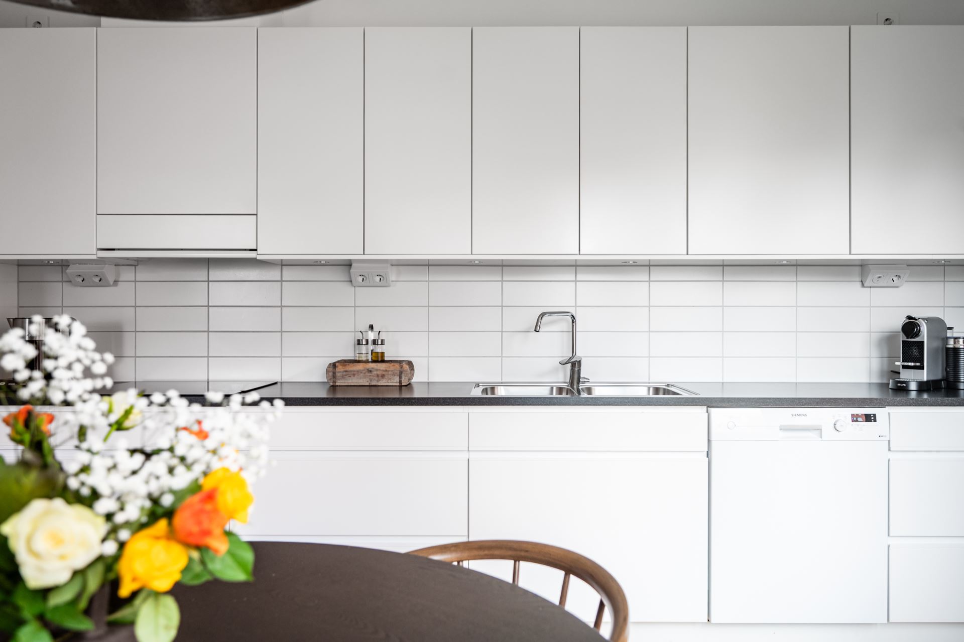 Vita köksluckor (Vedum) kombineras med mörk bänkskiva och vitt kakel. Köket bjuder på gott om plats till förvaring längst med hela väggen, både i skåp och lådor. Dessutom bra med arbetsytor i hela köket. Kök och vardagsrum i öppen planlösning och mot vardagsrumsdelen finns även plats för större matbord. Ljus och trivsam köksmiljö tack vare stora fönsterpartier på hörnan av huset.