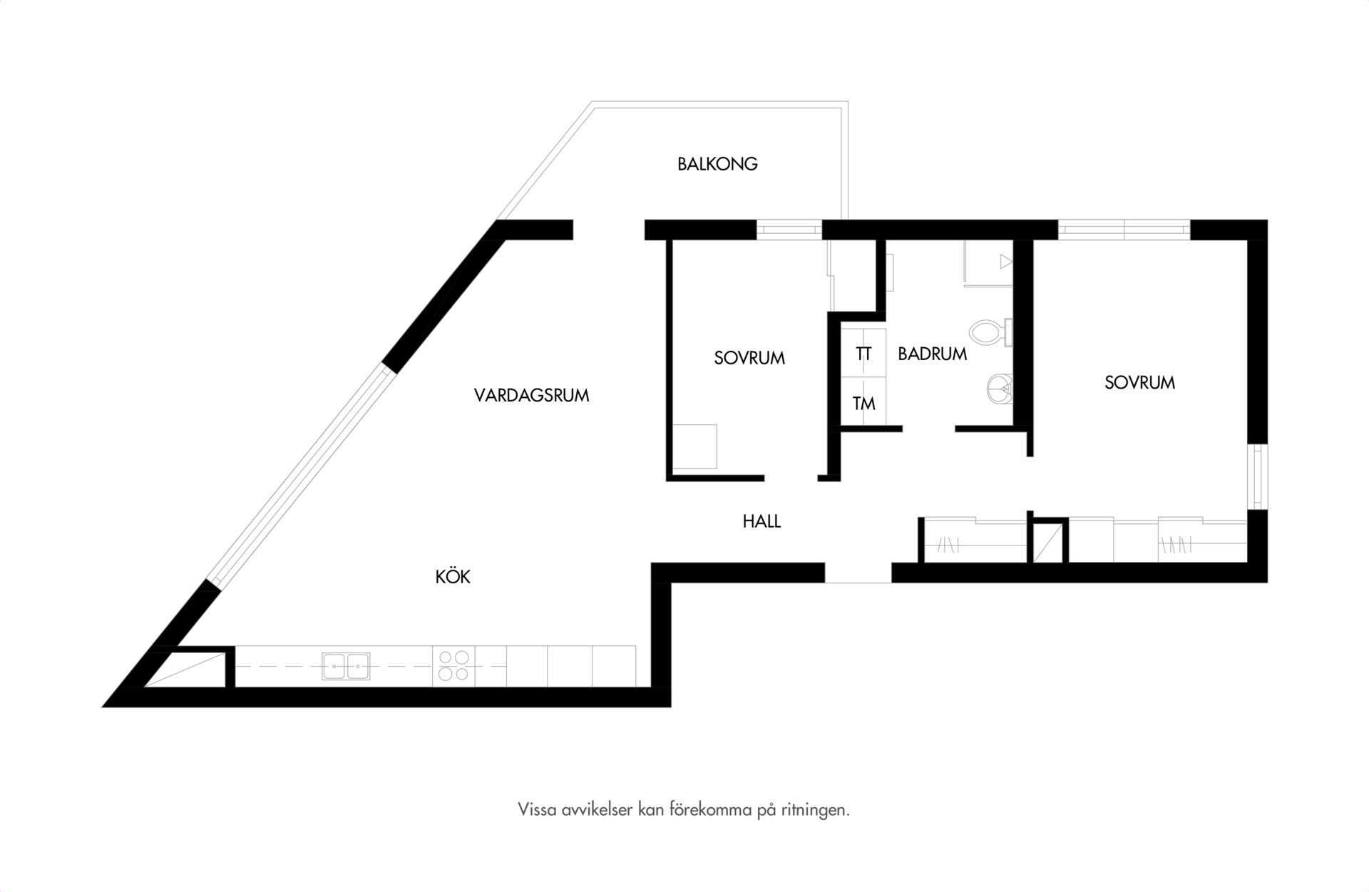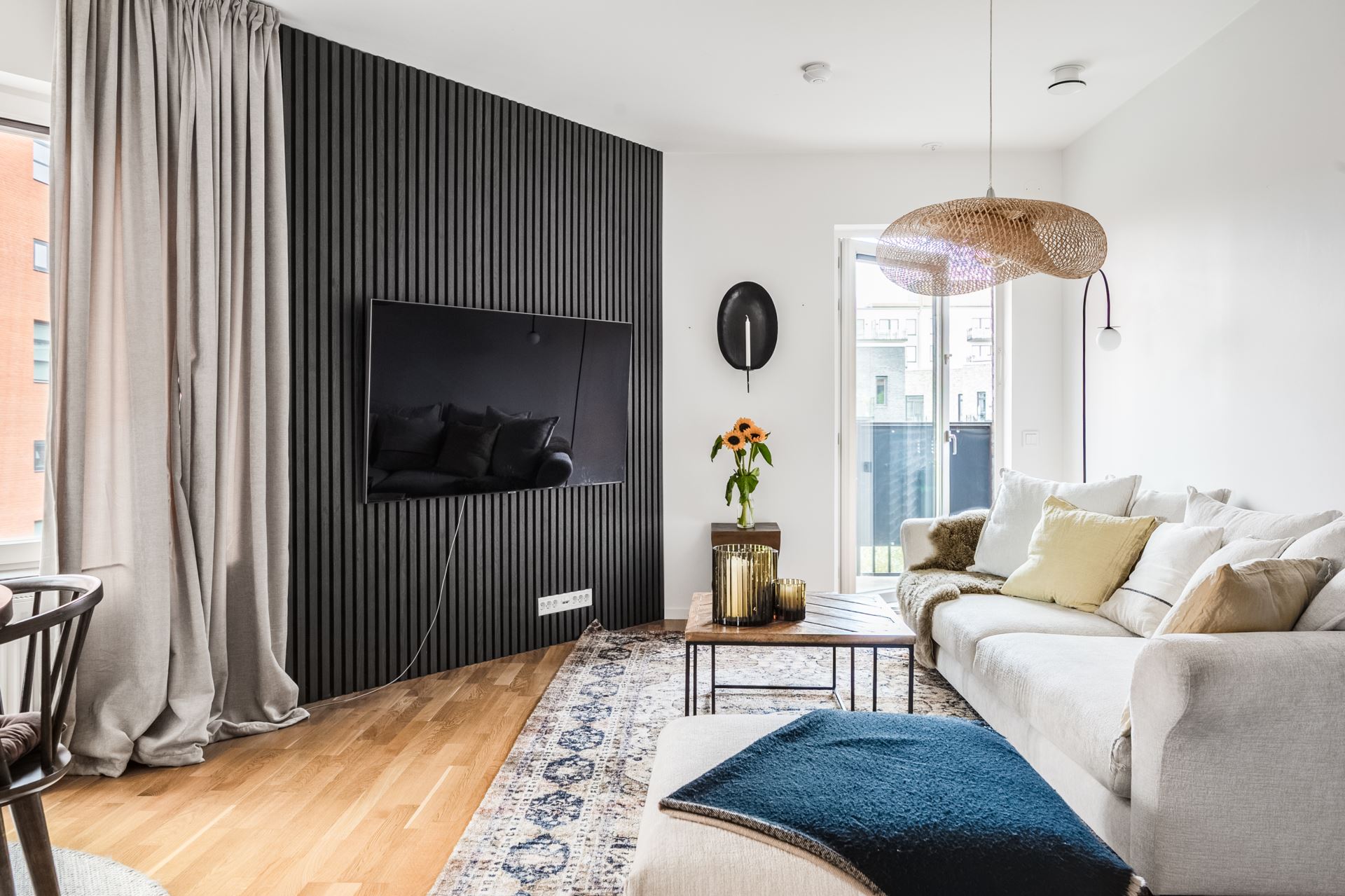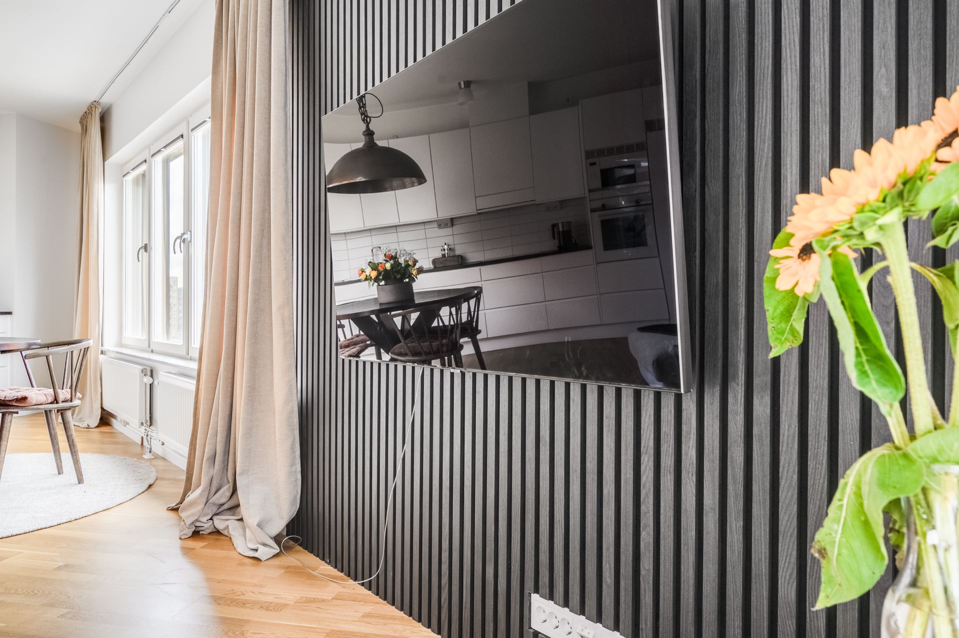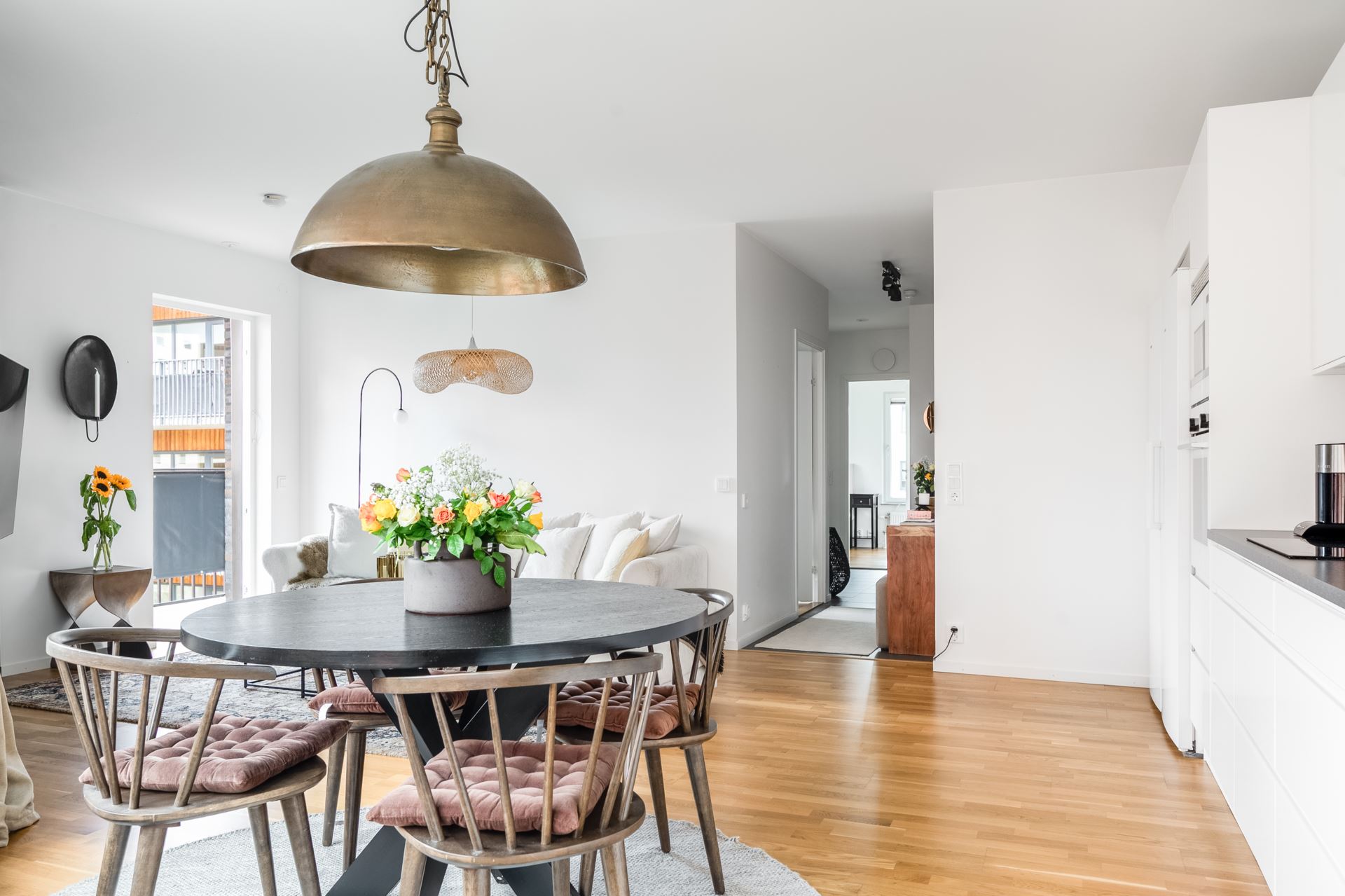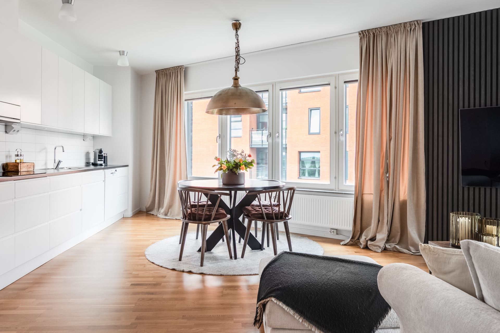 Öppen planlösning mellan kök och vardagsrum, här finns plats för både soffgrupp och tv. Här kombineras smakfull träpanel tillsammans med släta vita väggar och ekparkett på golv. Från vardagsrummet nås dessutom utgången till balkongen som är av väl tilltagna kvadratmeter och bjuder på fri utsikt, på lugnt läge, mot Tygelsjöstigen.