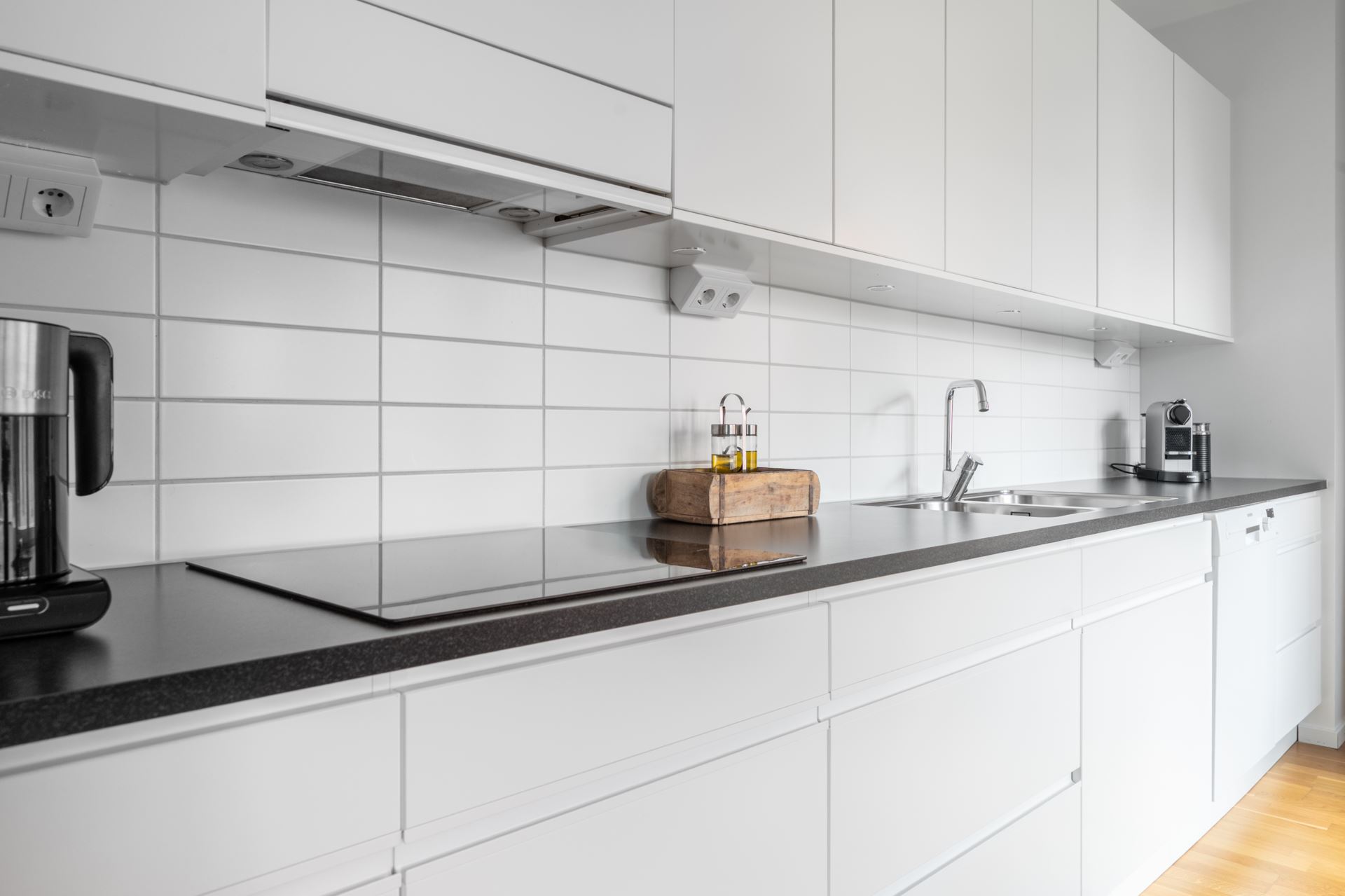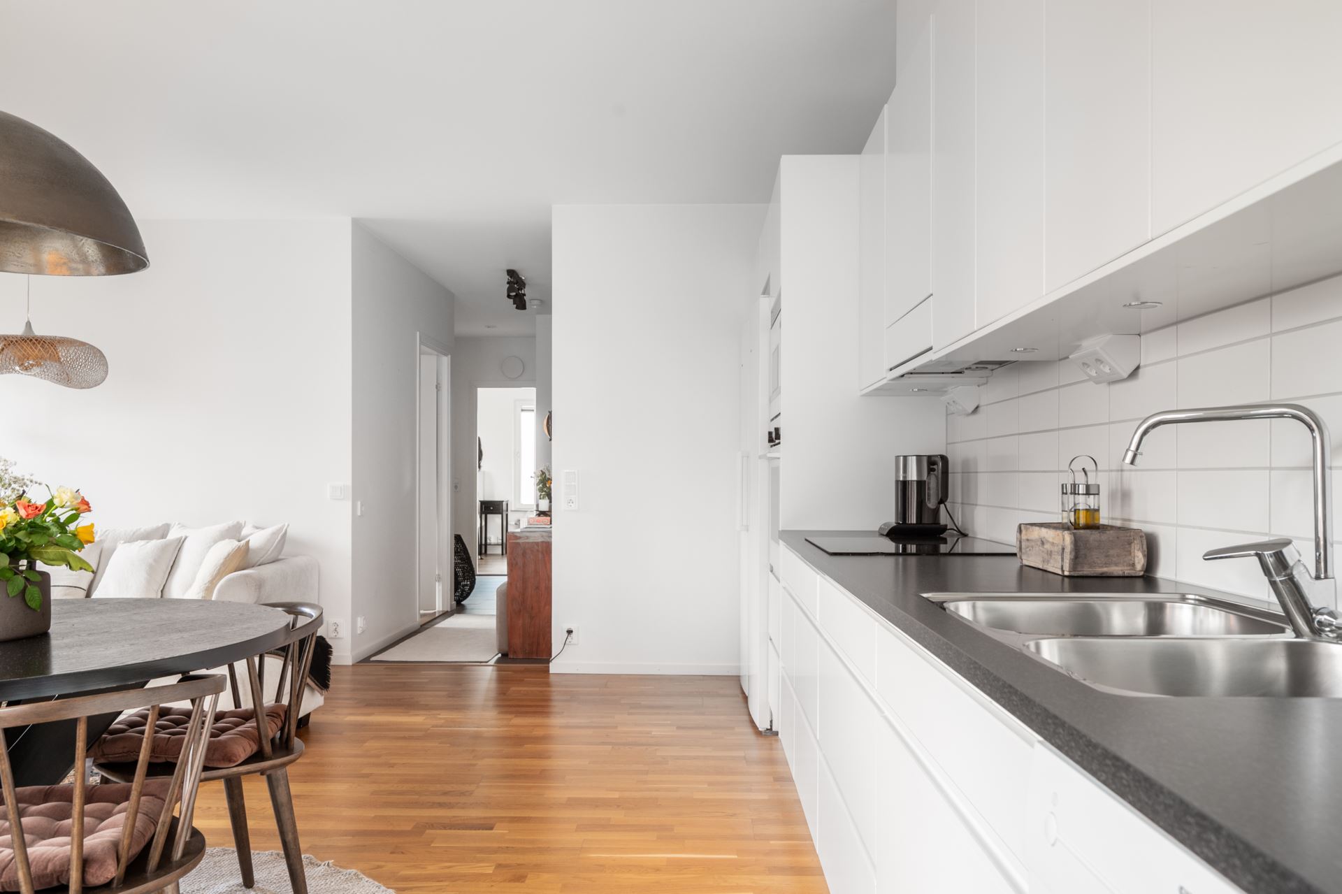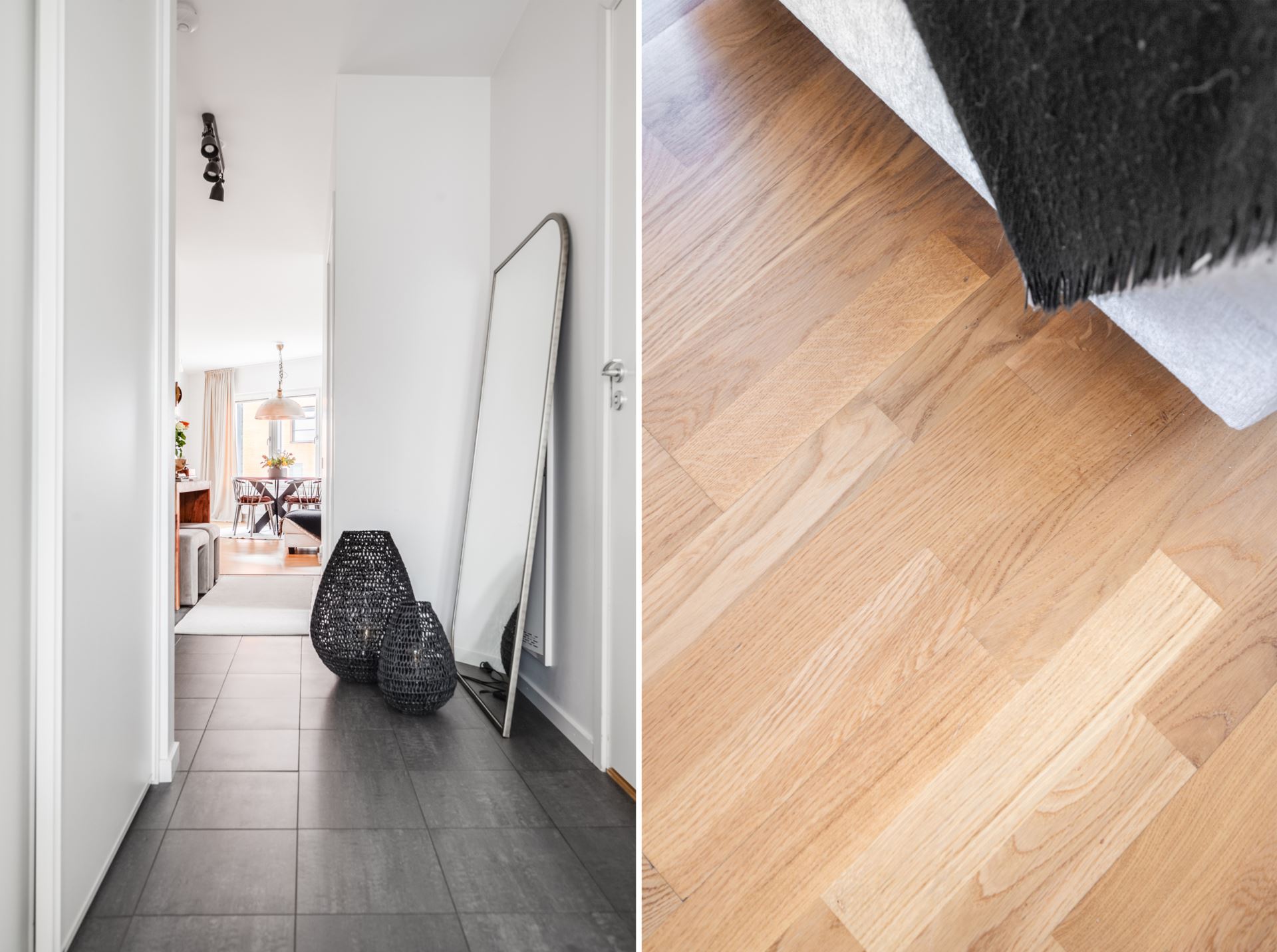 Vi tar hissen till tredje där vi välkomnas in till denna optimalt planerade gaveltrea. Entrégolvet pryds av mörka klinkers, både snyggt och praktiskt. Vidare övergår golvet i trestavs ekparkett tillsammans med vita släta väggar som återfinns i resterande av bostaden. I hallen finns på höger sida dessutom gott om plats till förvaring bakom skjutdörrsgarderober samt ytterligare hallmöbel.