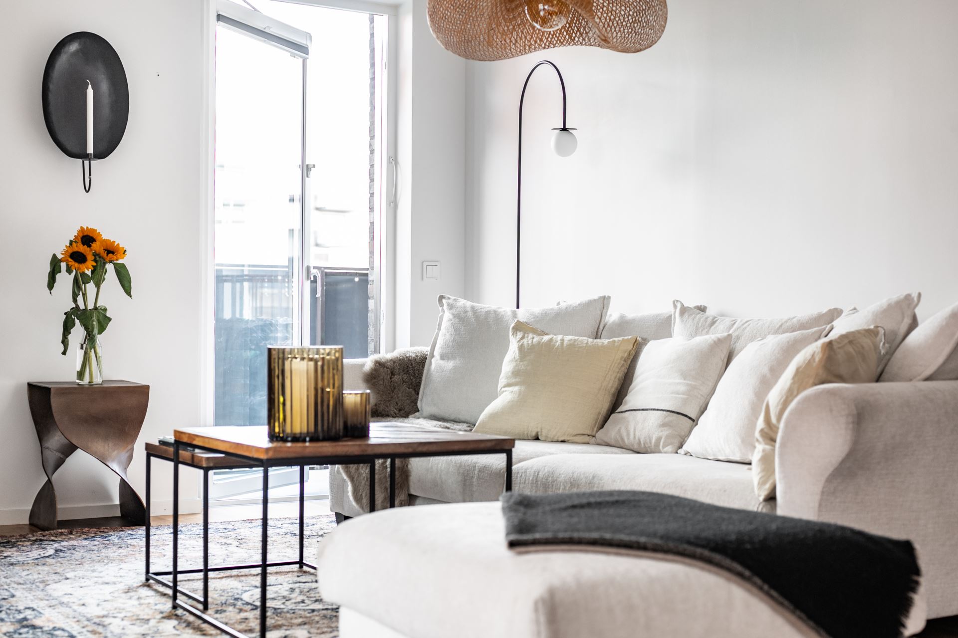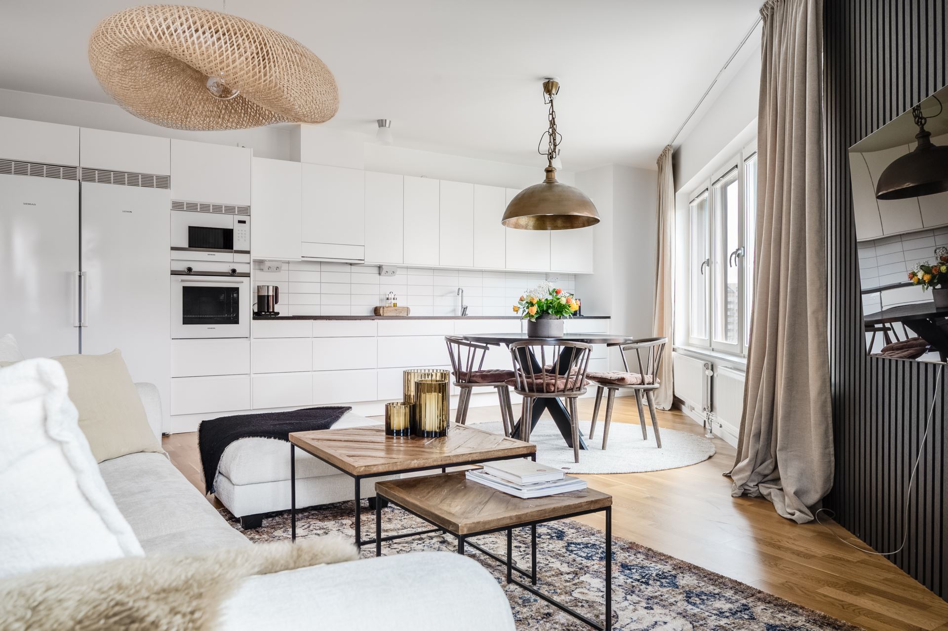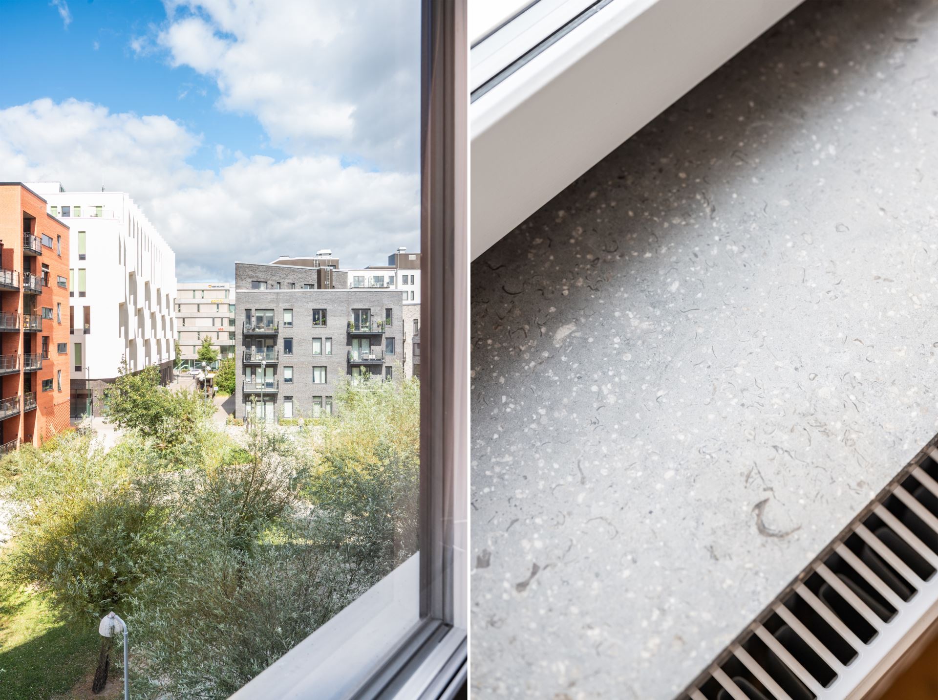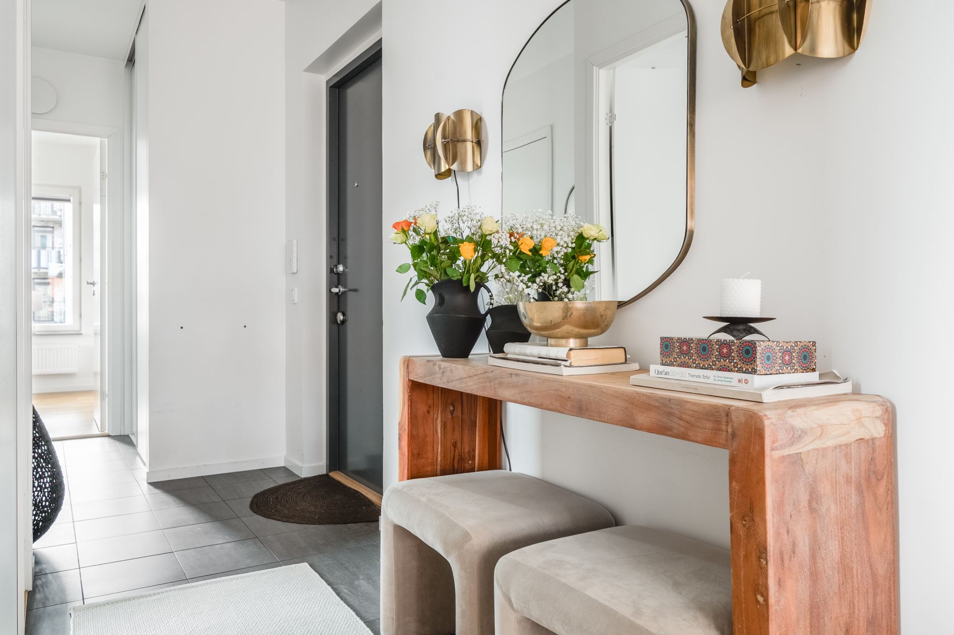 Vi tar hissen till tredje där vi välkomnas in till denna optimalt planerade gaveltrea. Entrégolvet pryds av mörka klinkers, både snyggt och praktiskt. Vidare övergår golvet i trestavs ekparkett tillsammans med vita släta väggar som återfinns i resterande av bostaden. I hallen finns på höger sida dessutom gott om plats till förvaring bakom skjutdörrsgarderober samt ytterligare hallmöbel.