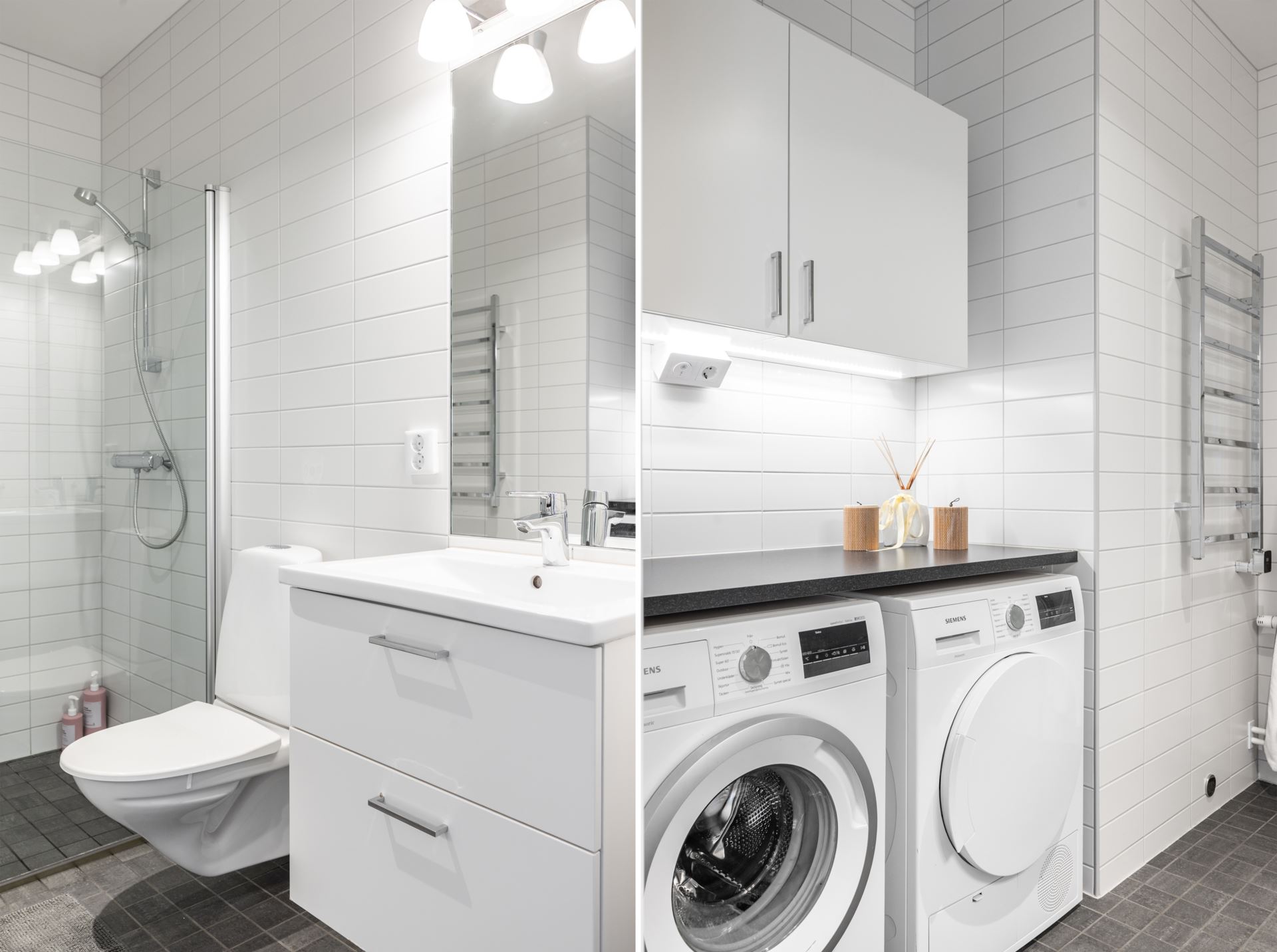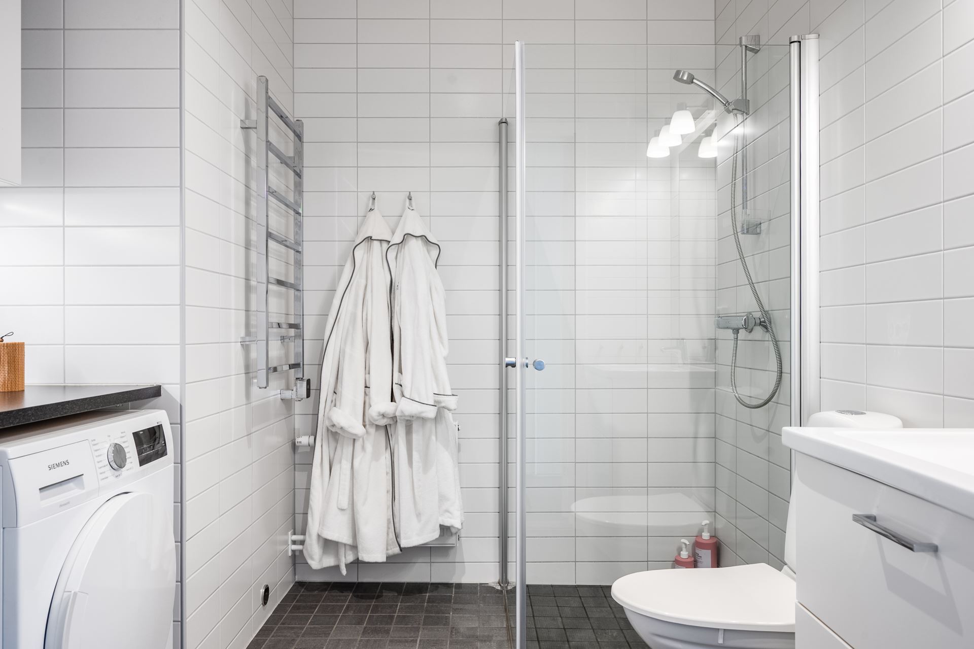 Helkaklat badrum med vitt kakel på väggarna tillsammans med mörkare klinkers på golv. Badrummet är utrustat med wc, handfat med kommod, dusch bakom glasvägg, handdukstork samt tvättmaskin och torktumlare (Siemens). Ytterligare förvaring och arbetsytor finns ovanför tvätt,- och tork.